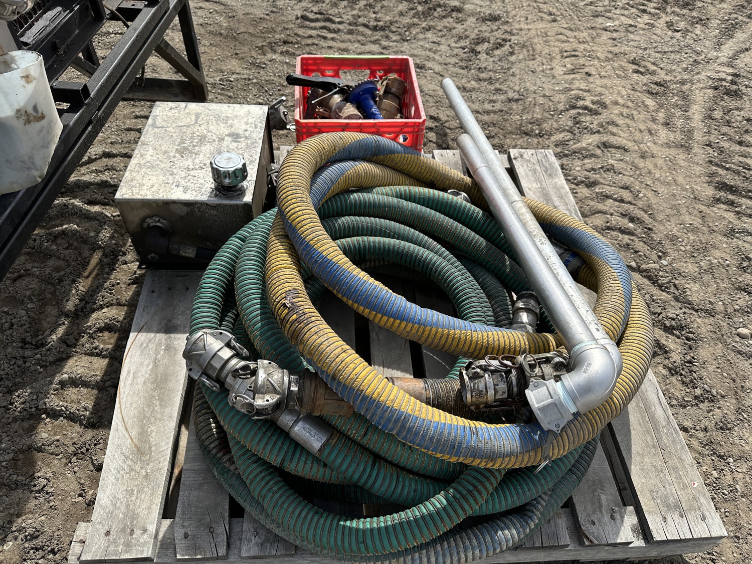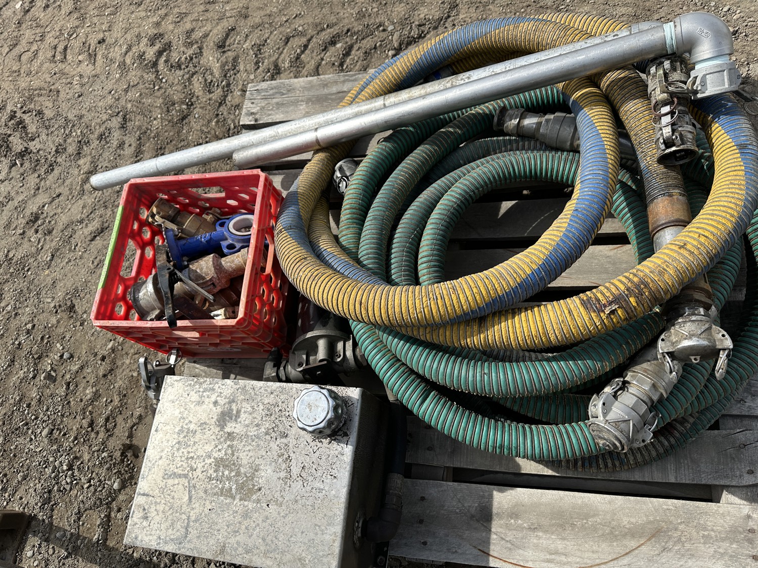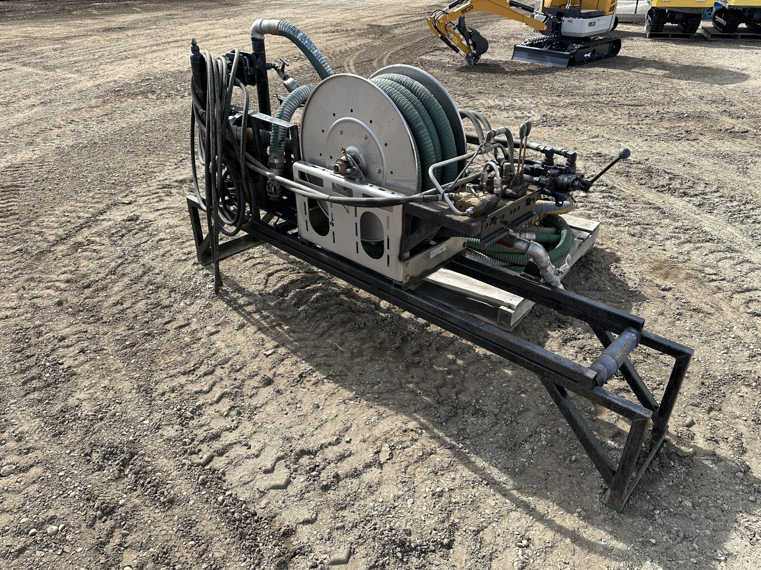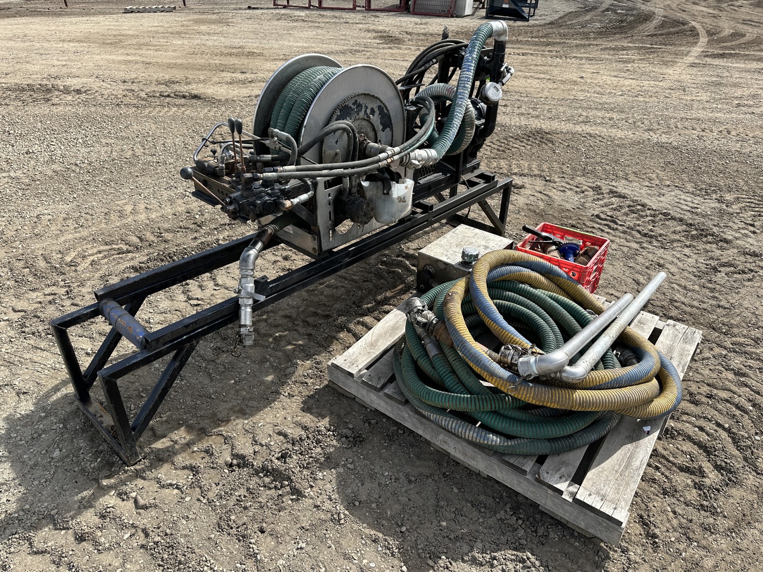 hydraulic pump with Hannay reel, 2 inch TNE with steel gears, hydraulic pump and tank with hoses, (2) 20 ft x 1-1/2 inch hoses, (1) 10 ft x 2 inch hose, assorted camlock fittings, (2) 1-1/2 inch barrel stingers