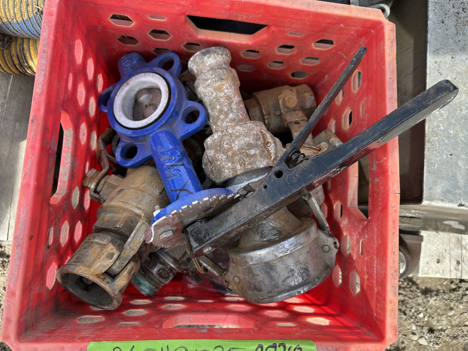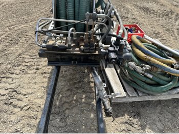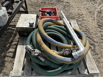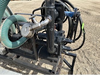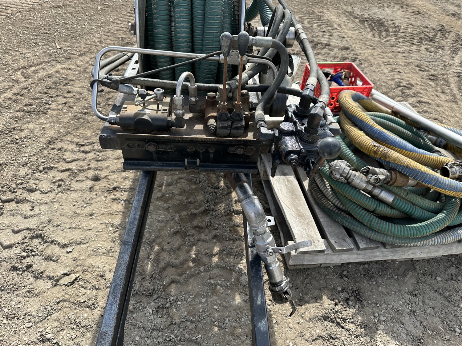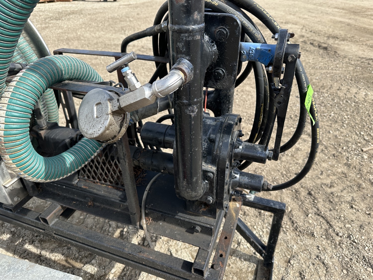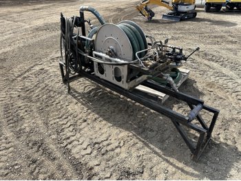 hydraulic pump with Hannay reel, 2 inch TNE with steel gears, hydraulic pump and tank with hoses, (2) 20 ft x 1-1/2 inch hoses, (1) 10 ft x 2 inch hose, assorted camlock fittings, (2) 1-1/2 inch barrel stingers
