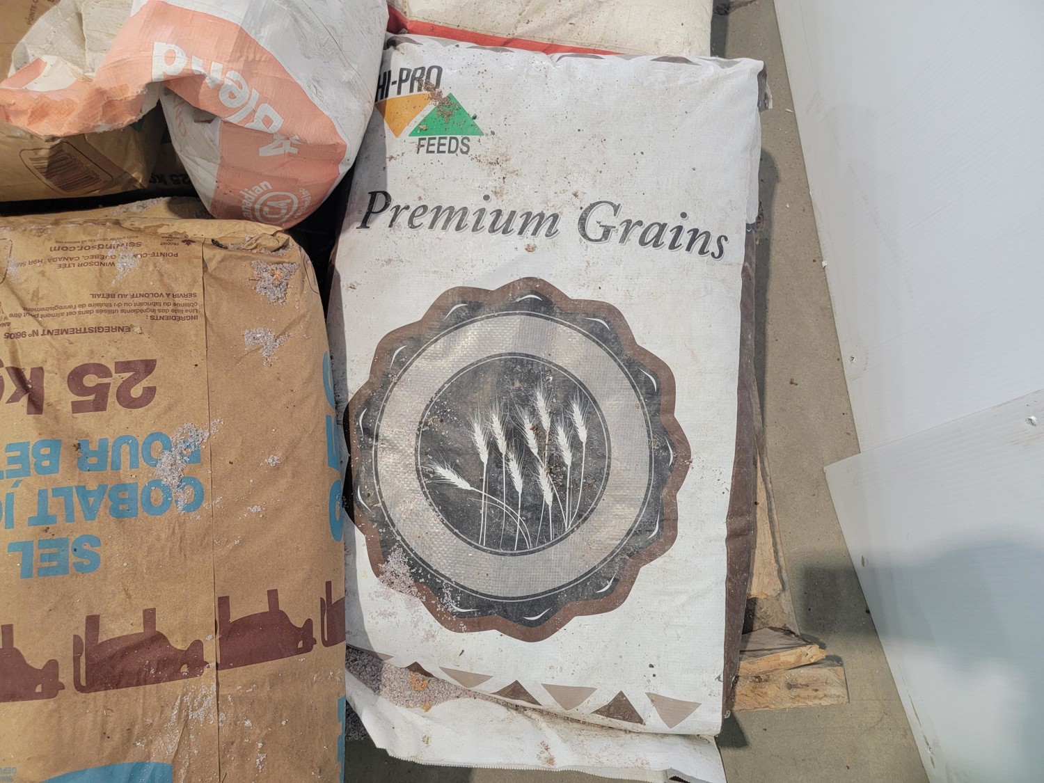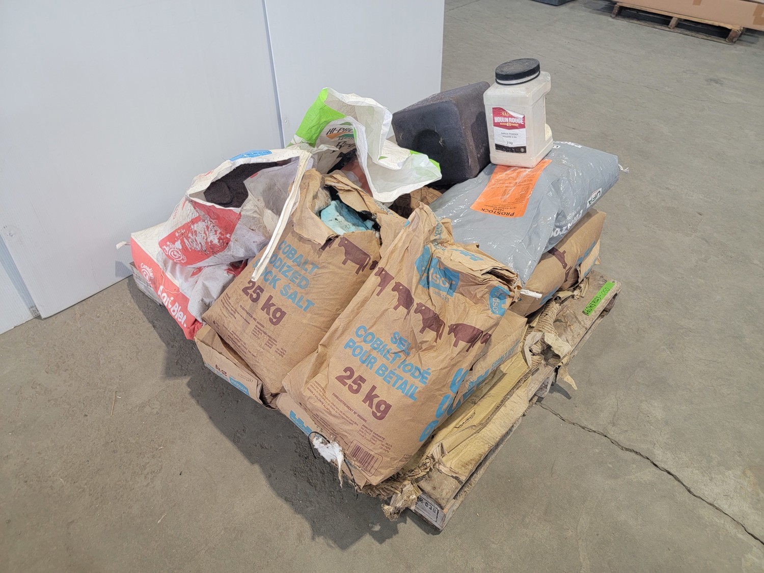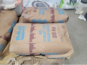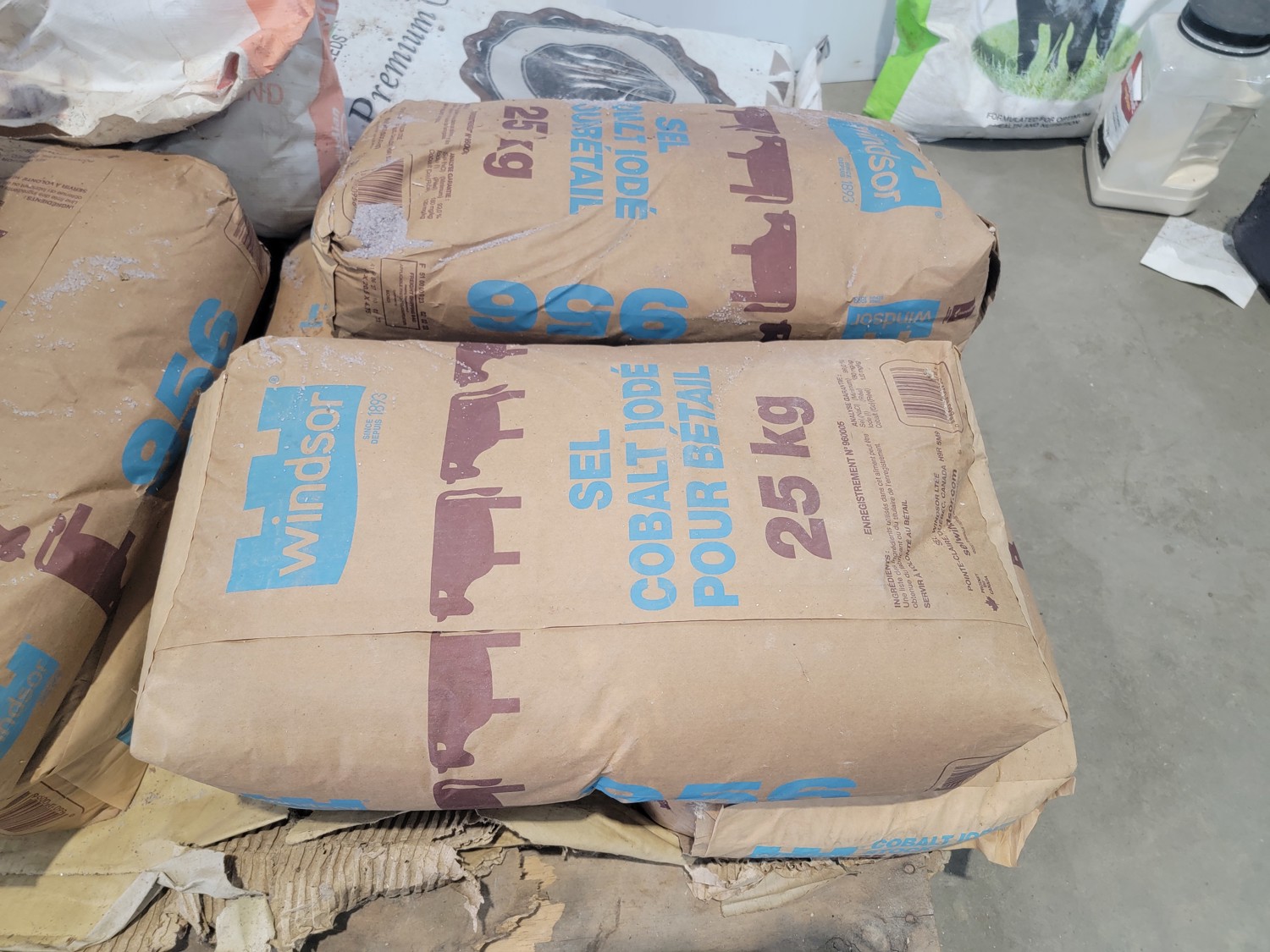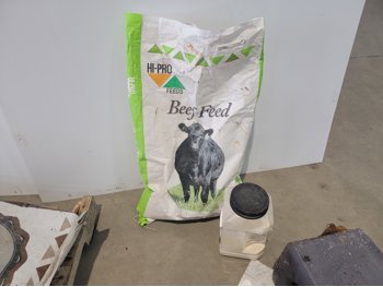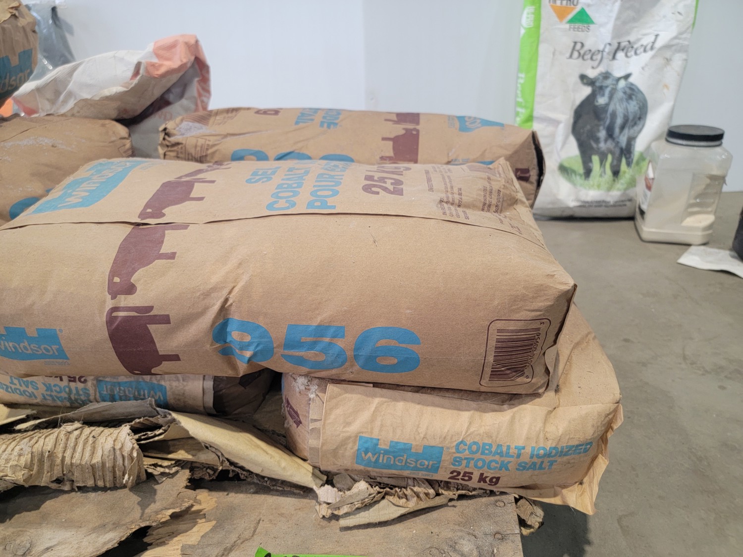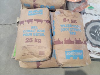 (7) 25 kg Windsor cobalt iodized stock salt, (2) Windsor partial bags of cobalt iodized stock salt, (1) 20 kg bag of UFA Prostock 16:16 range mineral for cattle, (1) Hi-Pro premium grains, (1) Hi-Pro partial bag of beef feed, (2) Canadian Agri-blend cobalt iodized stock salt