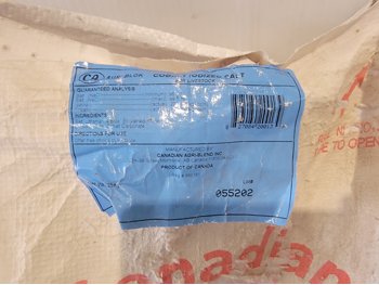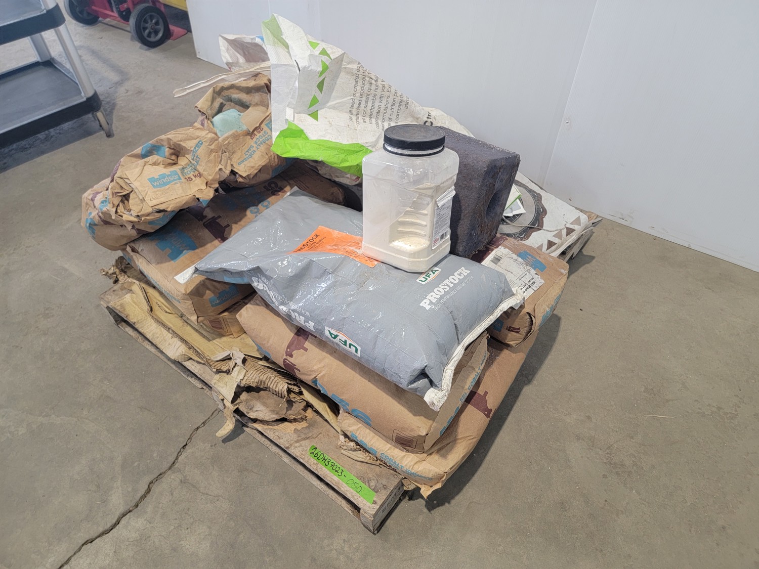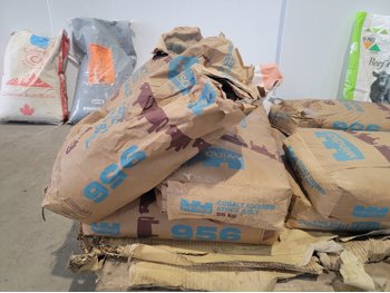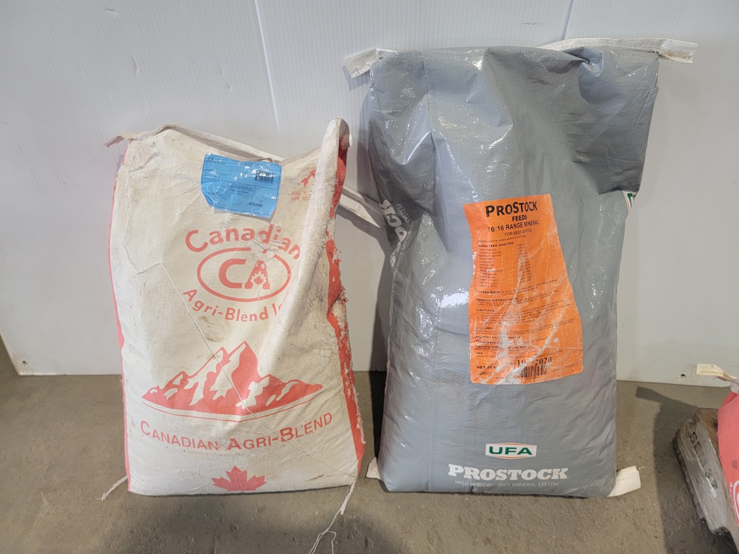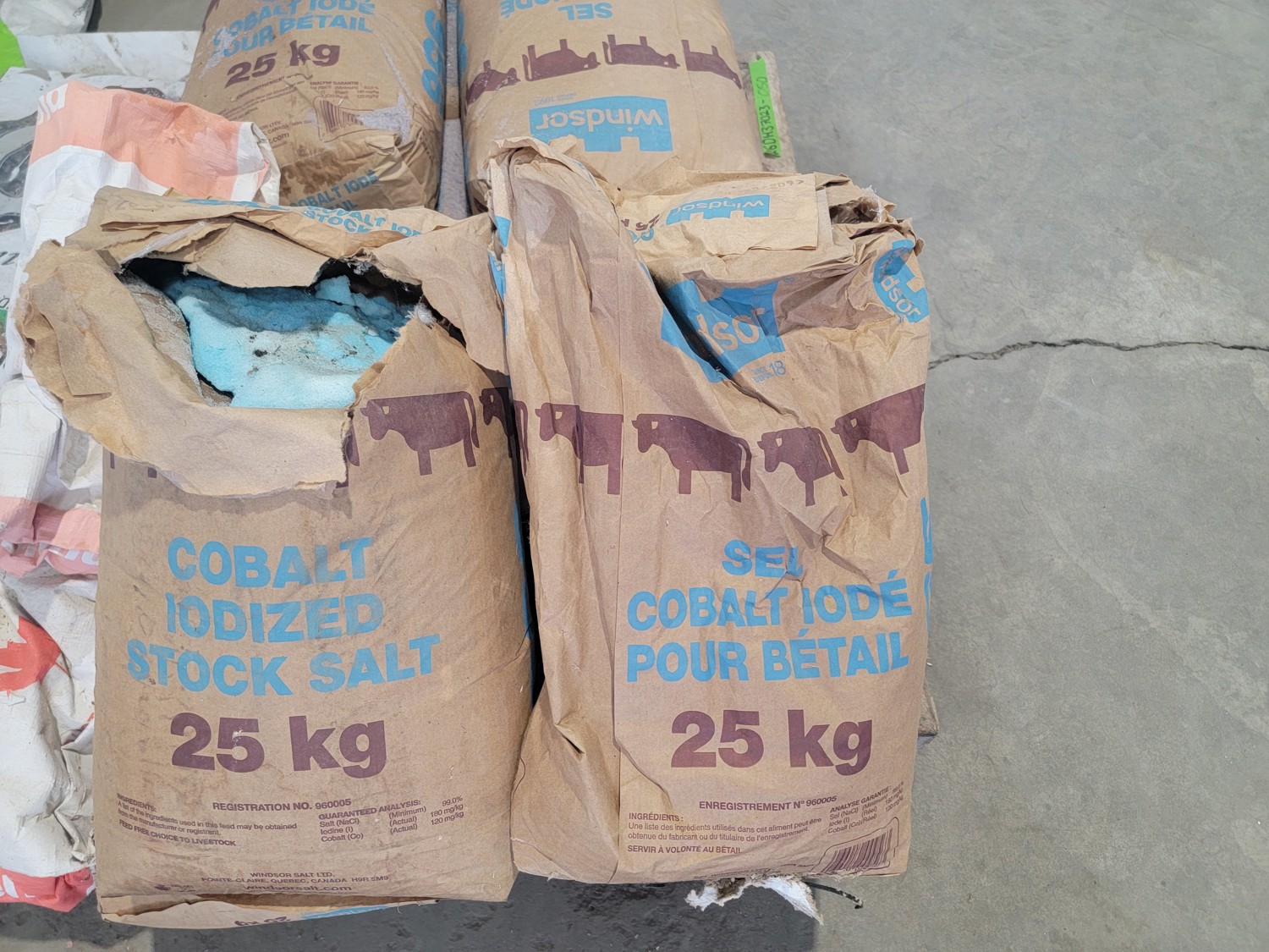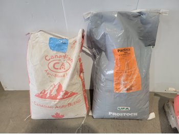 (7) 25 kg Windsor cobalt iodized stock salt, (2) Windsor partial bags of cobalt iodized stock salt, (1) 20 kg bag of UFA Prostock 16:16 range mineral for cattle, (1) Hi-Pro premium grains, (1) Hi-Pro partial bag of beef feed, (2) Canadian Agri-blend cobalt iodized stock salt