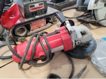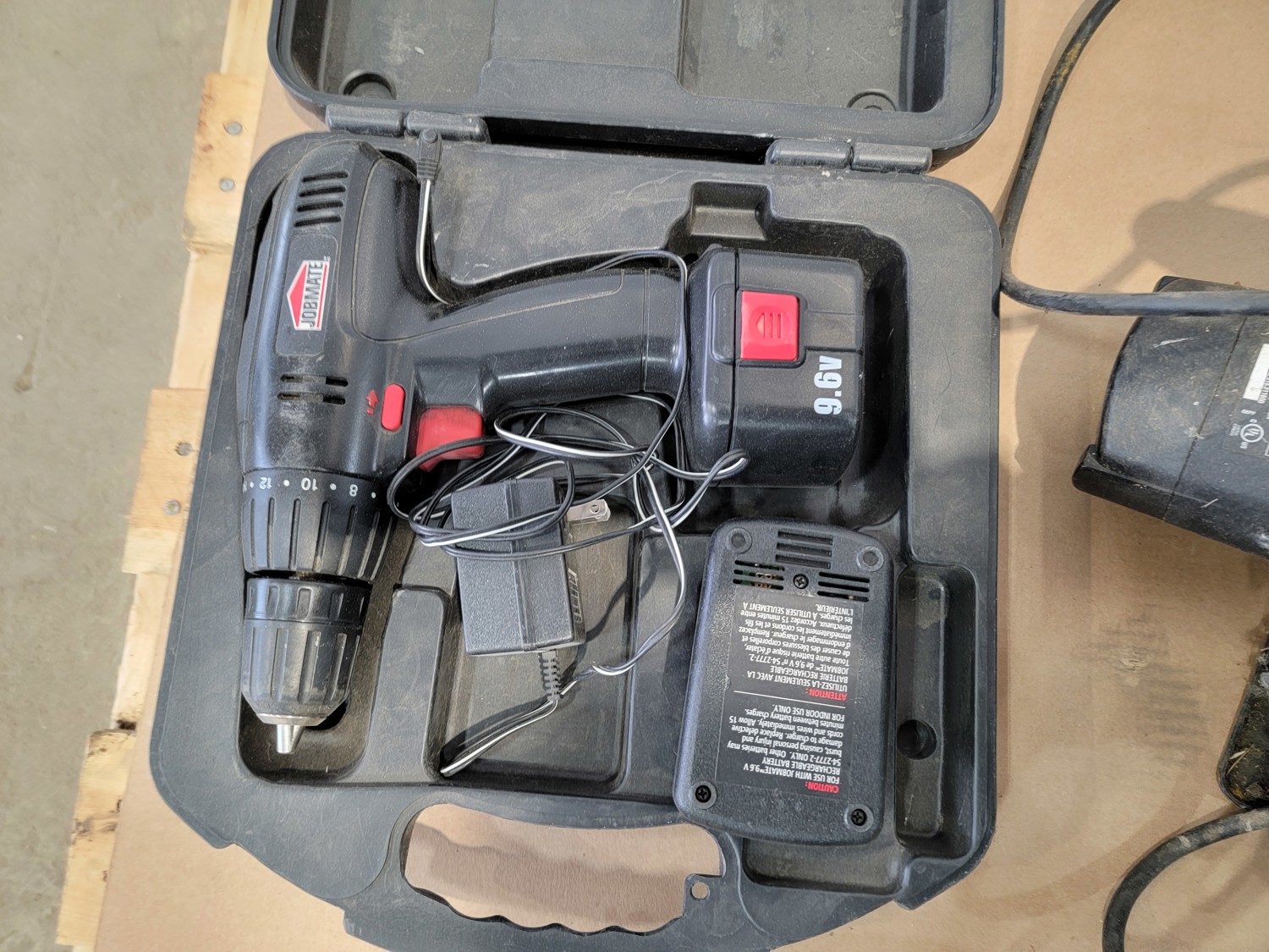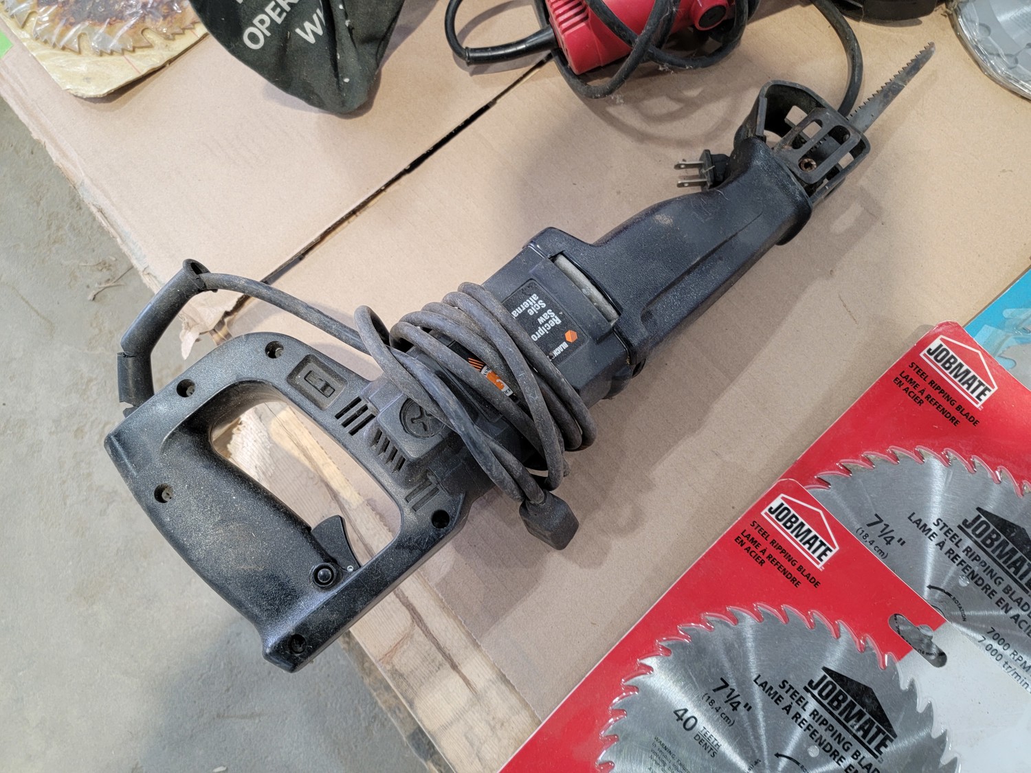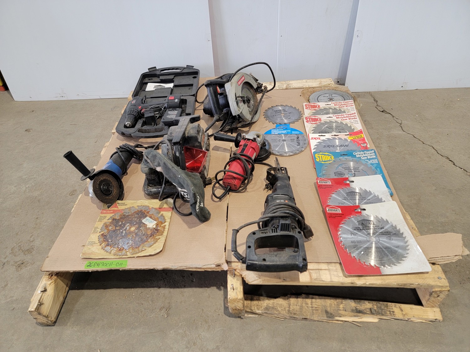 Black & Decker reciprocating saw, angle grinders, Craftsman 7-1/4 inch circular saw, Craftsman belt sander, Jobmate 9.6V drill kit