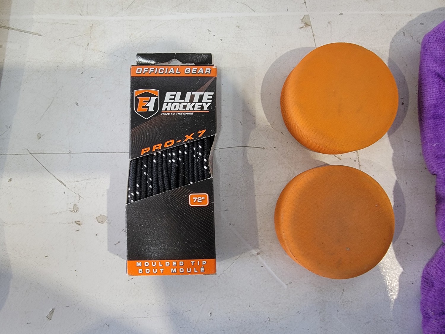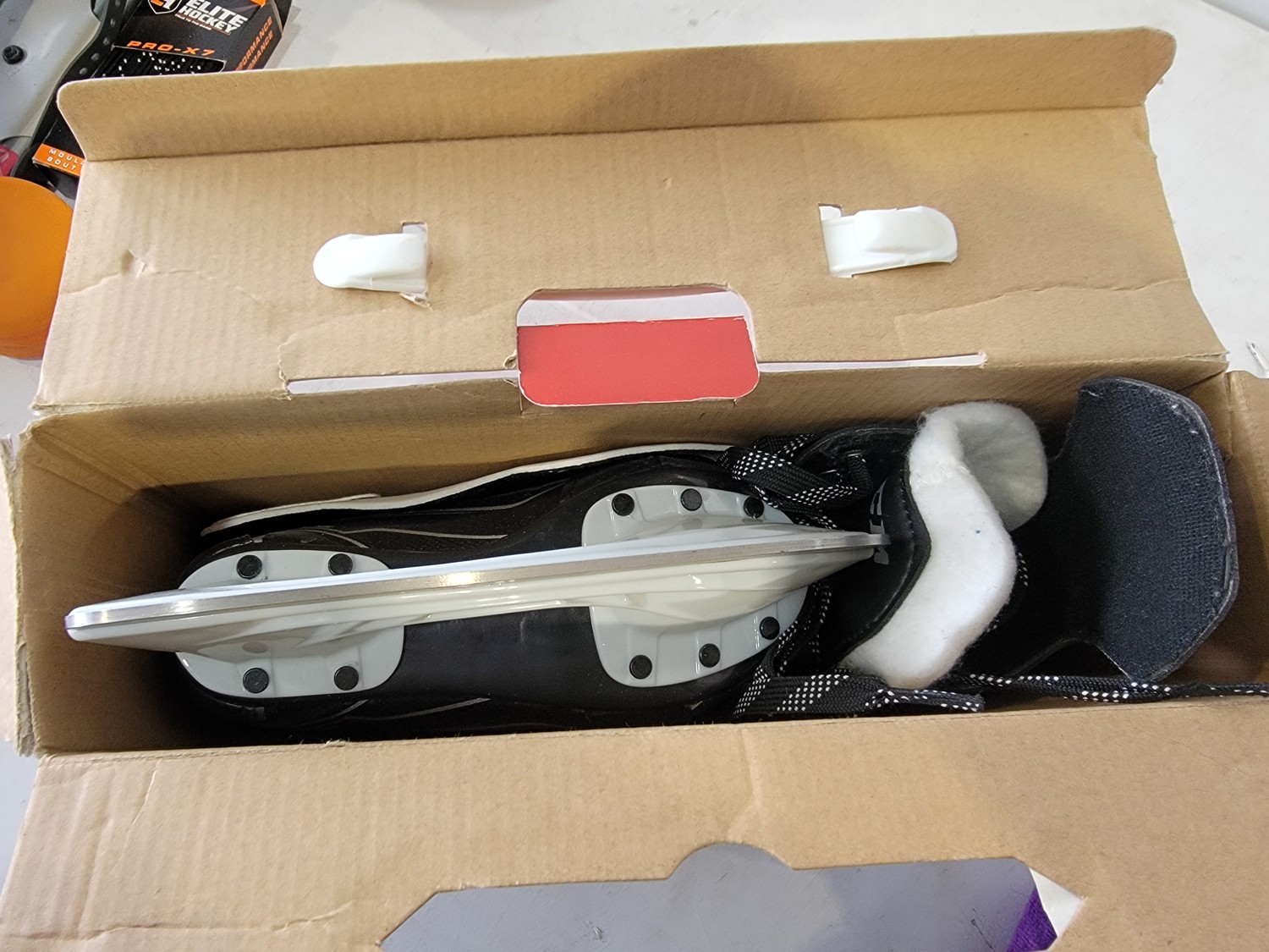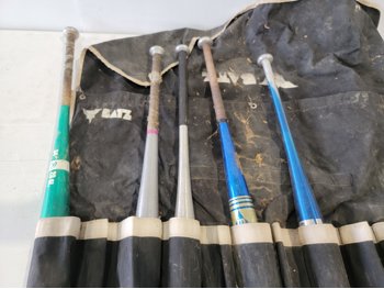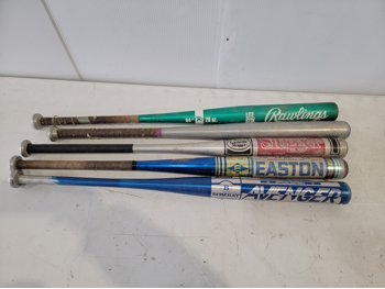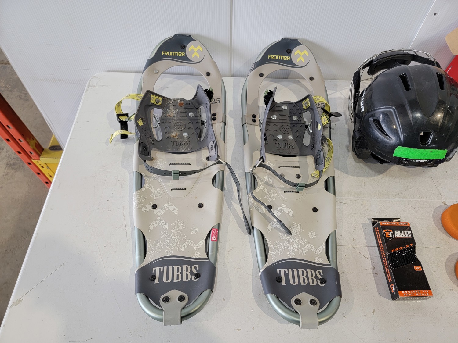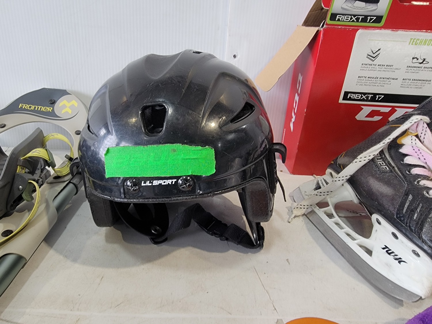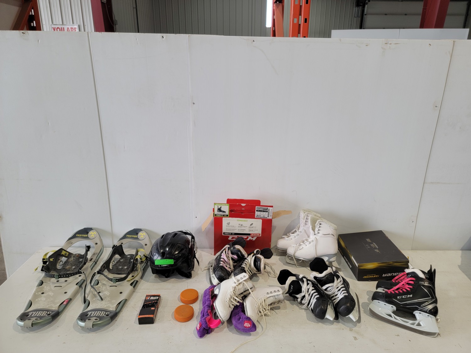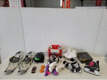 snowshoes, helmet, (7) pairs of skates, (5) bats, set of golf clubs