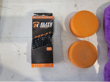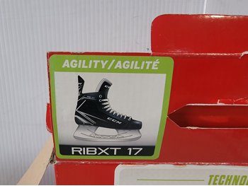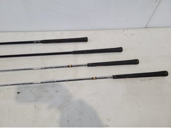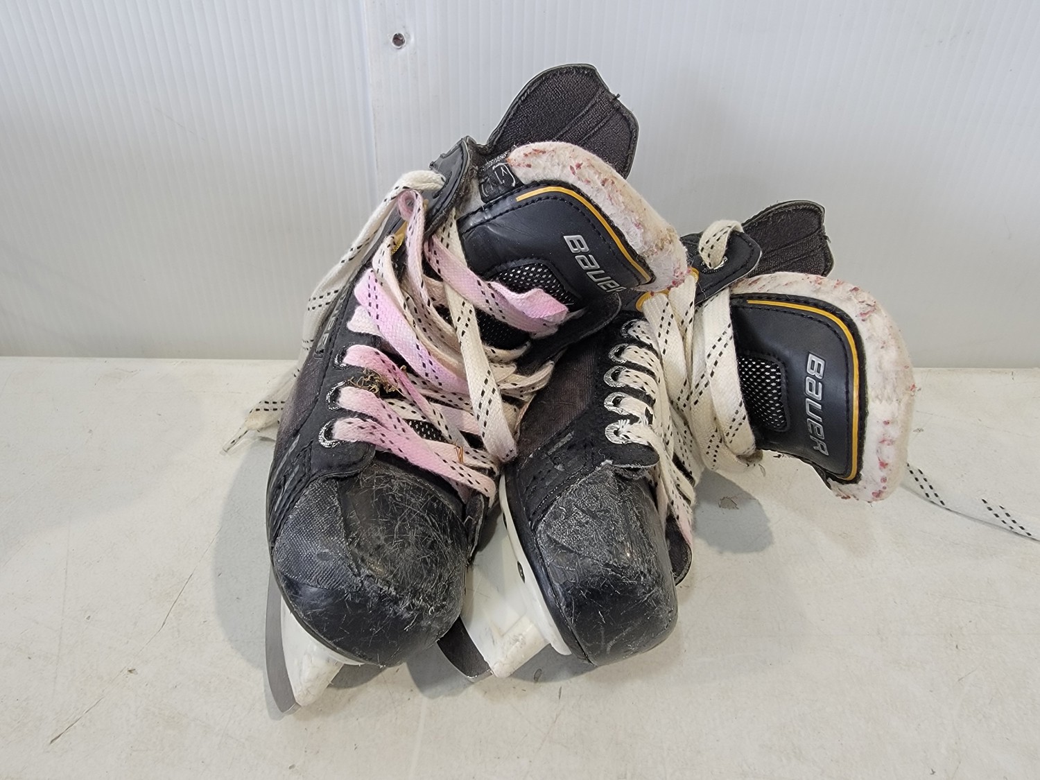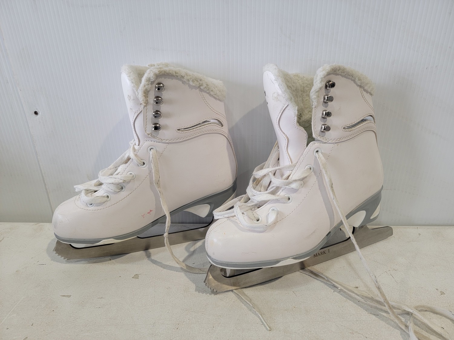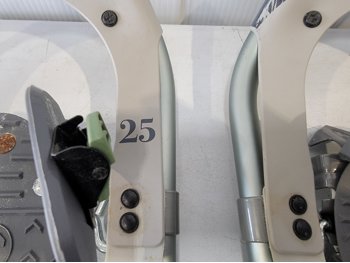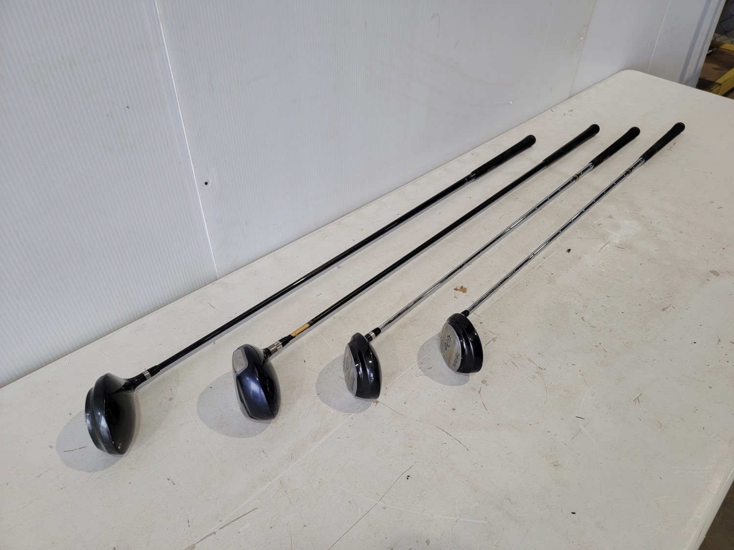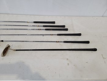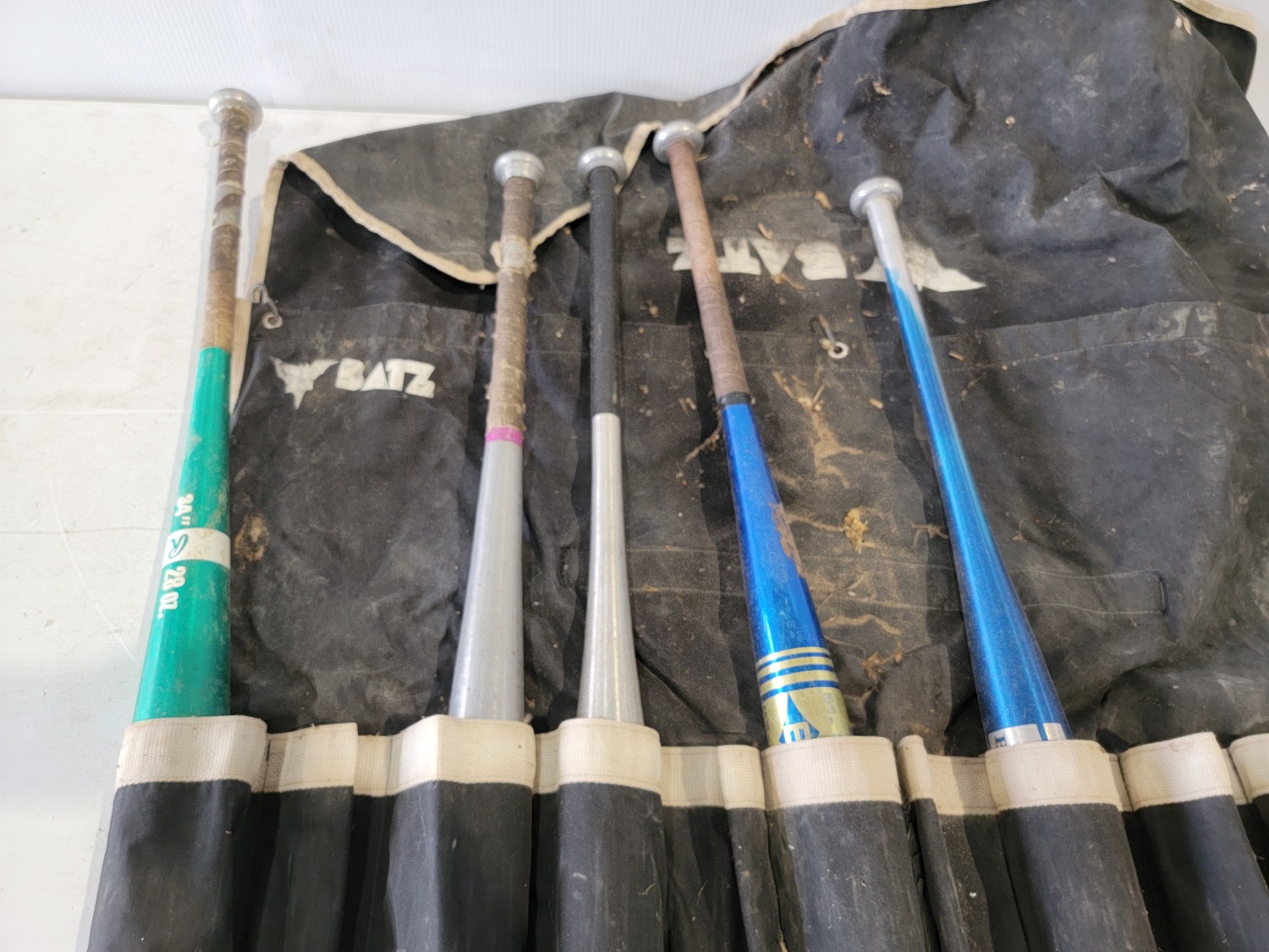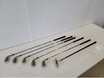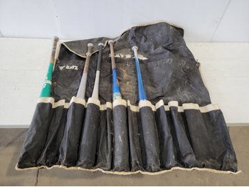 snowshoes, helmet, (7) pairs of skates, (5) bats, set of golf clubs
