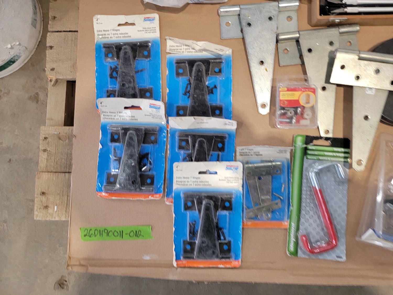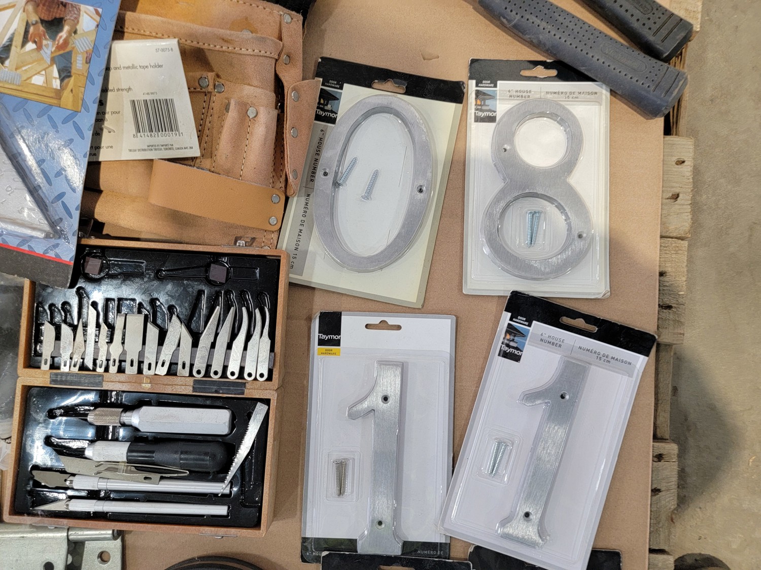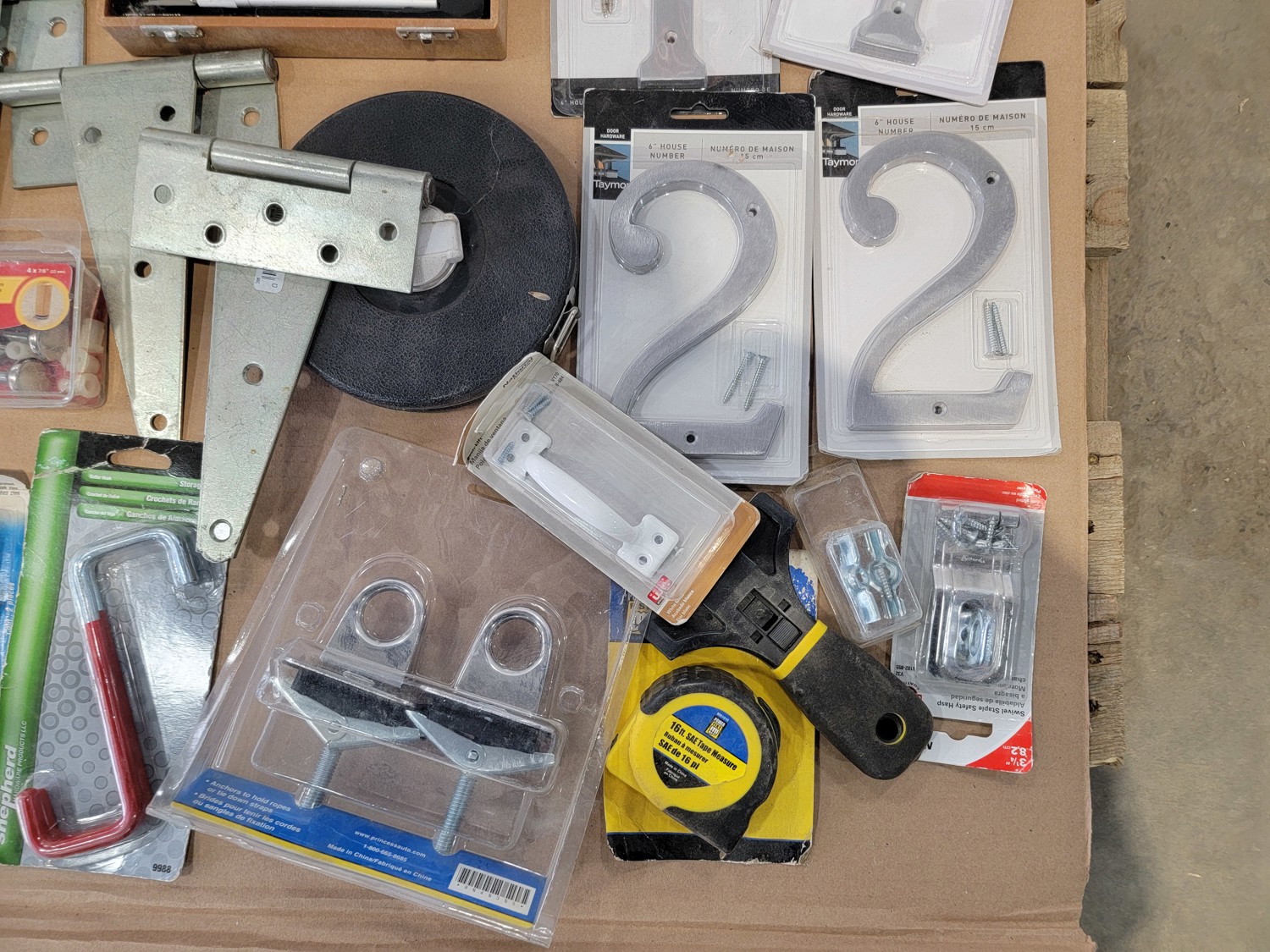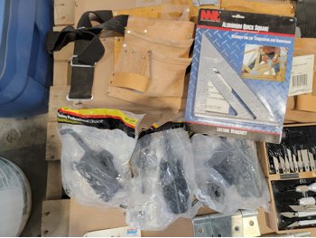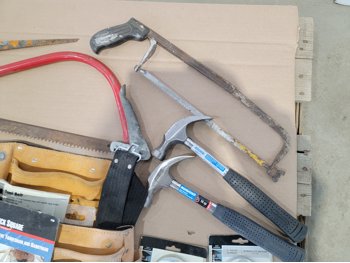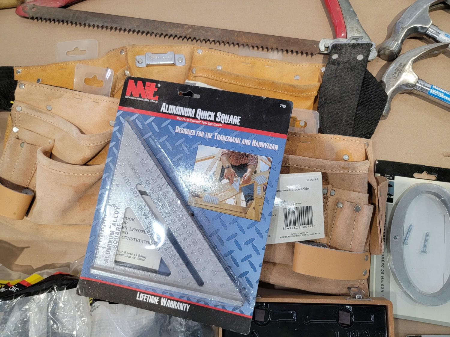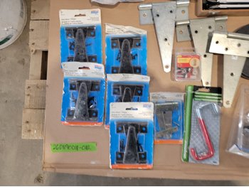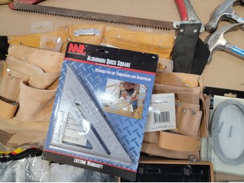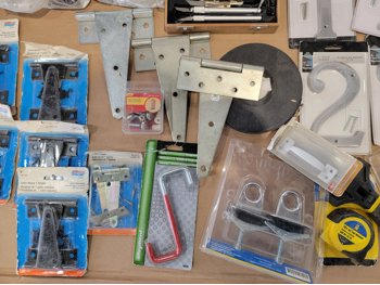 hinges, 6 inch address numbers, hand saws, hammers, tool belt, aluminum quick square, gate latches