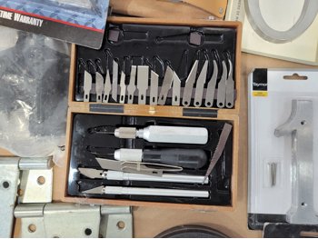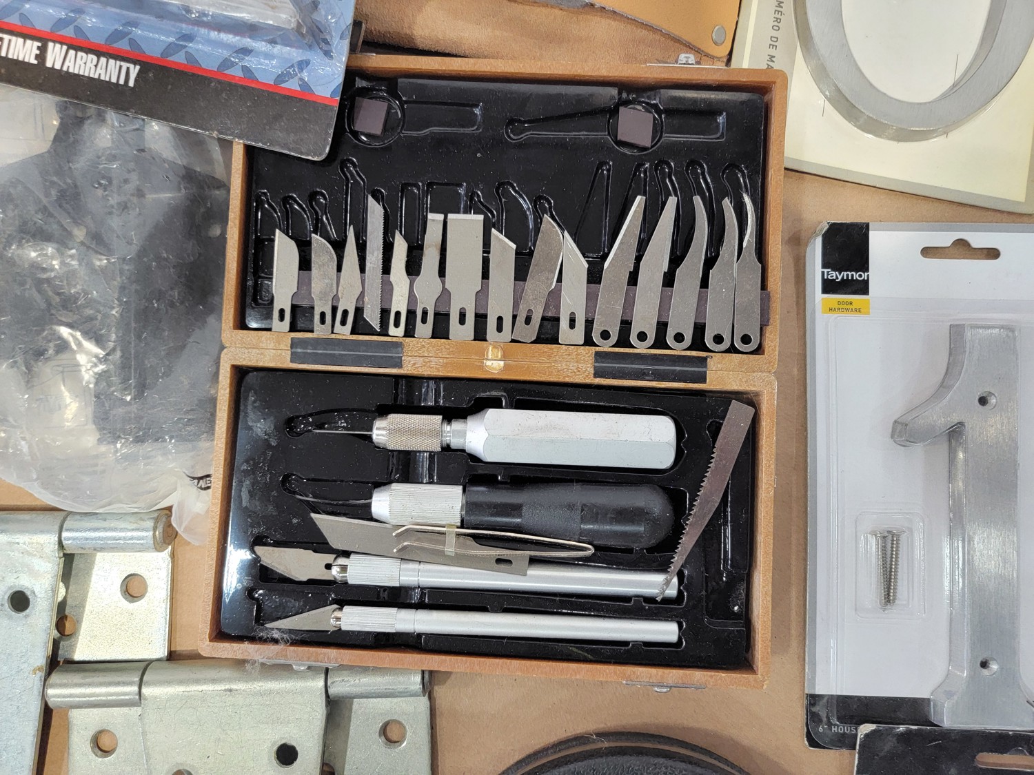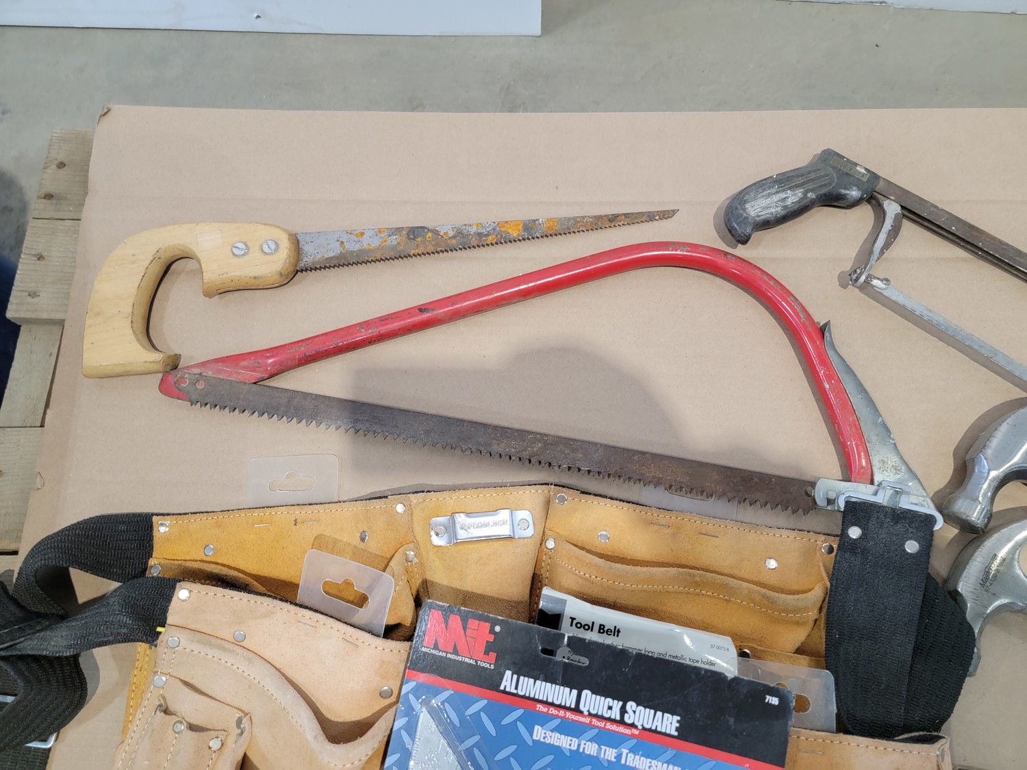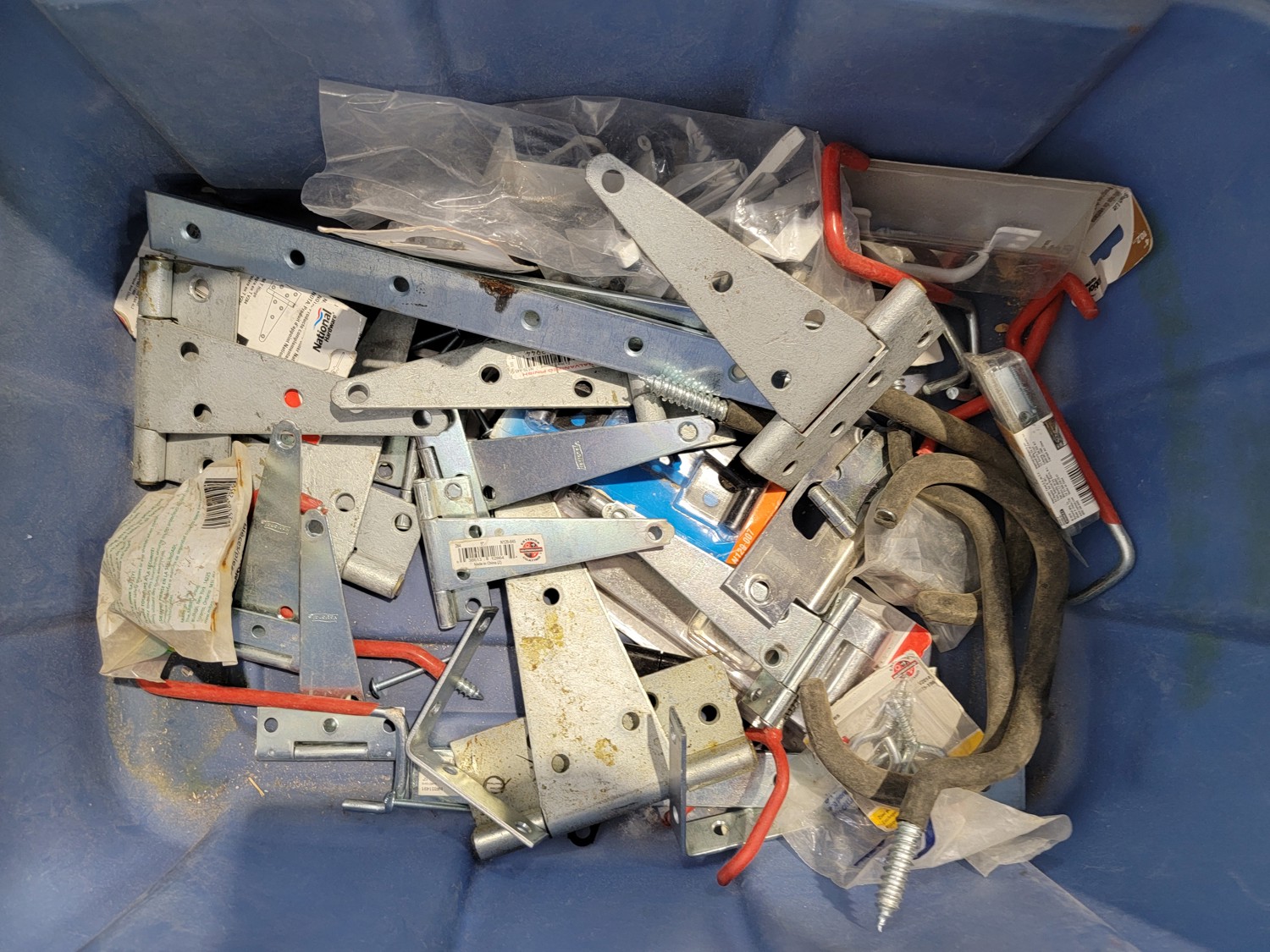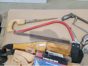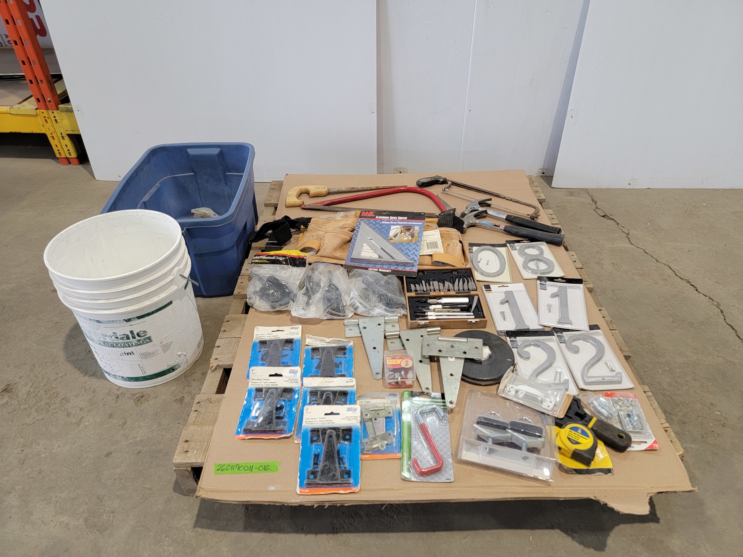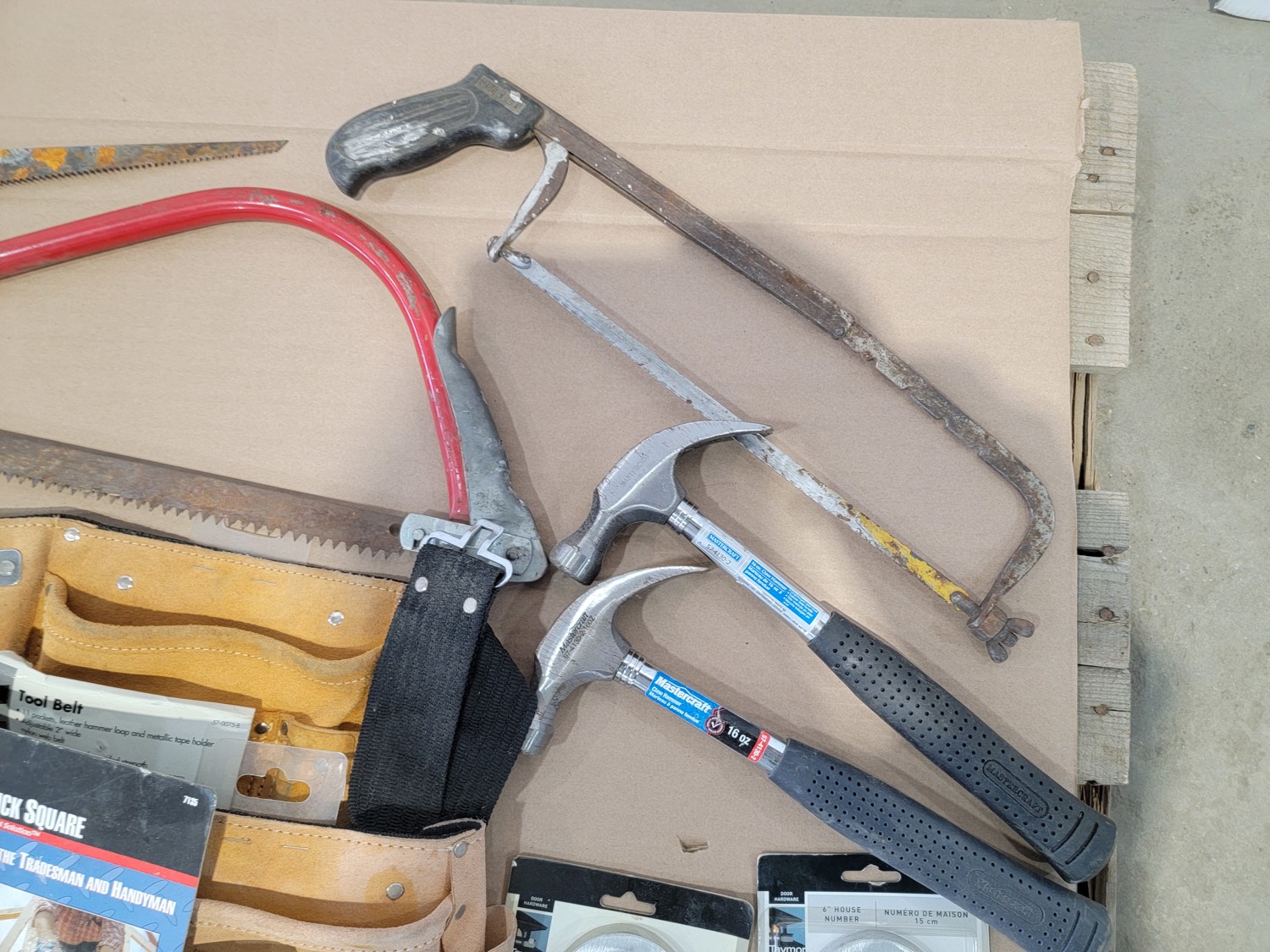 hinges, 6 inch address numbers, hand saws, hammers, tool belt, aluminum quick square, gate latches