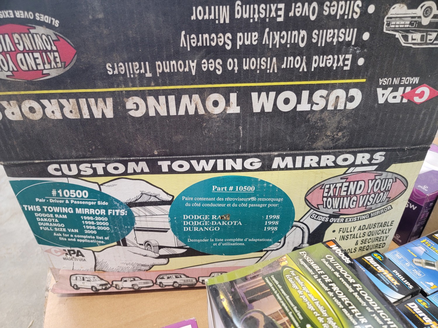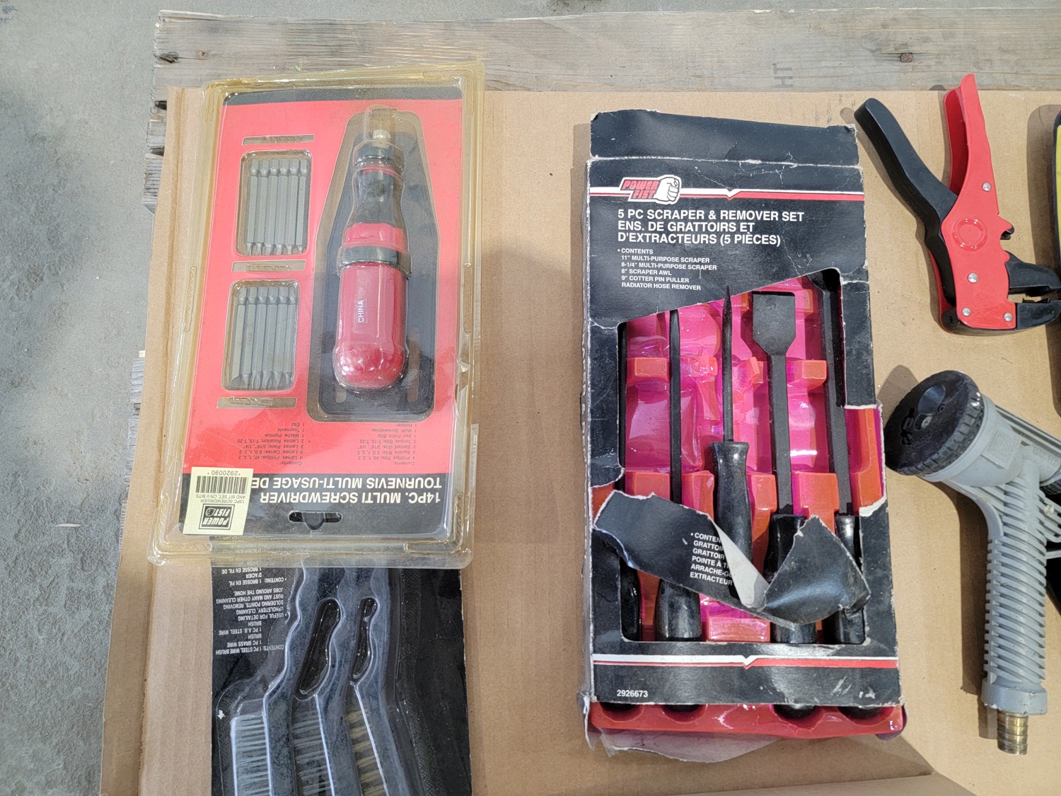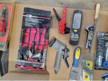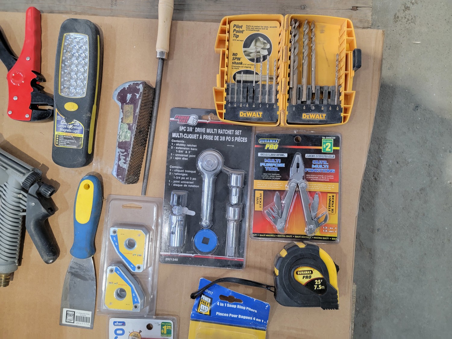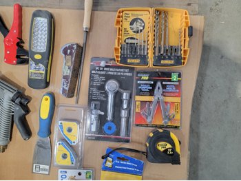 drill bits, files, magnetic light, 3/8 inch ratchet set, multi-purpose tool, snap ring pliers, scraper and remover set, multi screwdriver, wire brush set, custom towing mirrors