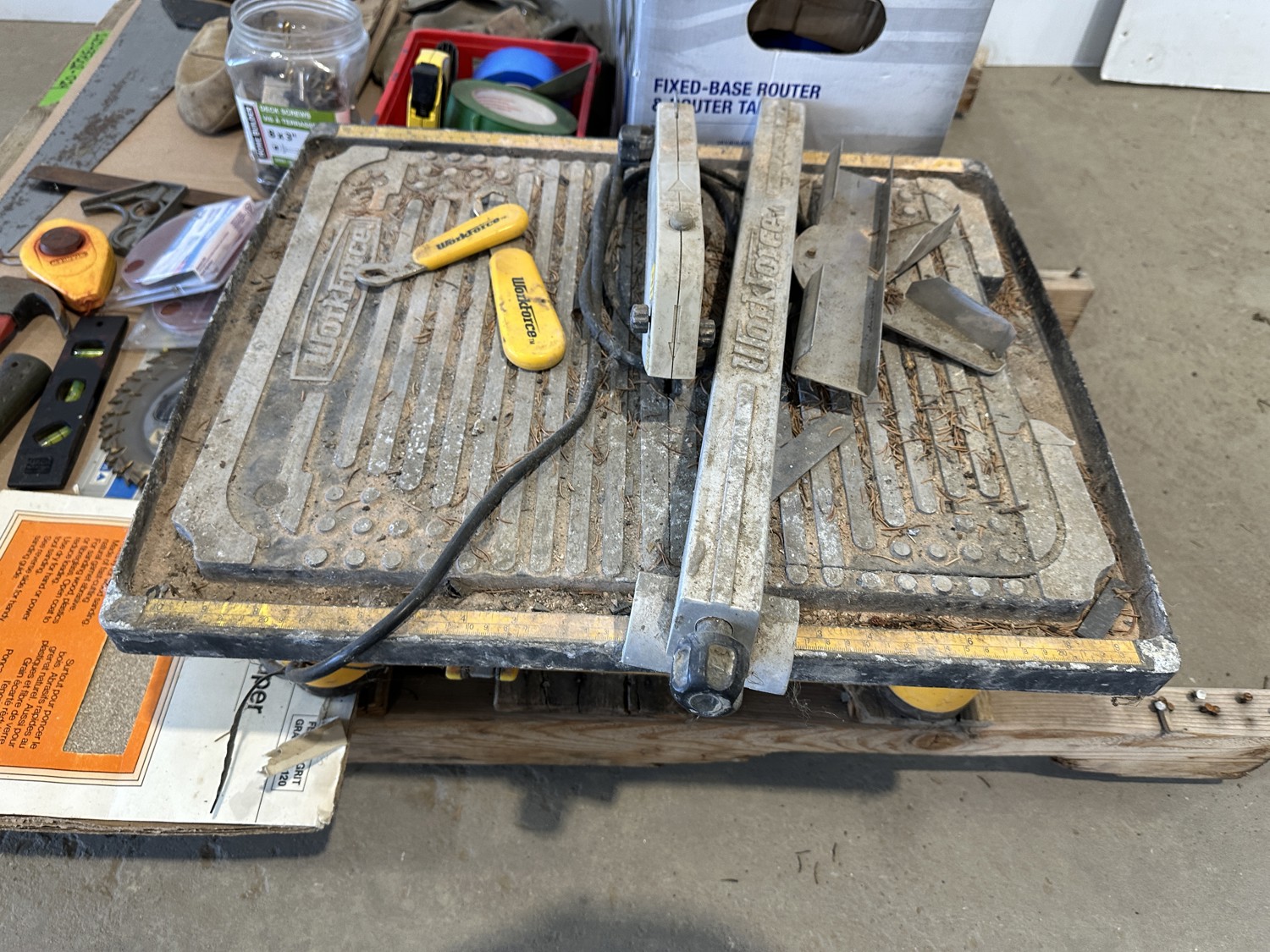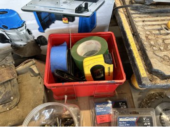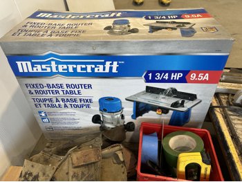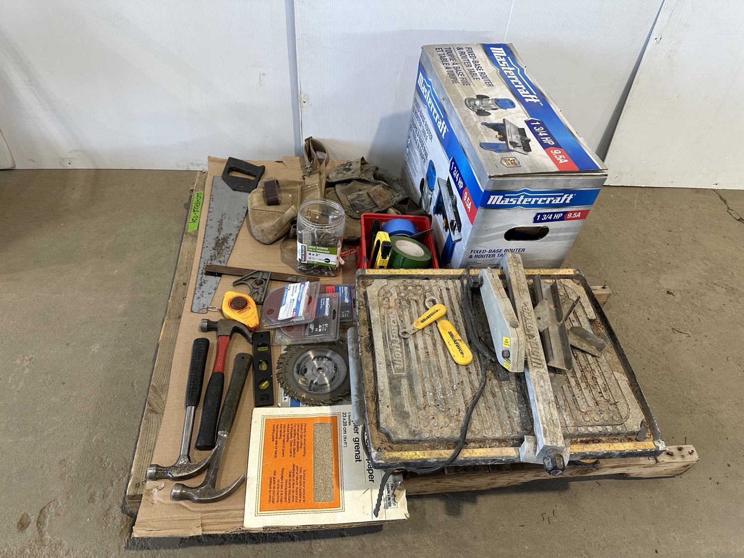 Workforce tile saw, Mastercraft 1-3/4 HP fixed base router and table, hand tools, bits, tool belts, blades