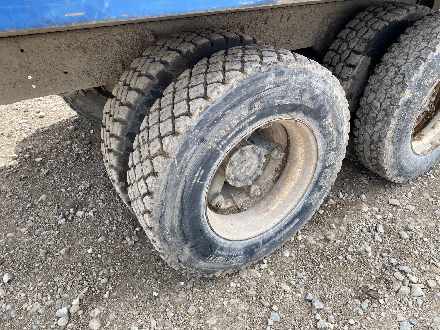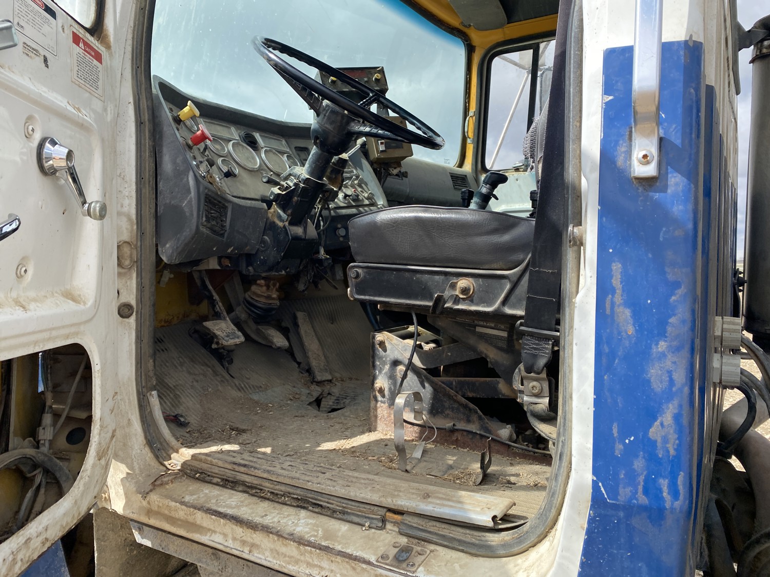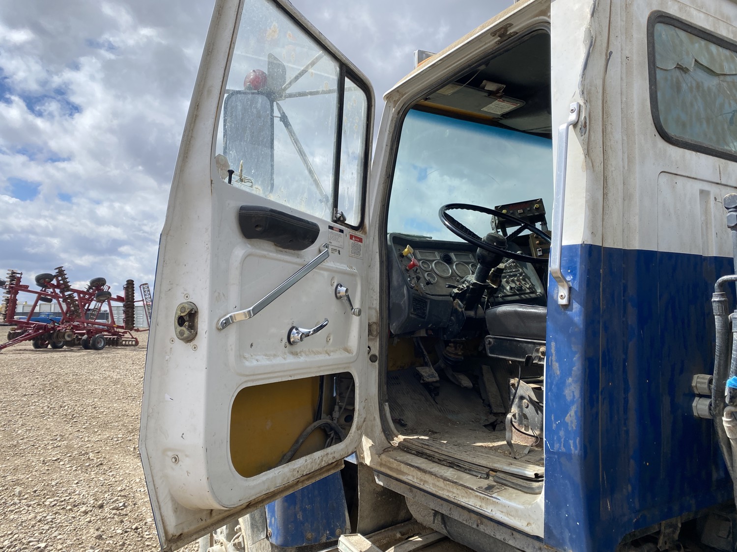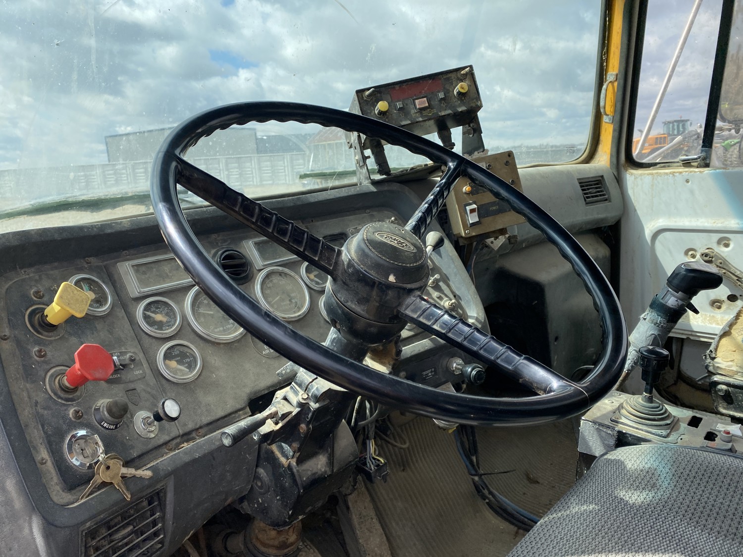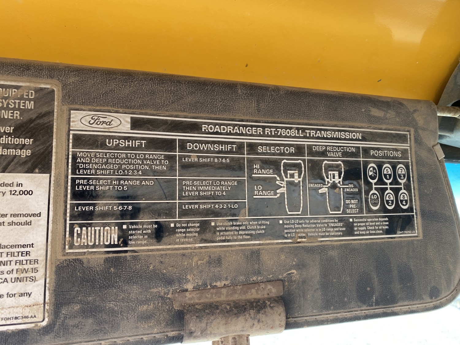 Ford 7.8 L 6 cylinder engine, RoadRanger 8LL manual transmission, 15 ft box, PTO pump, spring suspension, 16,000 lb front axle, 40,000 lb rear axles, diff lock, 222 inch WB, 315/80R22.5 front tires, 11R22.5 rear tires