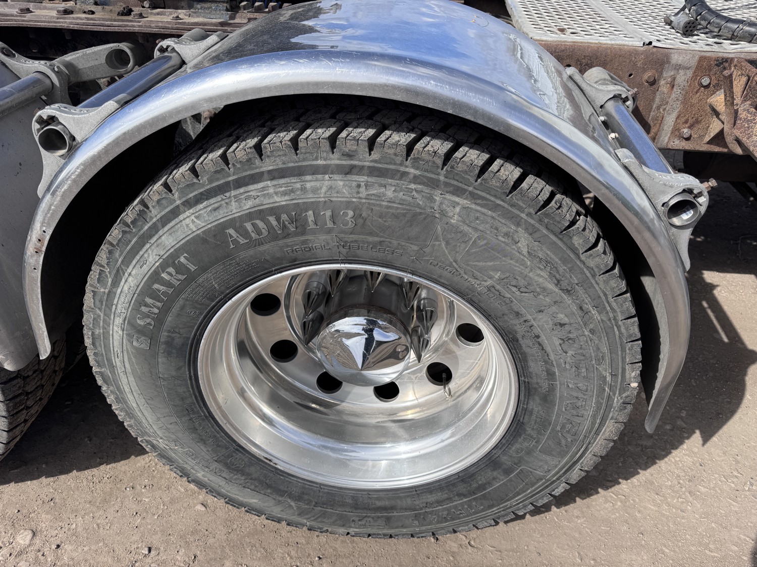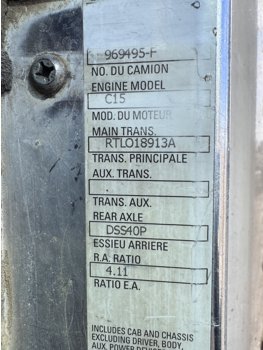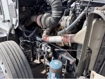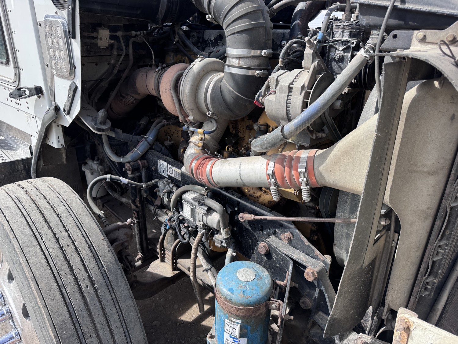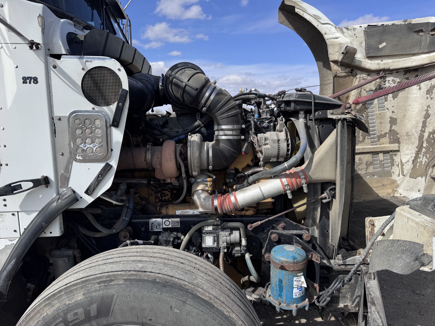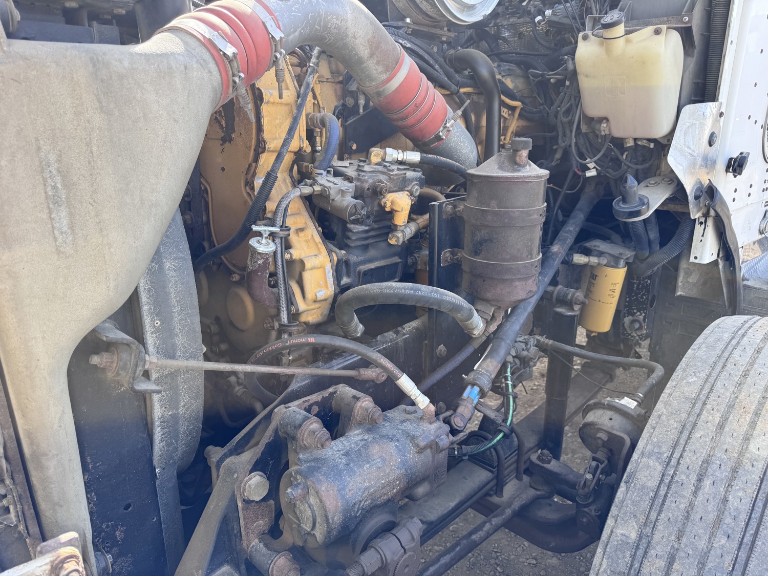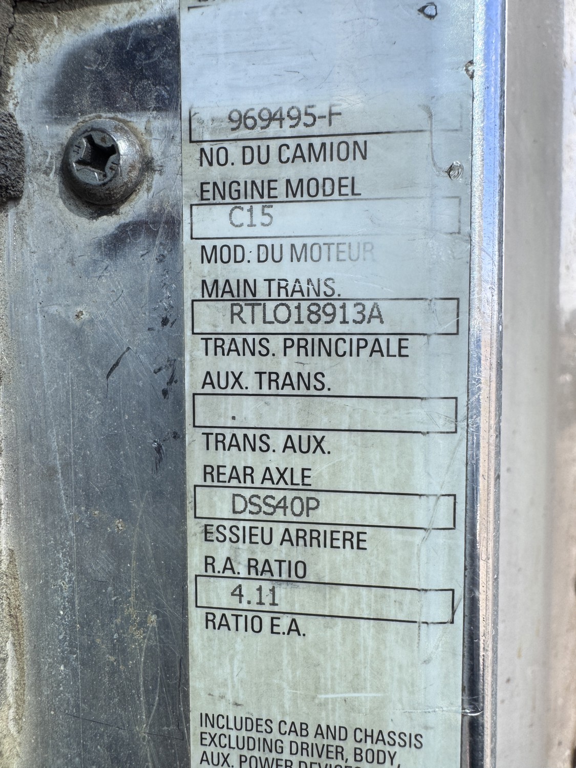 Caterpillar 6NZ C15 14.6 L L6 475 HP diesel engine, engine heater, engine brake, engine block heater, Eaton Fuller 18 speed manual transmission, mid rise 60 inch sleeper, A/C, cruise control, air ride driver seat, CB radio, stereo, air ride suspension, 12,000 lb front axle, 40,000 lb rear axles, full lockers, 4.11 ratio, 220 inch WB, Dss40p Super 40 rears , all aluminum wheels, 11R24.5 tires