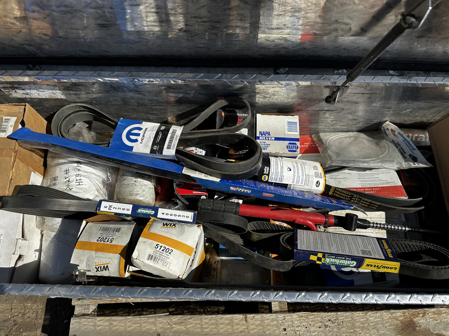 17 inch width, 12 inch height, includes miscellaneous oil filters, belts, spark plugs, miscellaneous parts