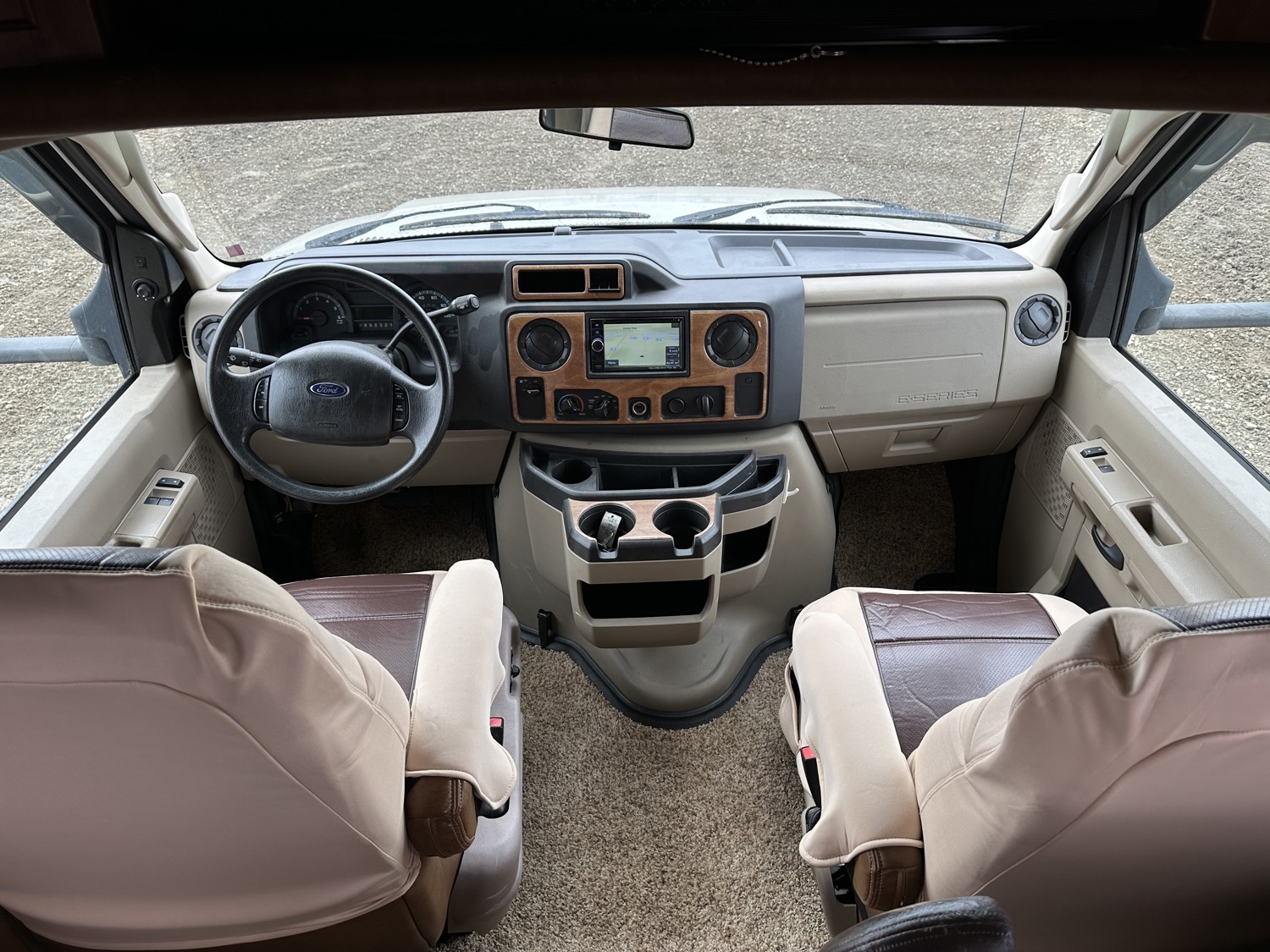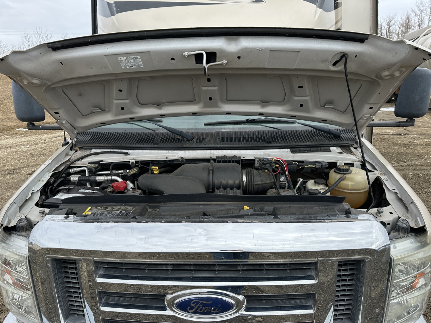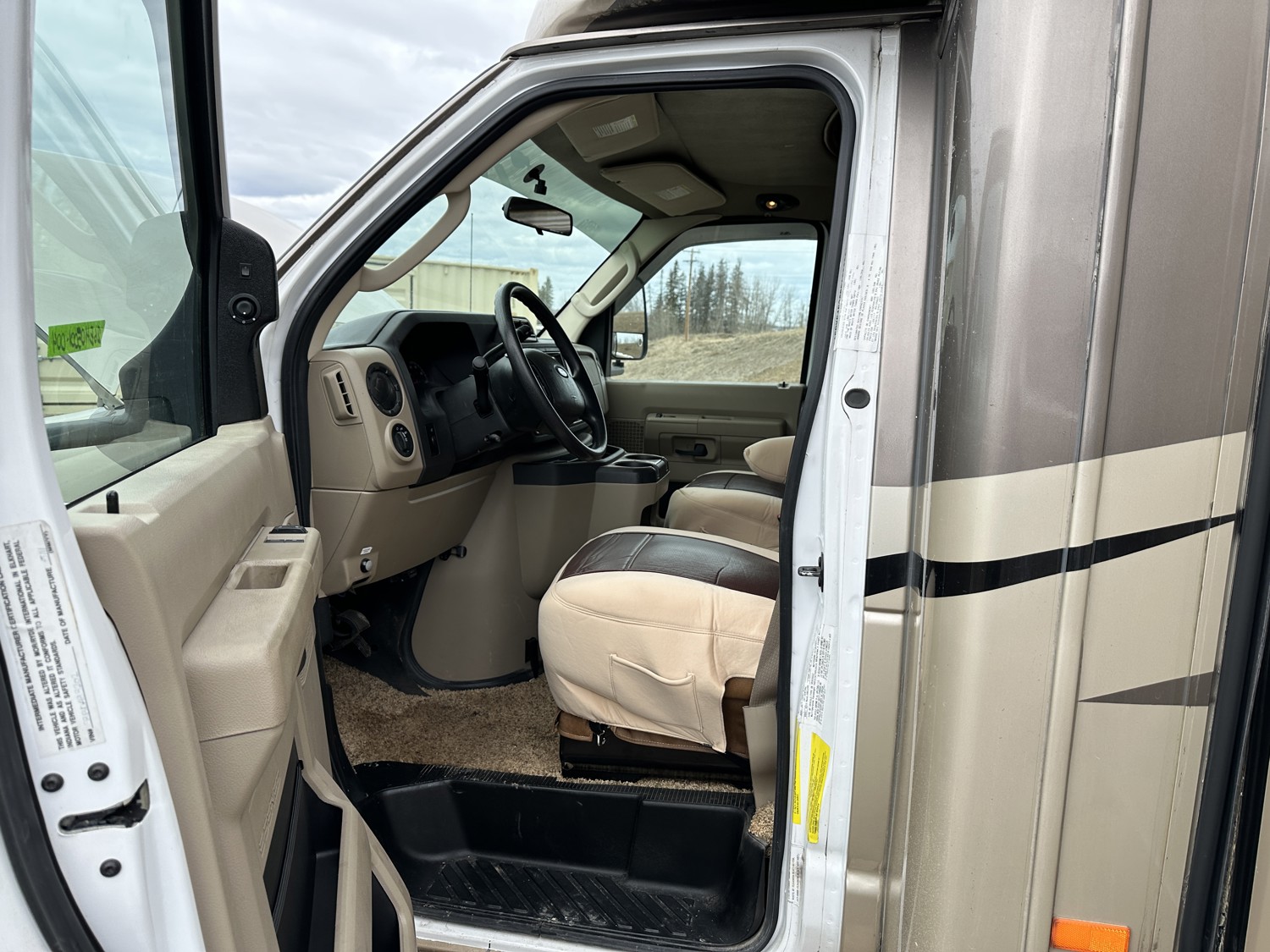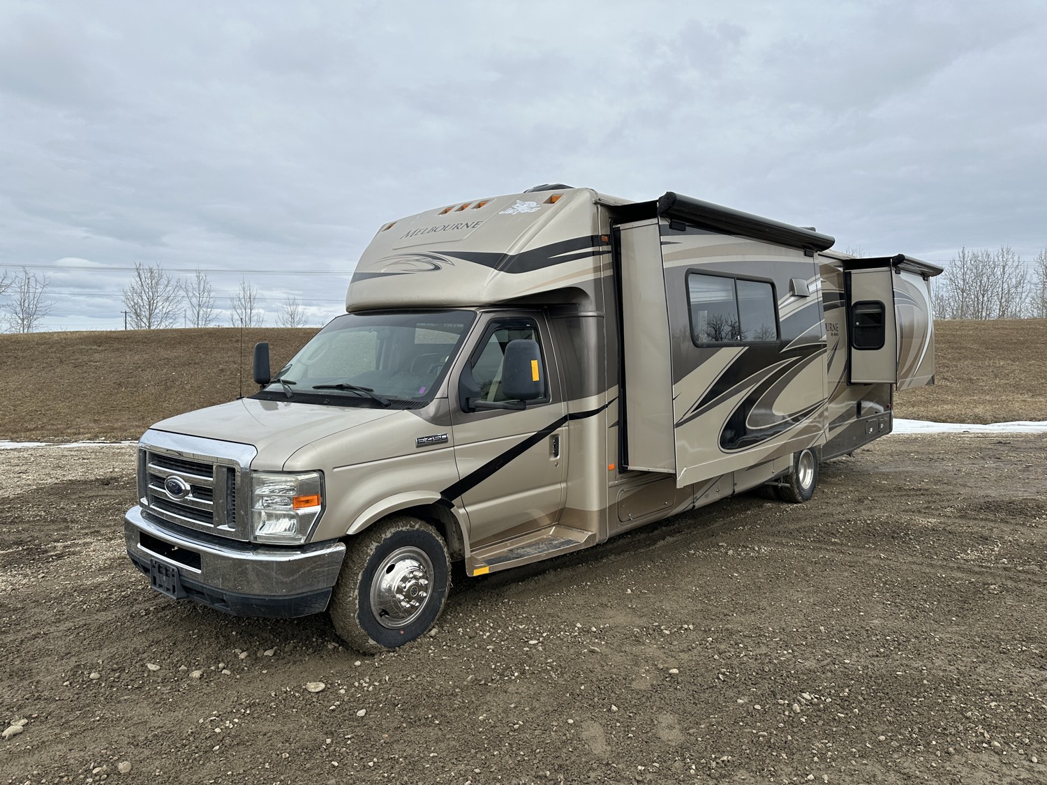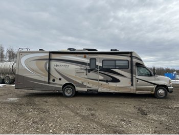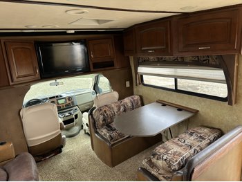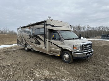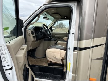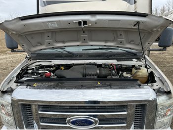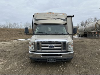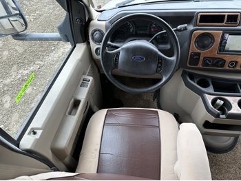 Ford E-450 Chassis, 6.8L V10 gas engine, automatic transmission, sleeps 6, rear queen bed, full bathroom, A/C, stove/oven, fridge, stereo, TV, underbelly storage, 225/75R16 tires
