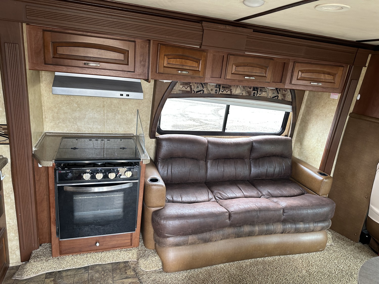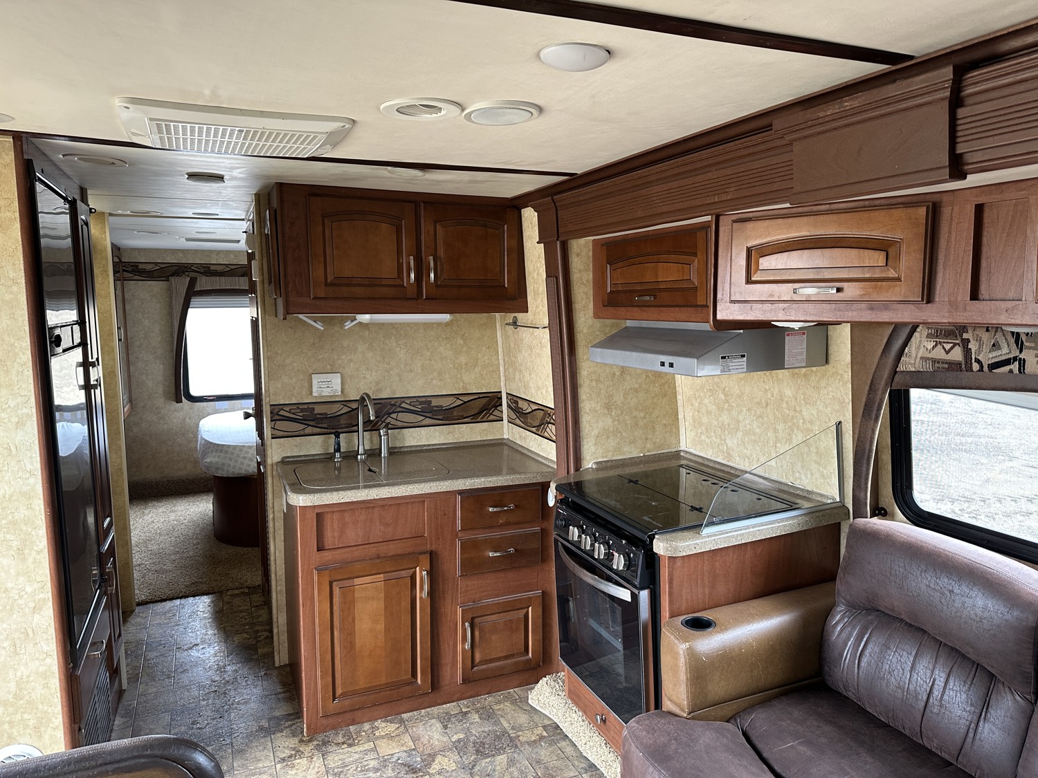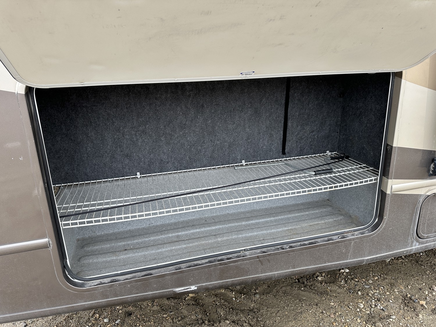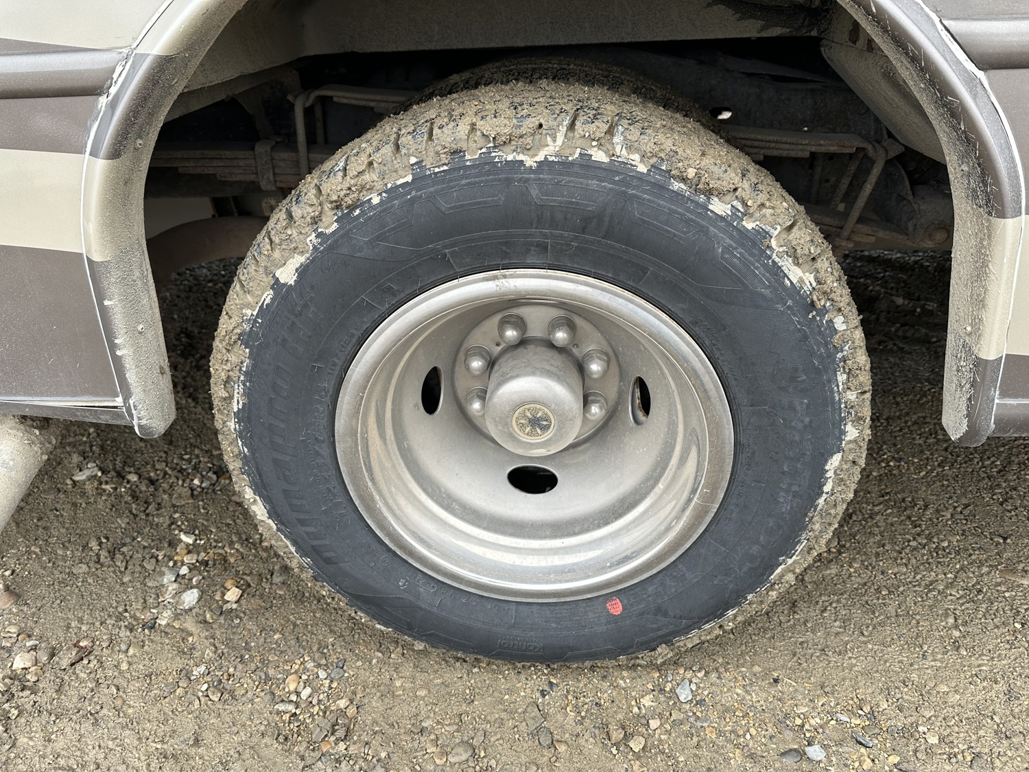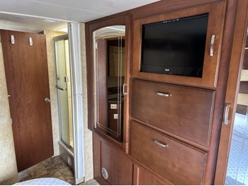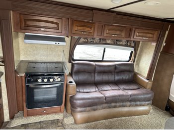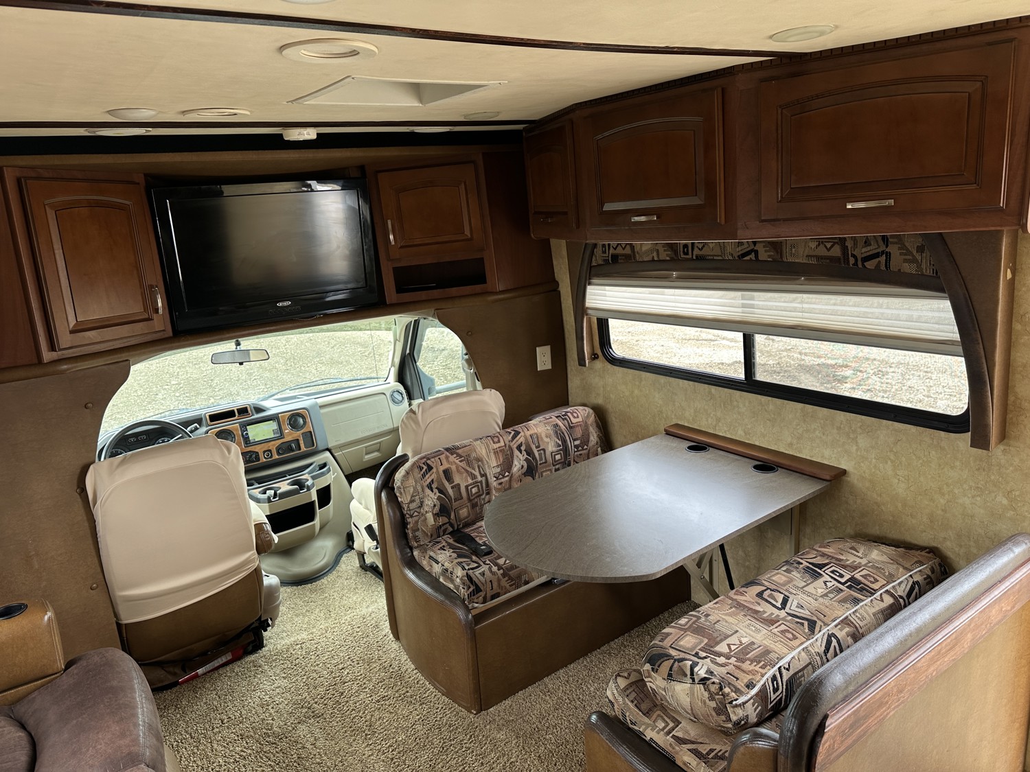 Ford E-450 Chassis, 6.8L V10 gas engine, automatic transmission, sleeps 6, rear queen bed, full bathroom, A/C, stove/oven, fridge, stereo, TV, underbelly storage, 225/75R16 tires