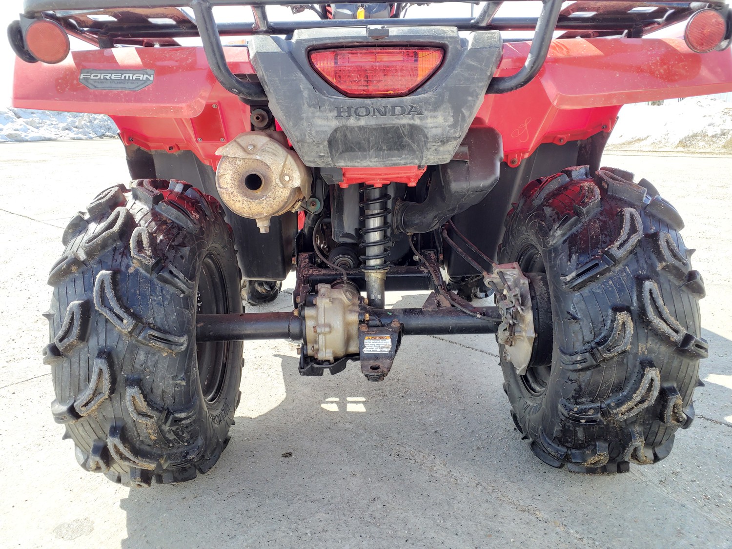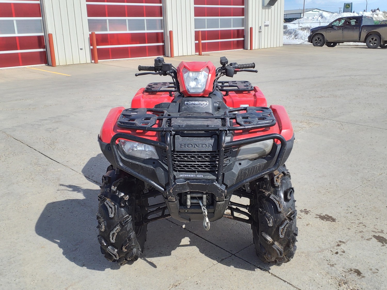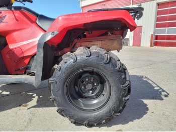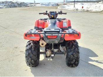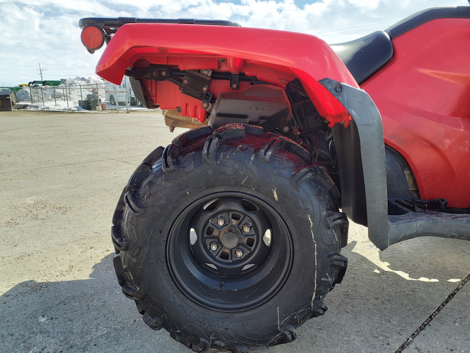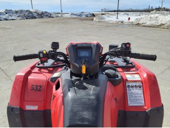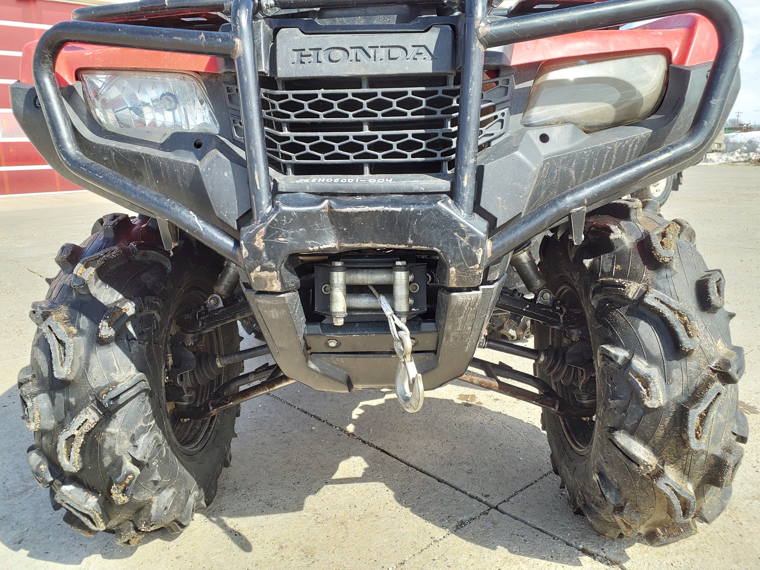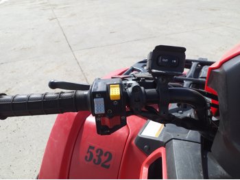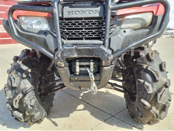 518 cc fuel injected water cooled engine, manual transmission, reverse, hitch, front and rear racks, front winch, 29X9-12 front tires, 26X11-12 rear tires