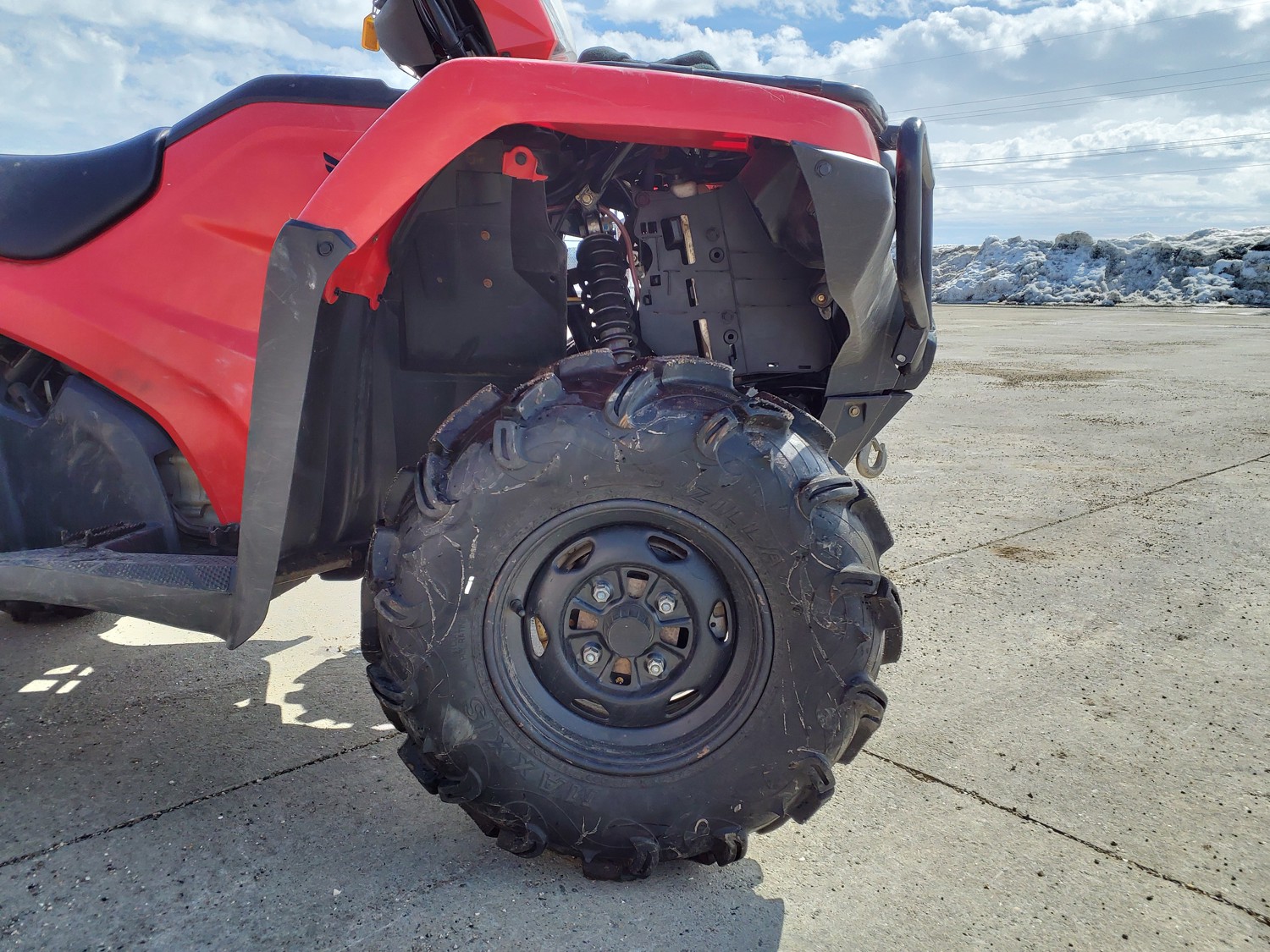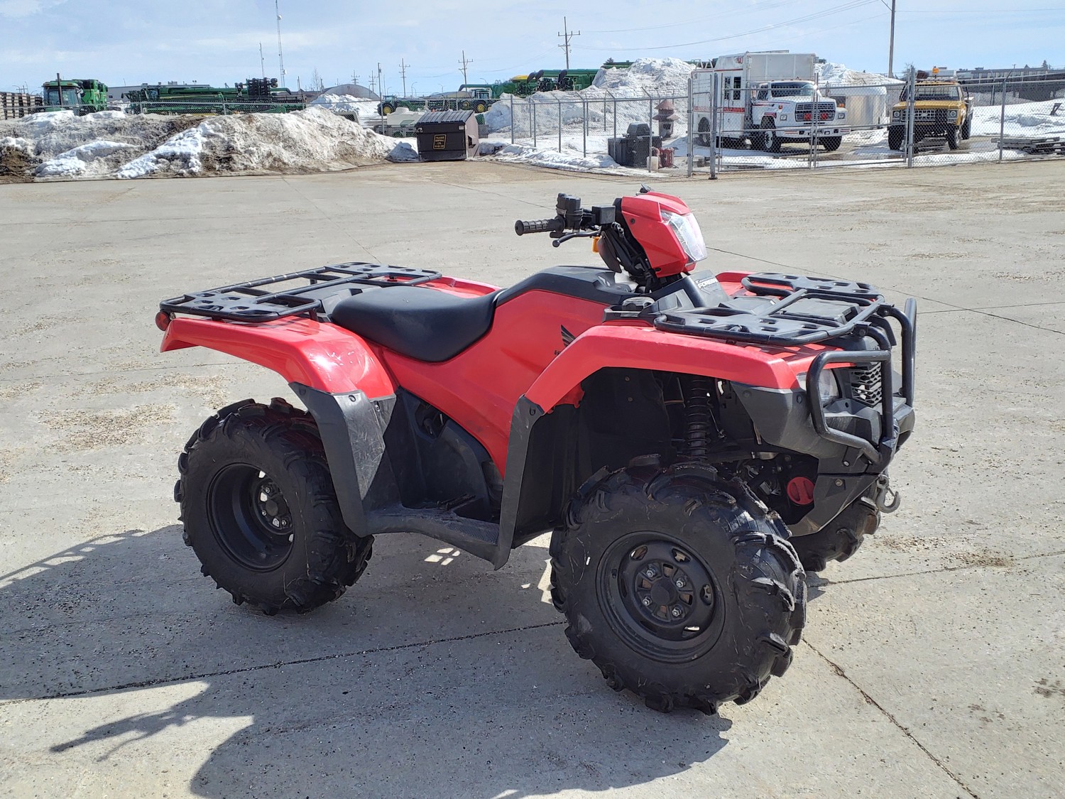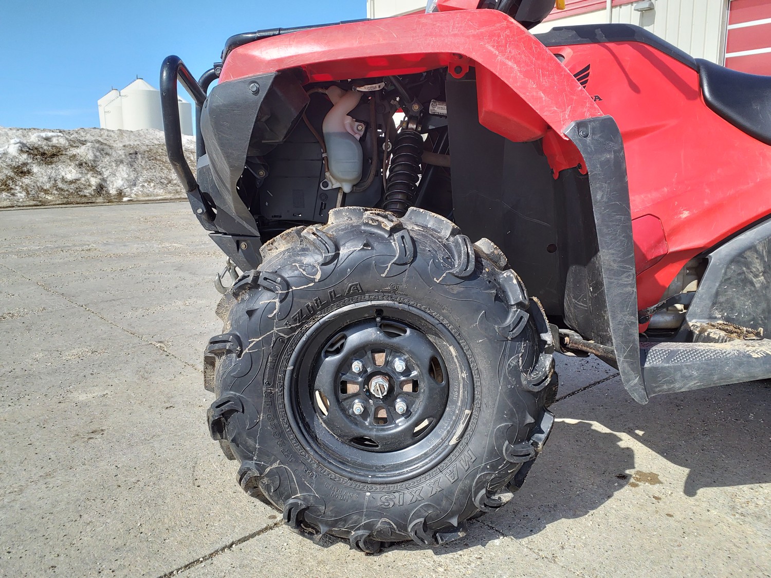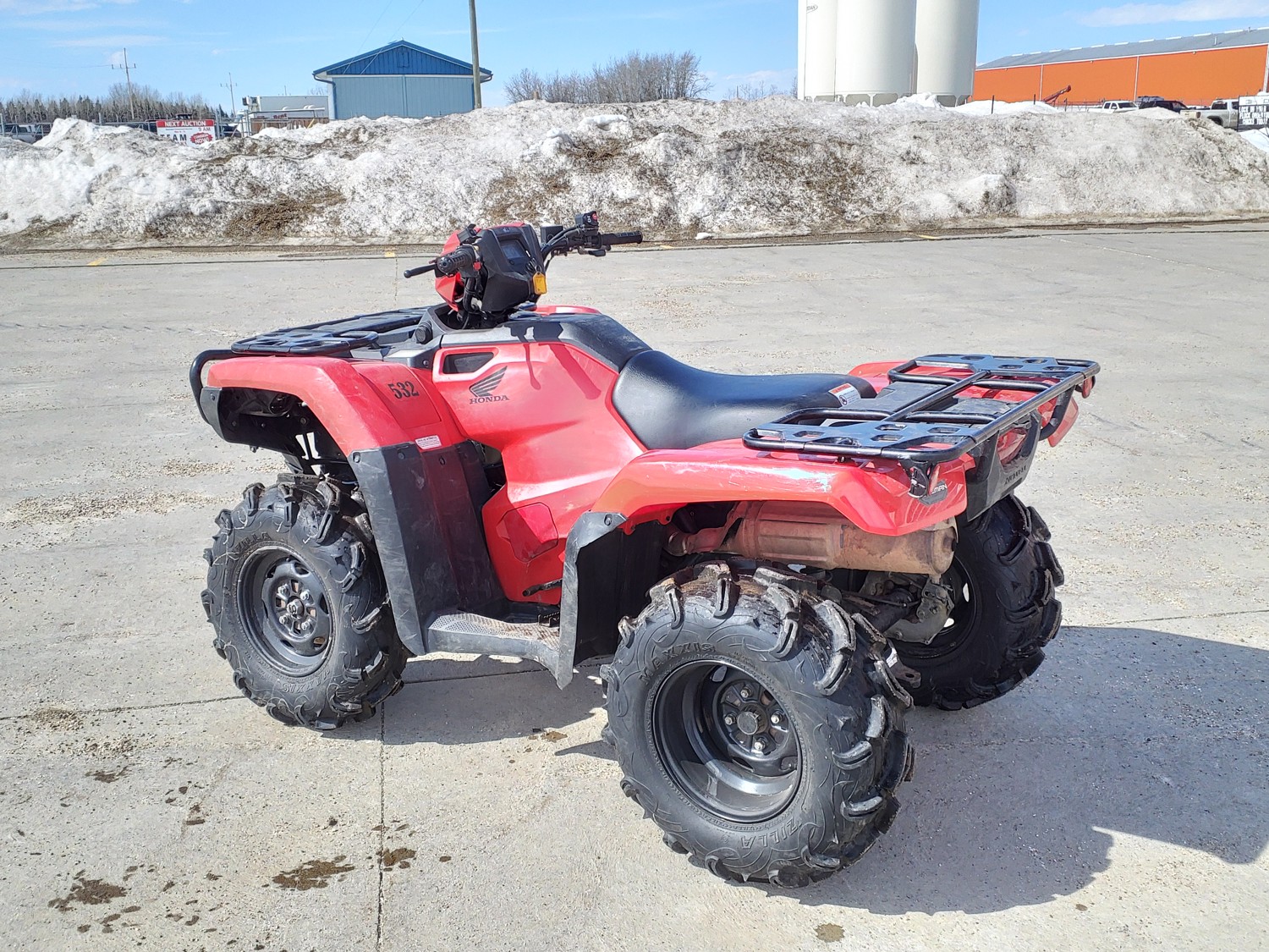 518 cc fuel injected water cooled engine, manual transmission, reverse, hitch, front and rear racks, front winch, 29X9-12 front tires, 26X11-12 rear tires