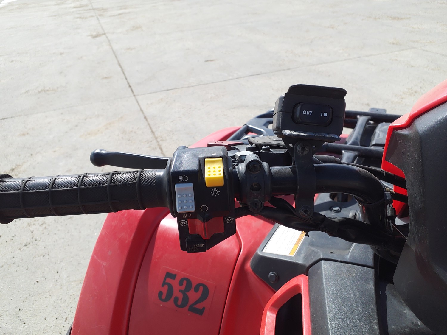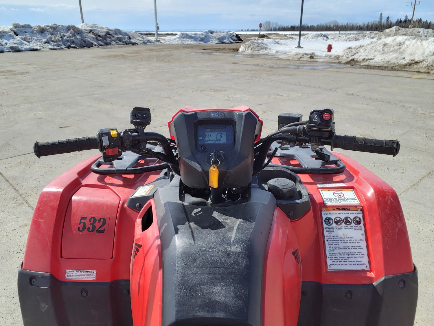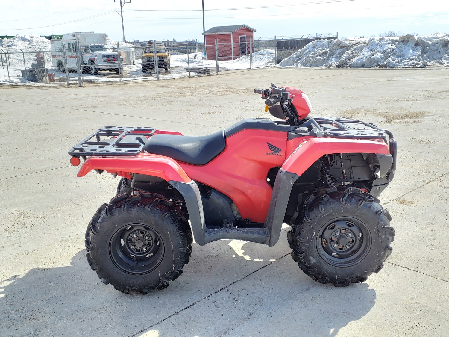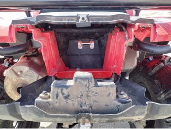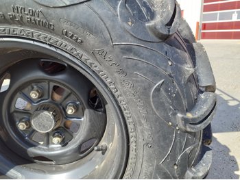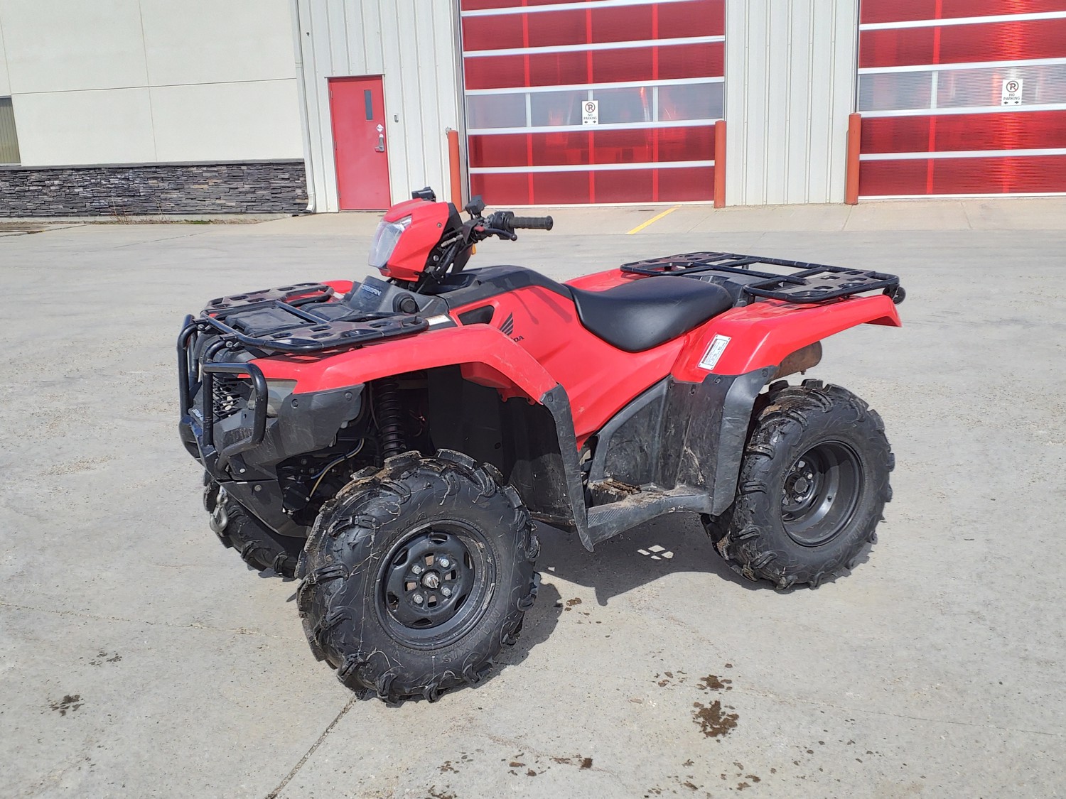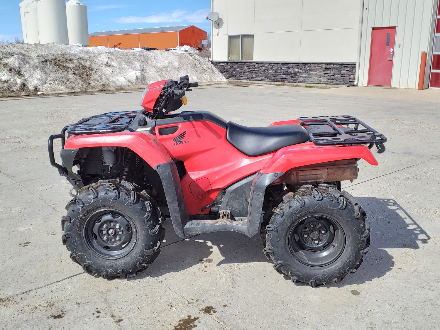 518 cc fuel injected water cooled engine, manual transmission, reverse, hitch, front and rear racks, front winch, 29X9-12 front tires, 26X11-12 rear tires