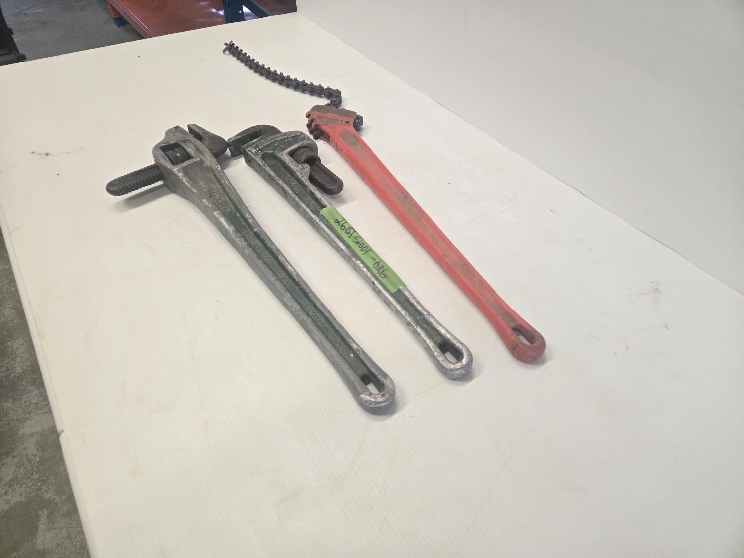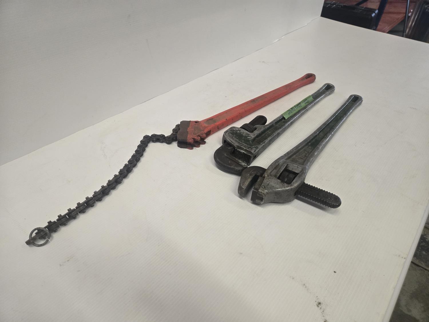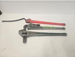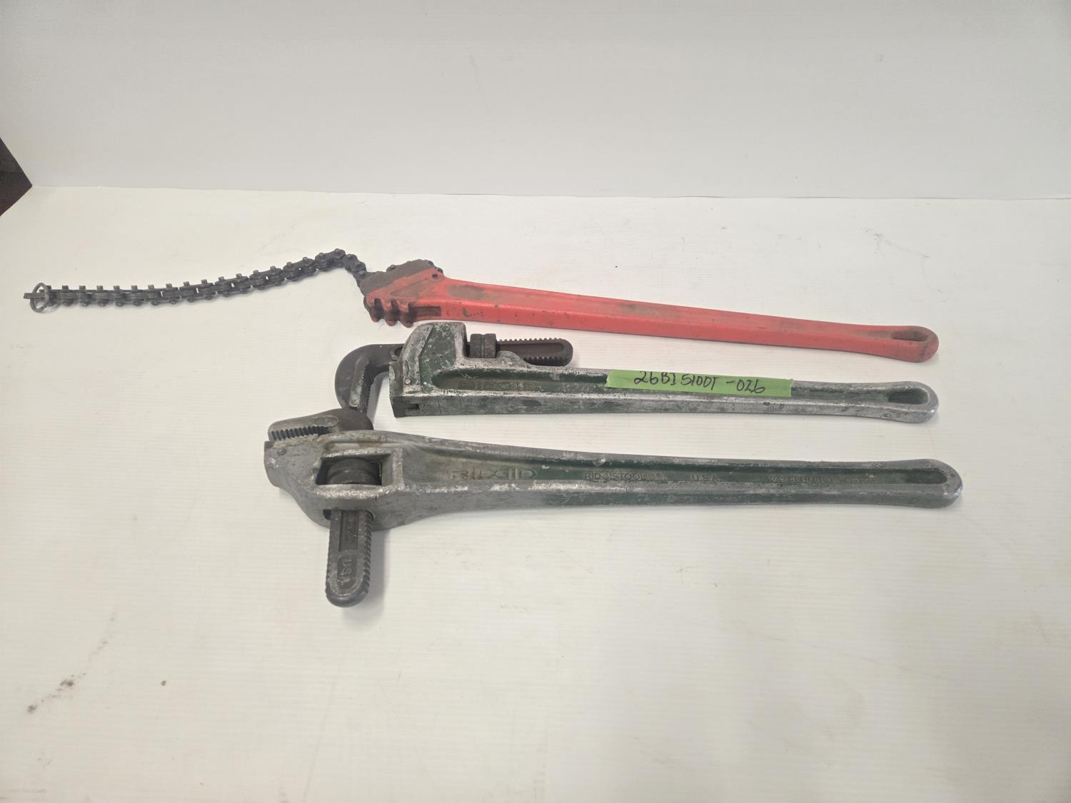 (1) Aluminum pipe wrench, (1) 90 degree aluminum pipe wrench, (1) cast iron chain pipe wrench
