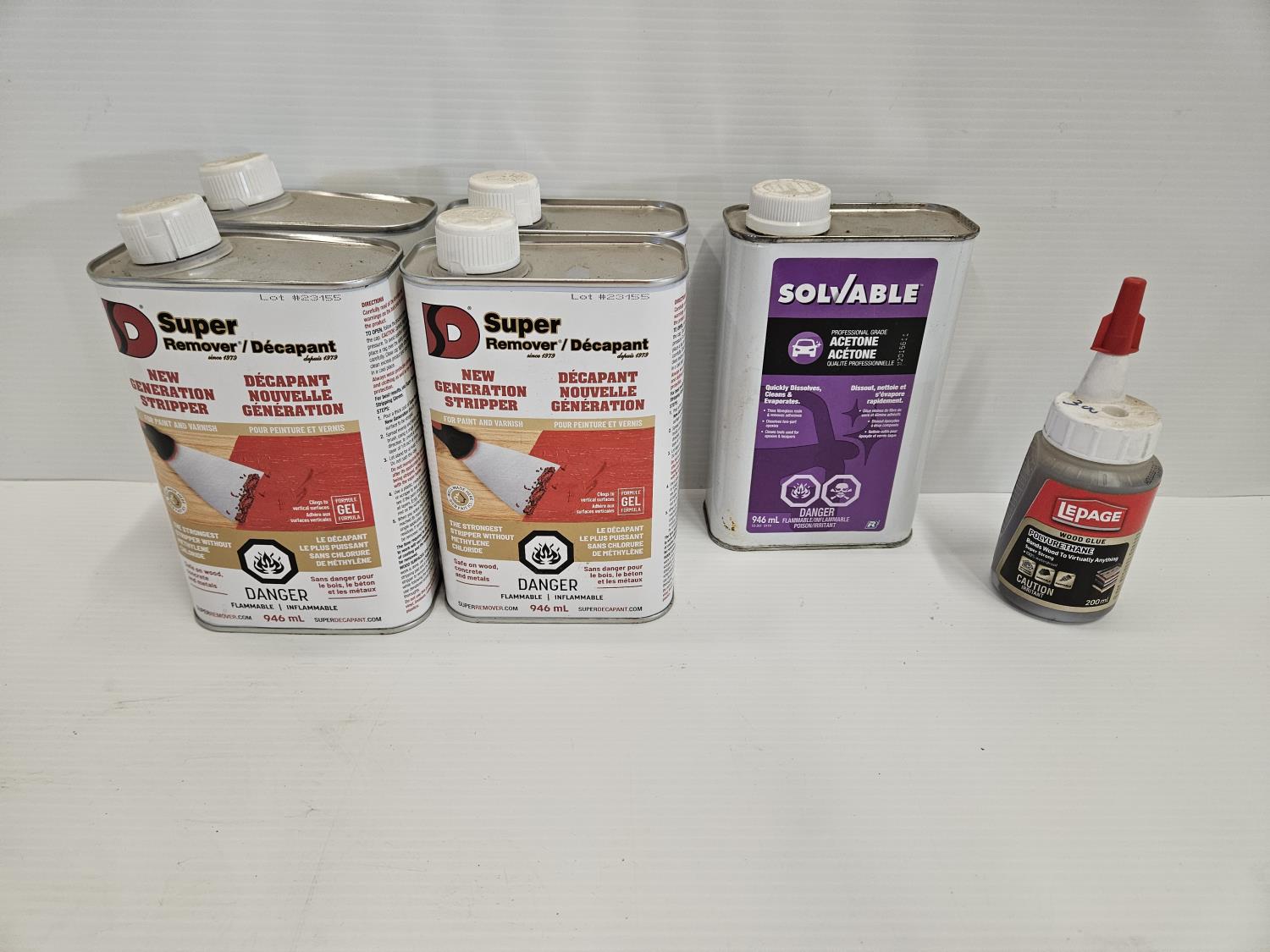 includes (4) 946 mL super remover new generation stripper, (1) solvable acetone, (1) 200 mL lepage wood glue