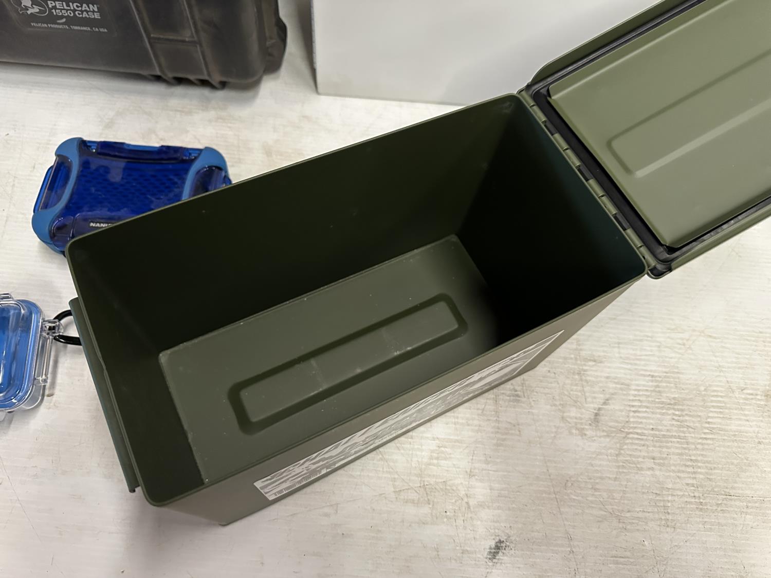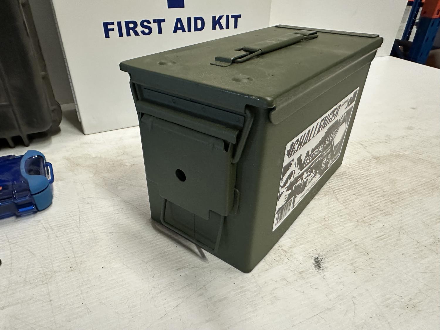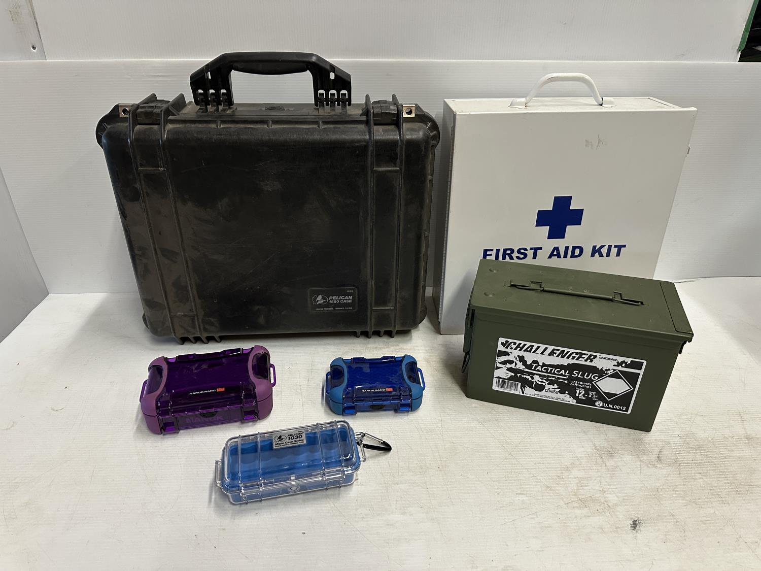 7272 Metal Ammo Box, (2) Nanuk Nano Cases, (2) Pelican Cases and Empty First Aid Kit