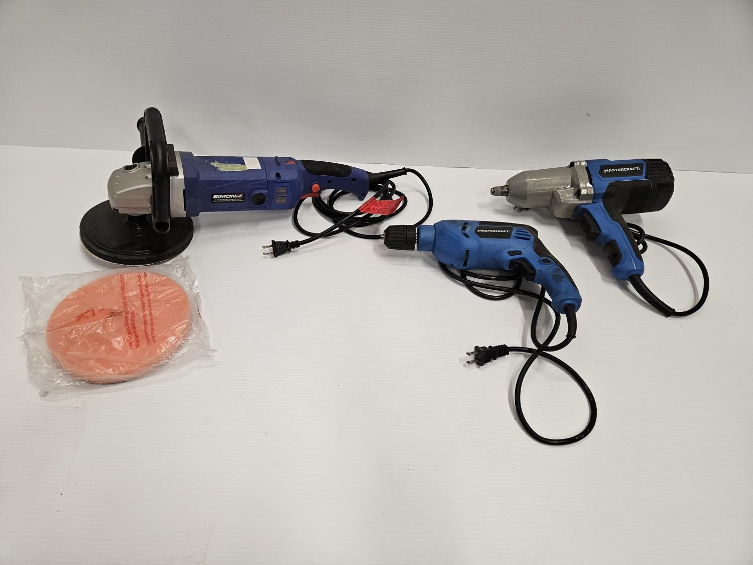 includes (1) Simoniz JLS1180A 7 inch 120V right angle polisher & sander, (1) Mastercraft 3/8 inch corded drill, (1) Mastercraft 120V corded impact wrench