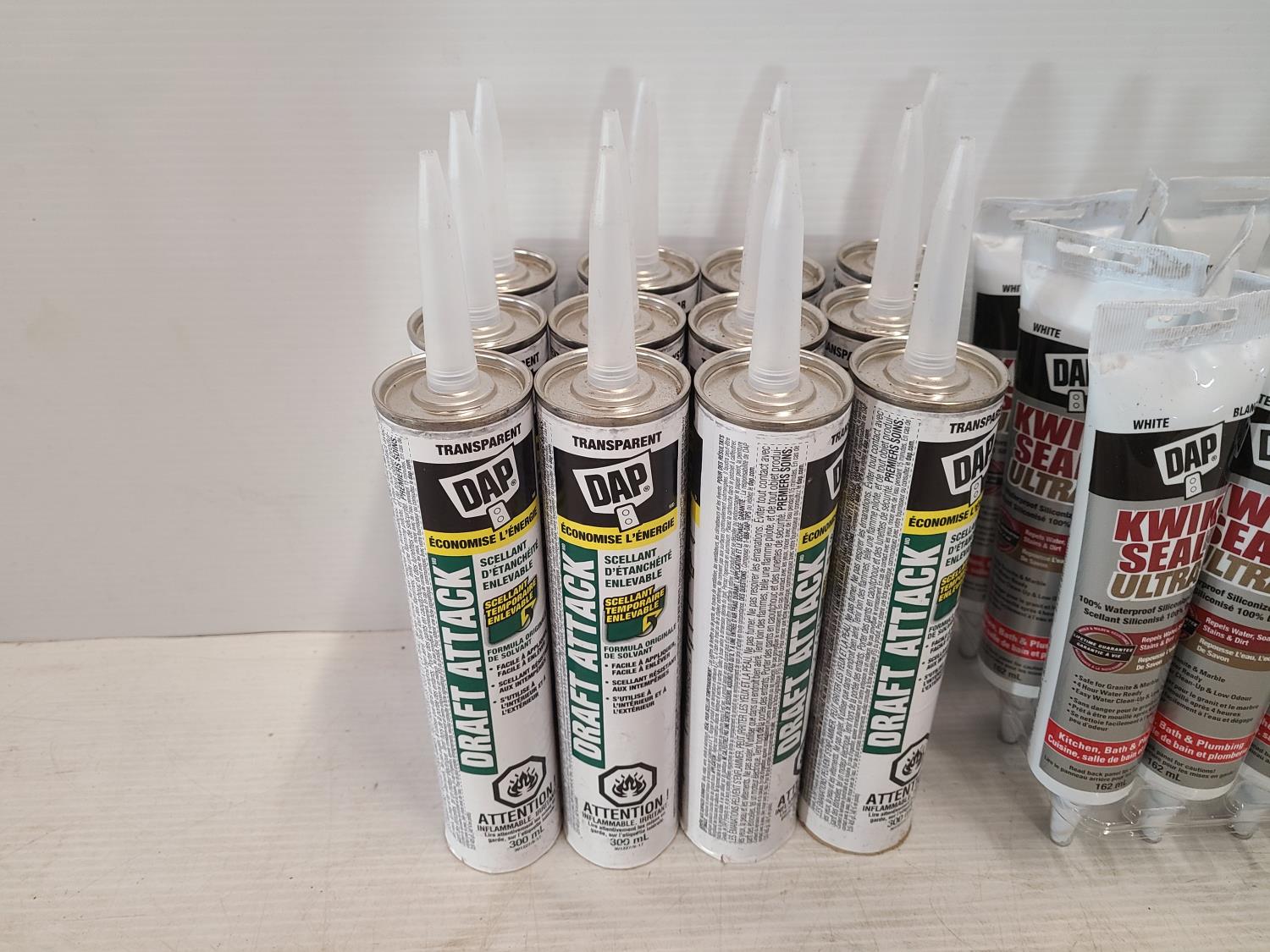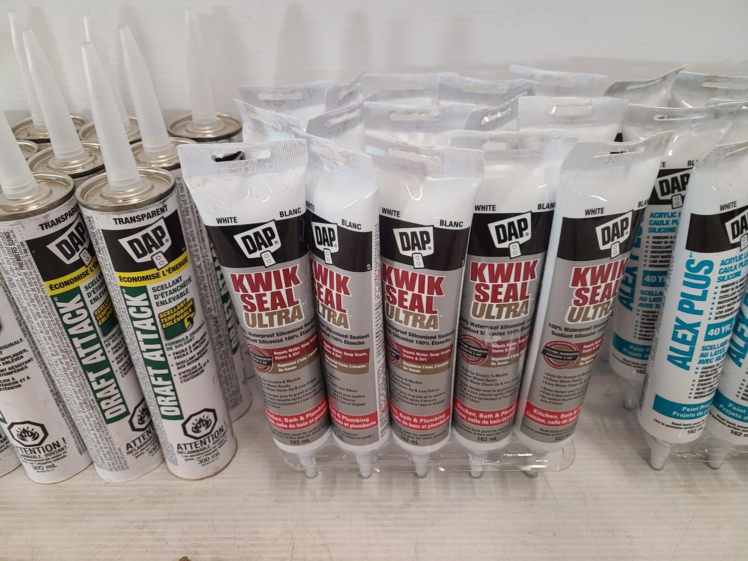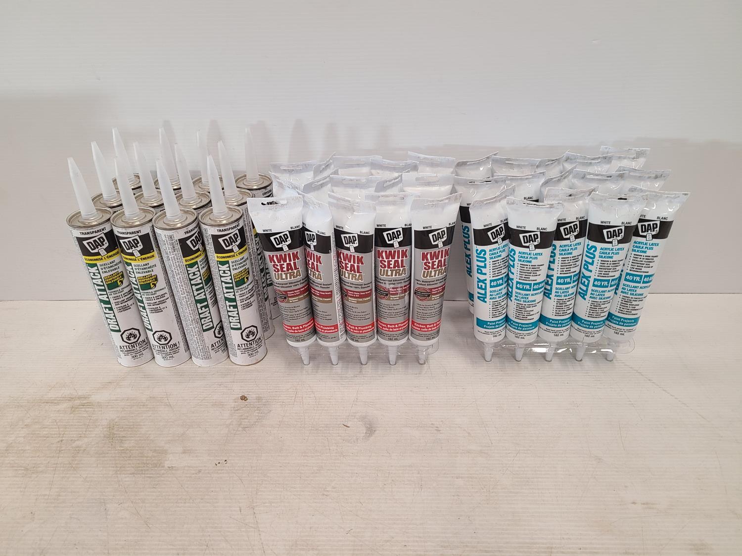 (12) draft attack crystal clear, (15) kwik seal ultra white, (15) alex plus white