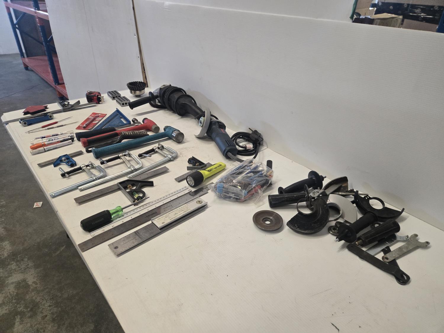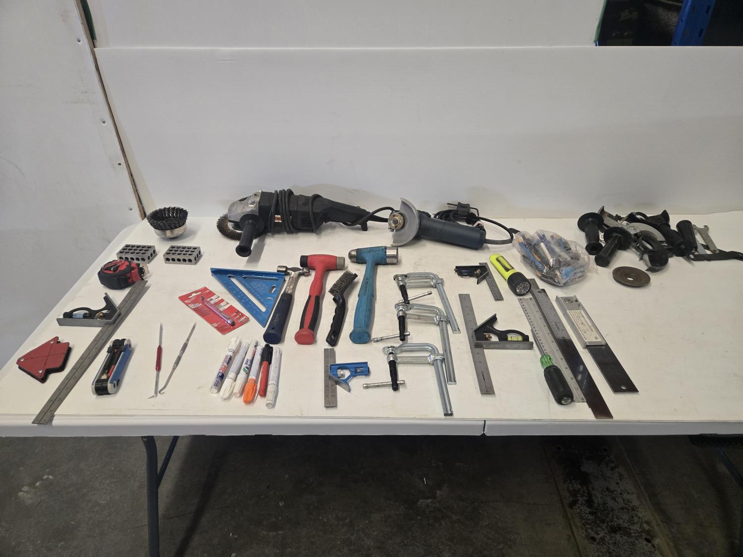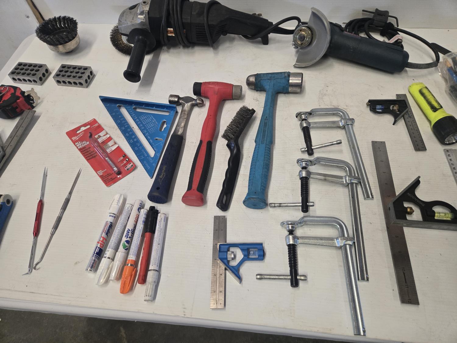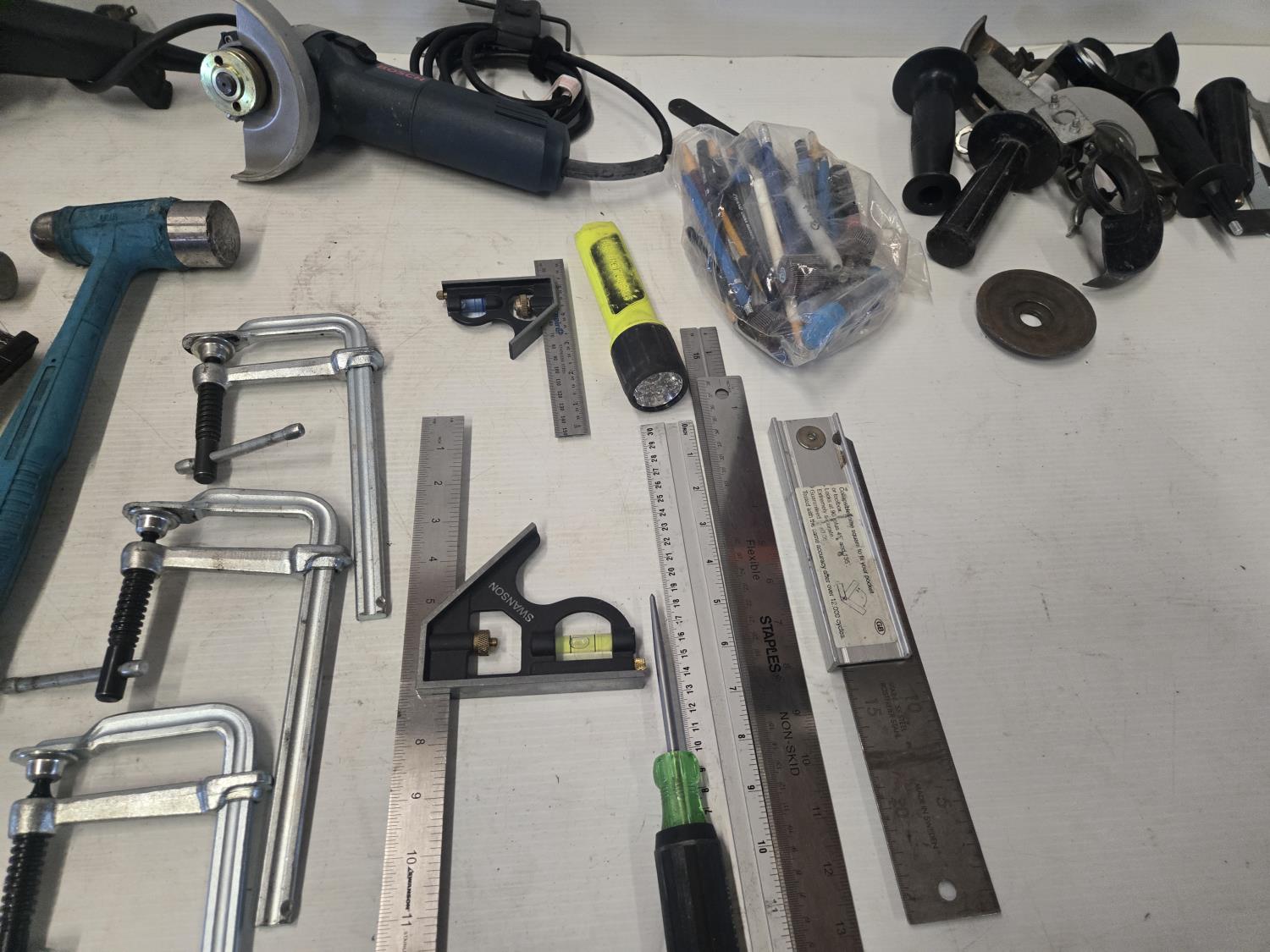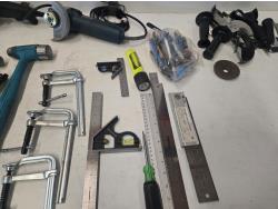 (1) Walter 5 inch angle grinder, (1) 4 inch Bosch angle grinder, miscellaneous grinder shields, (4) squares, (3) hammers, (3) Bessey clamps, miscellaneous tools and supplies