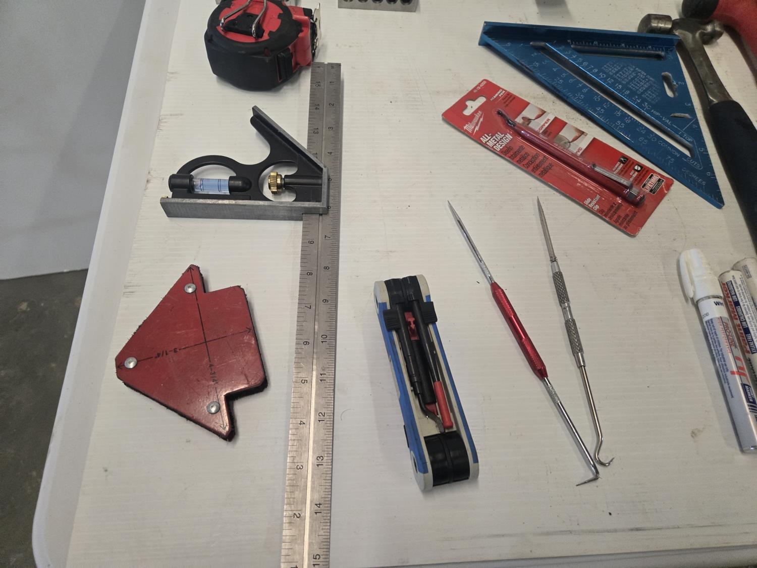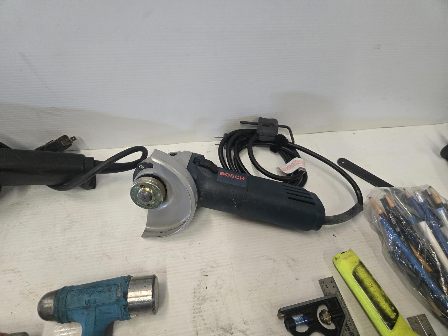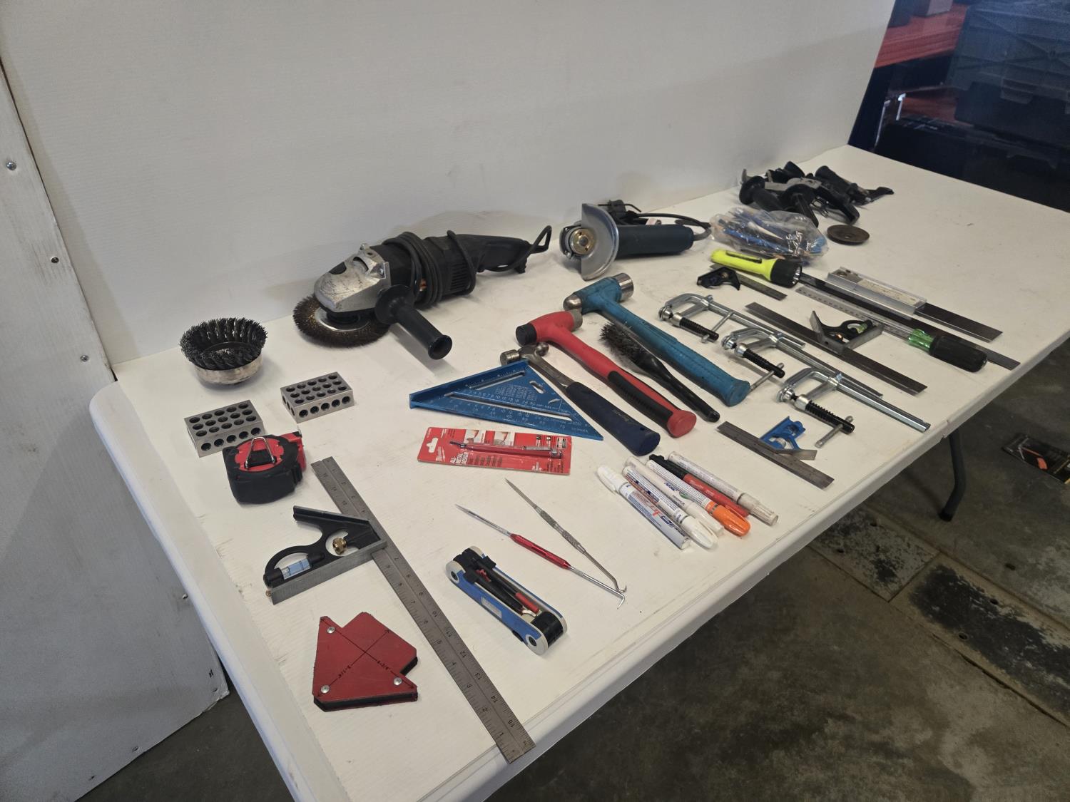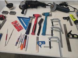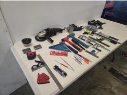 (1) Walter 5 inch angle grinder, (1) 4 inch Bosch angle grinder, miscellaneous grinder shields, (4) squares, (3) hammers, (3) Bessey clamps, miscellaneous tools and supplies