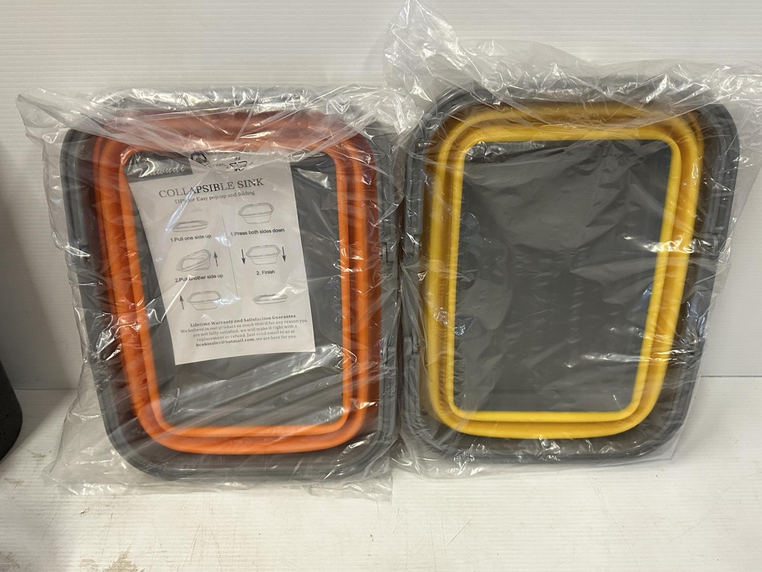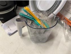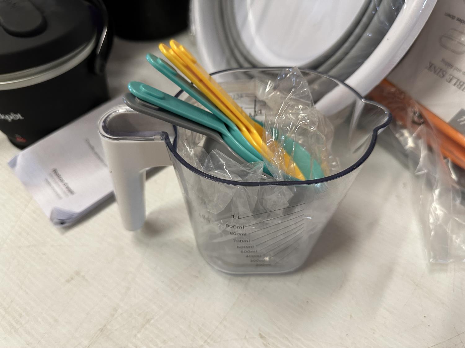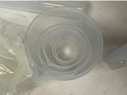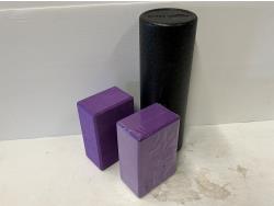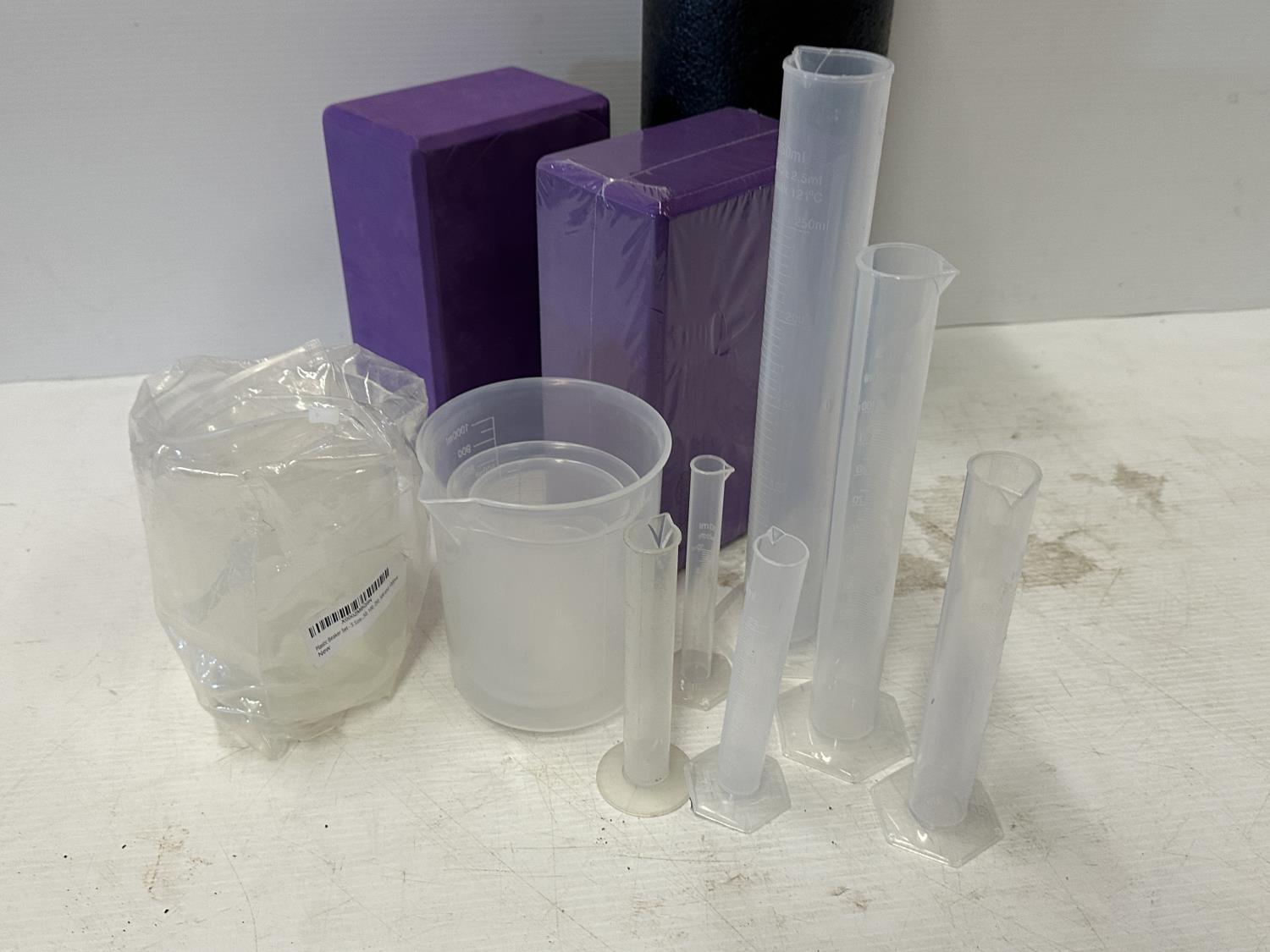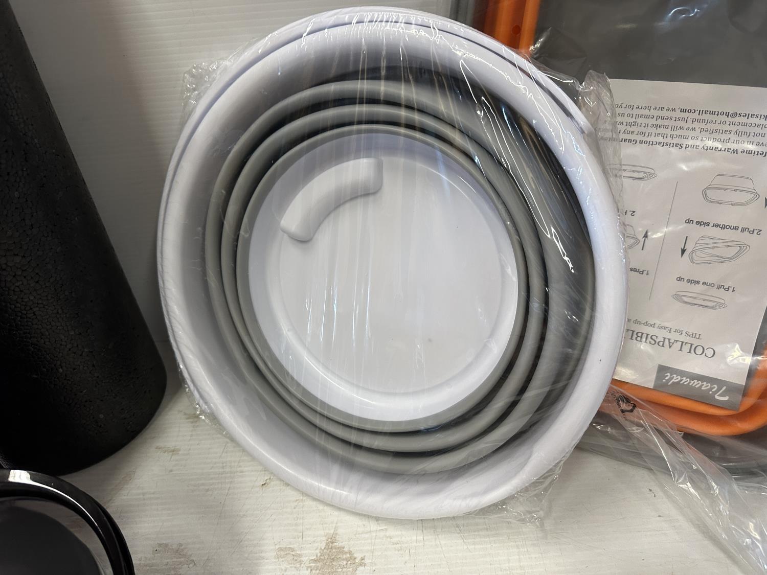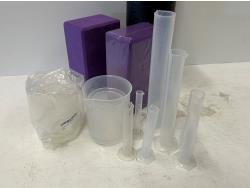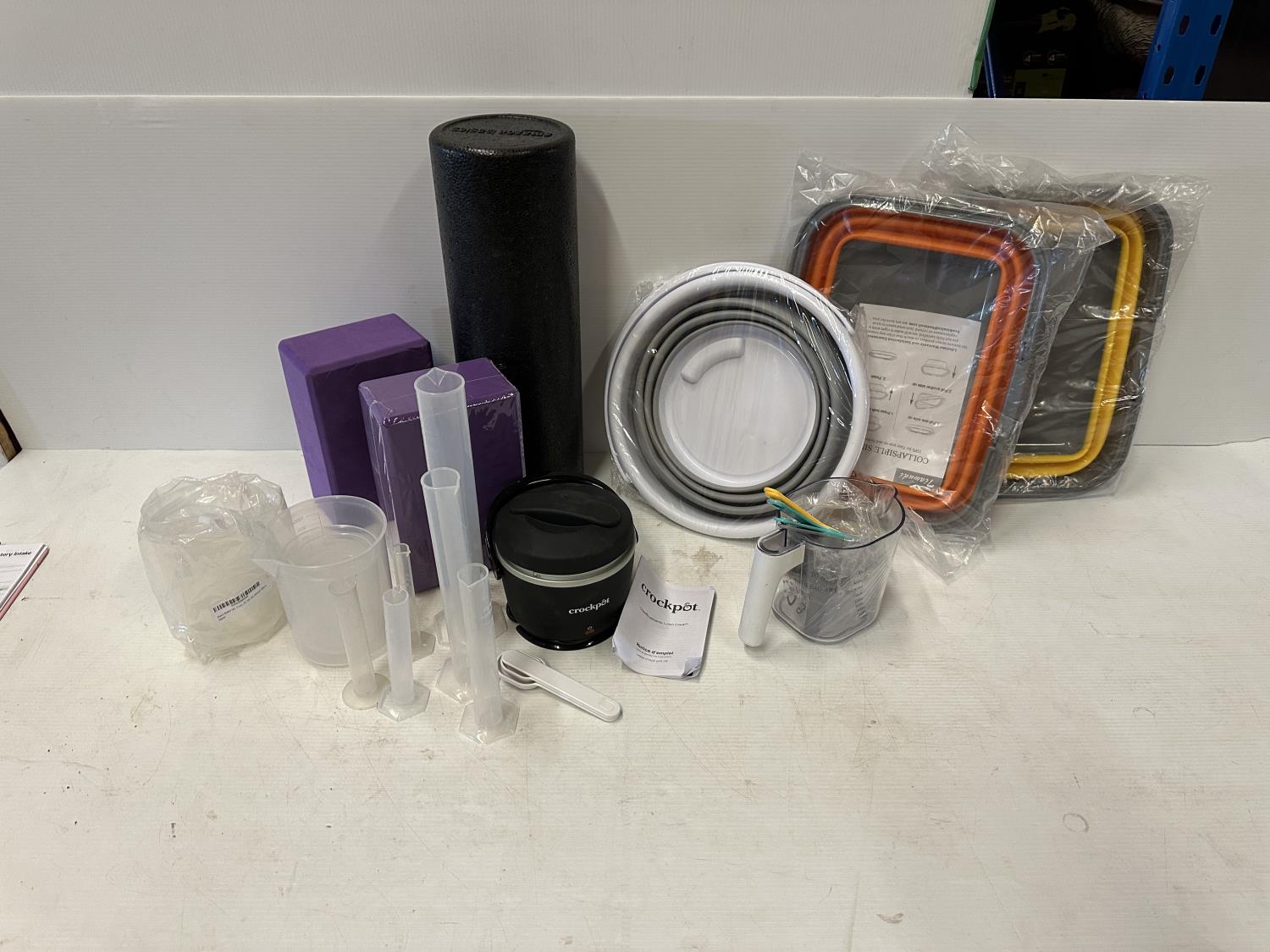 2.6 gallon collapsible bucket, (2) collapsible sinks, mini Crockpot food warmer, plastic beaker set, foam roller
