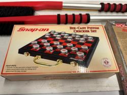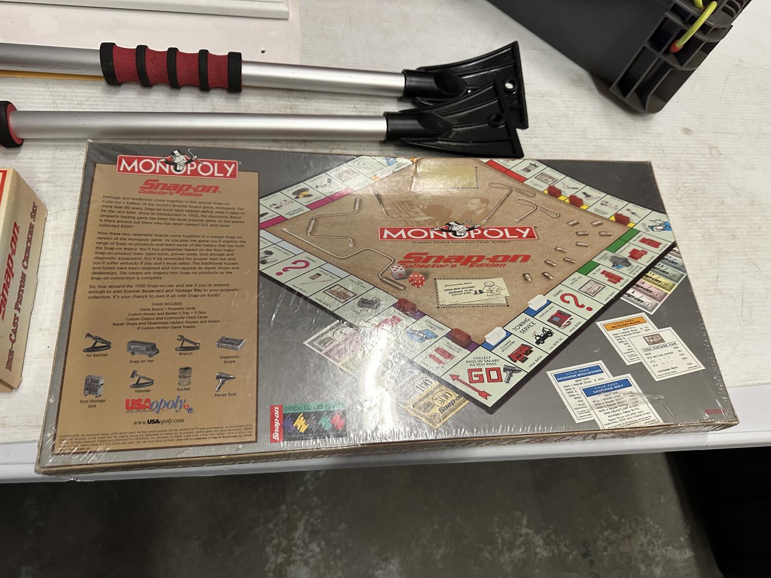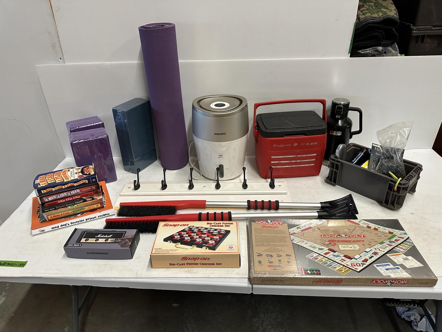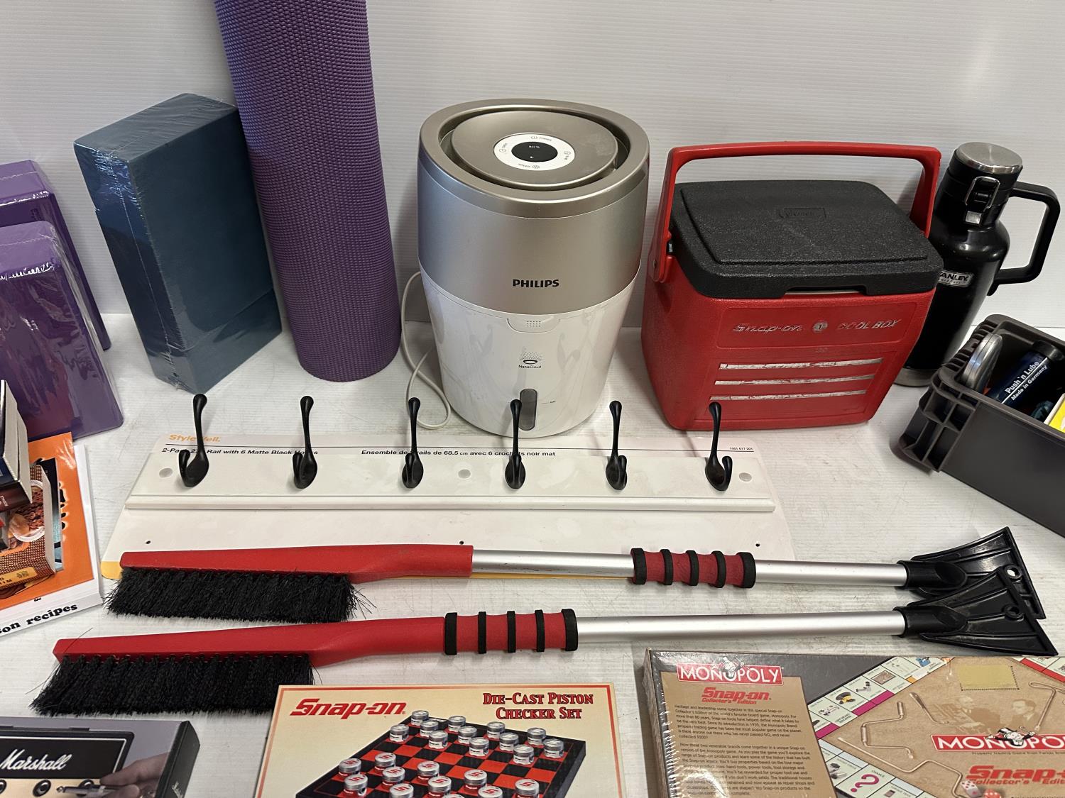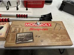 yoga mat, Snap-On Cool Box, (5) micro SD cards, (2) snow brushes, Monopoly Snap-On game, hook rail, Snap-On checker game