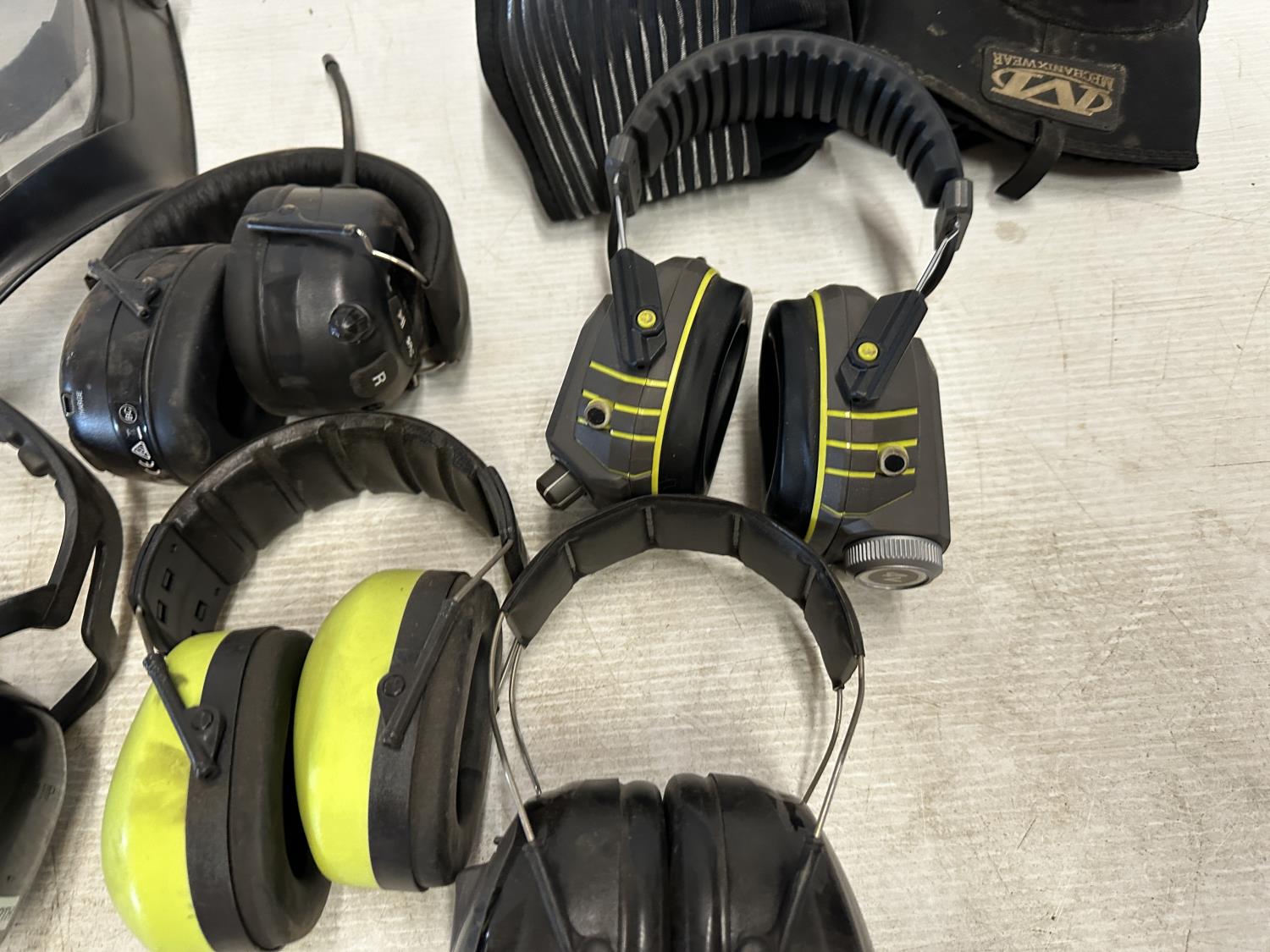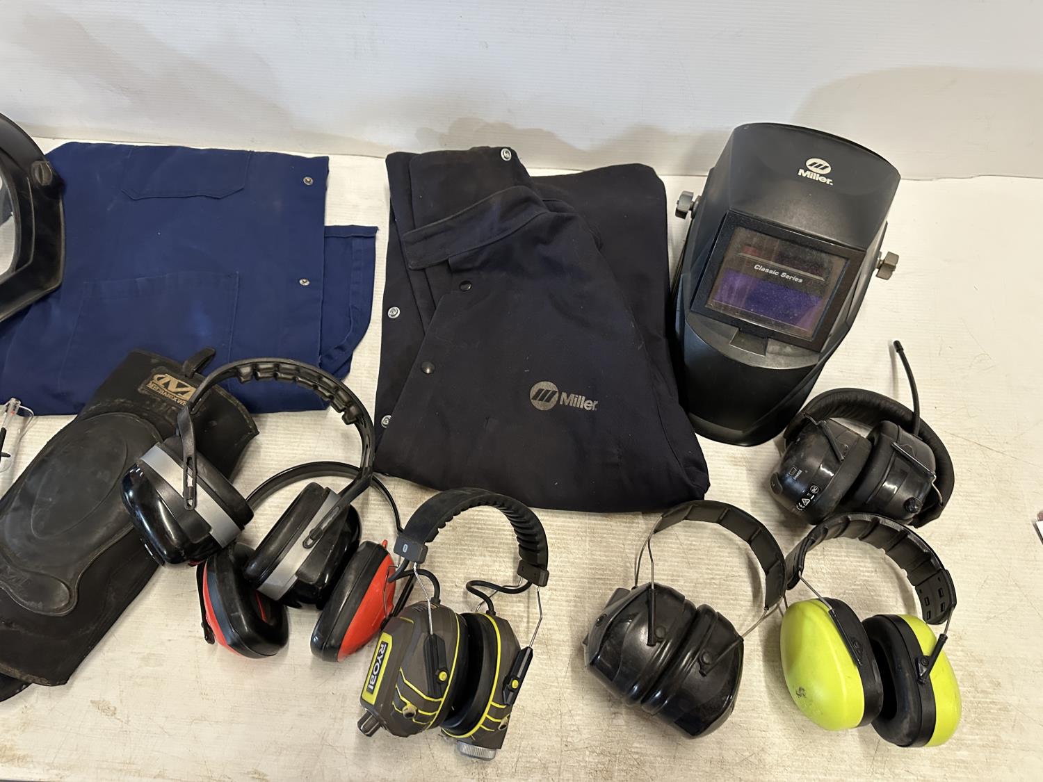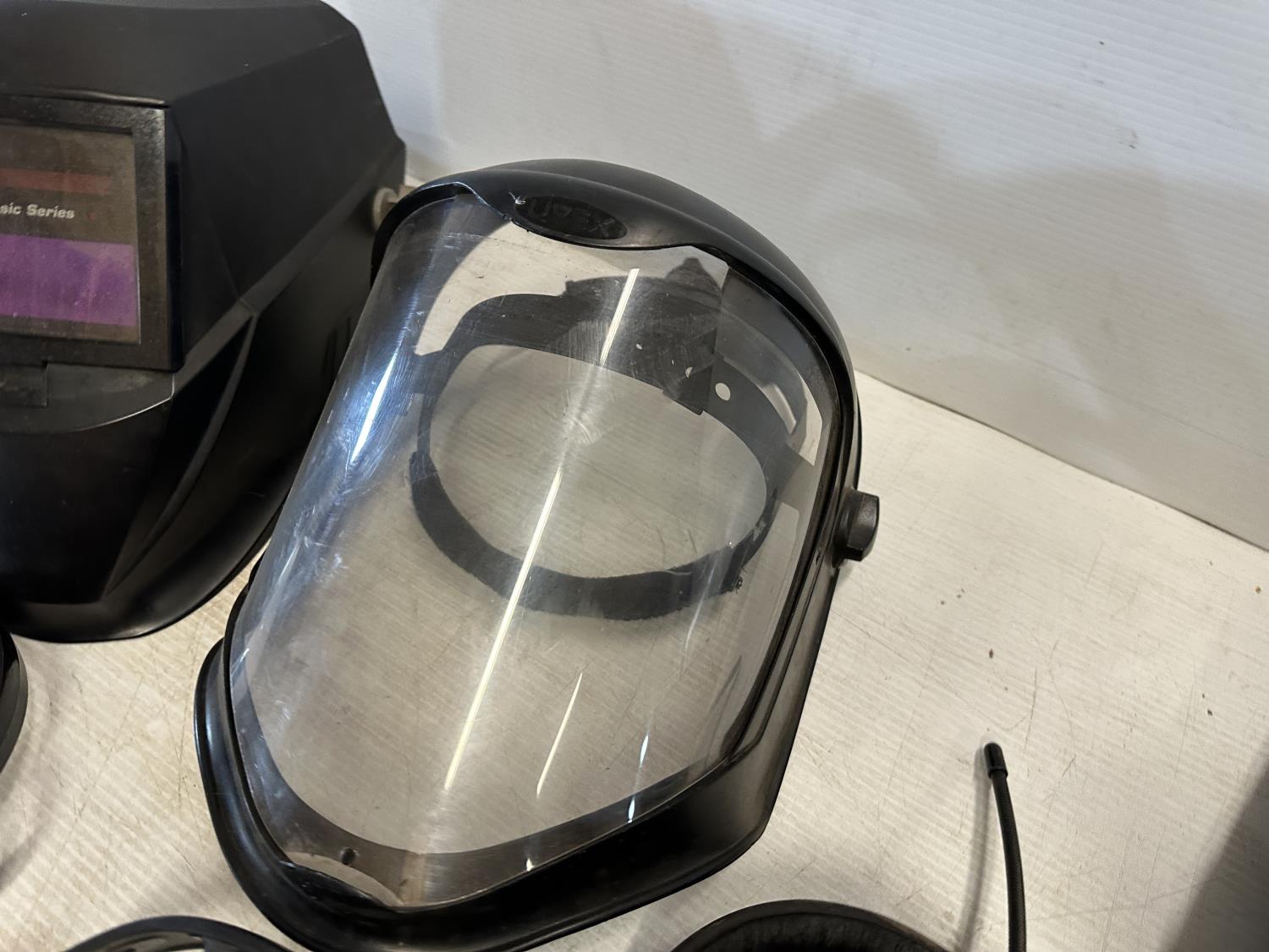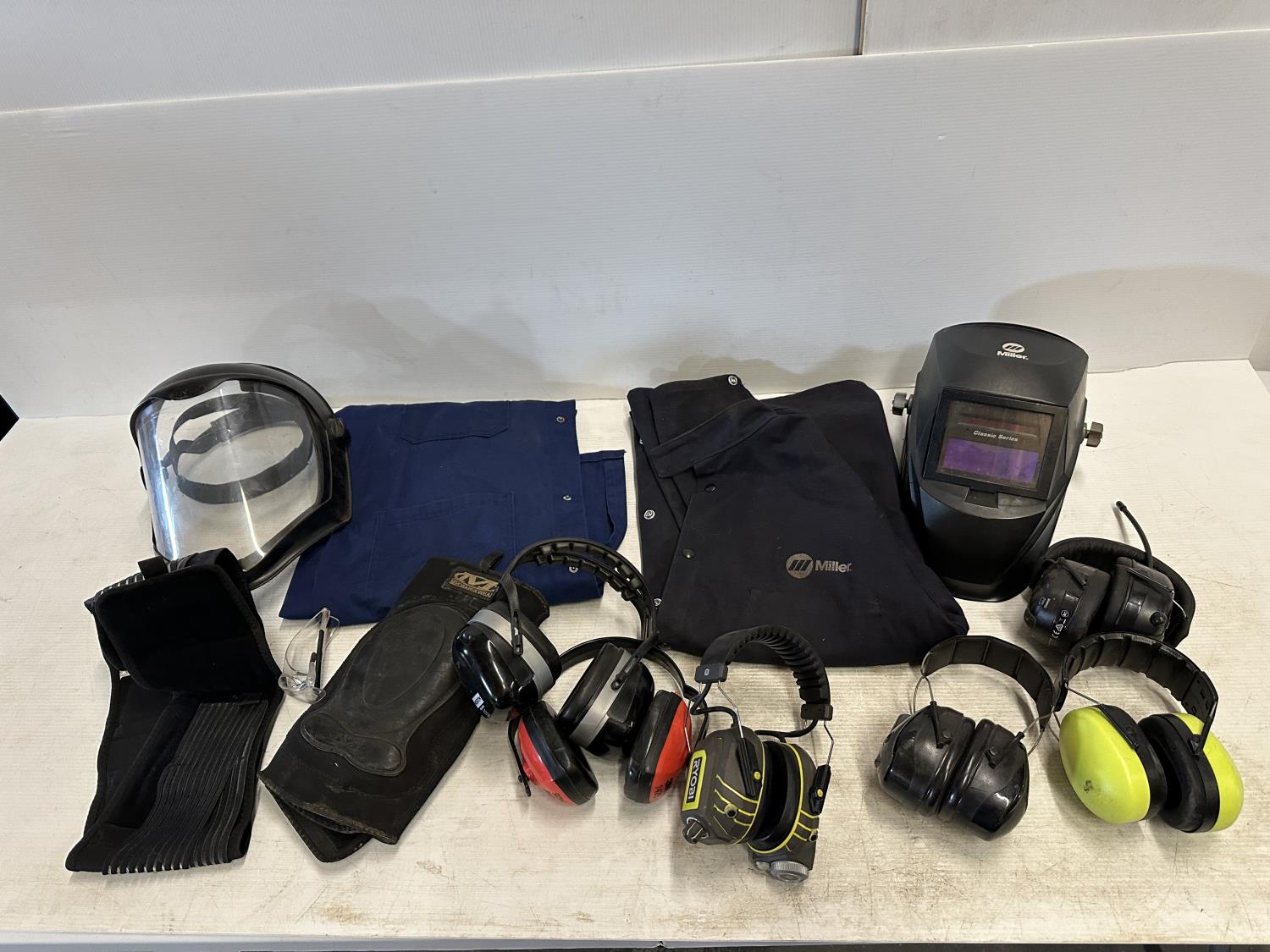 ear muffs, face shield, welding helmet