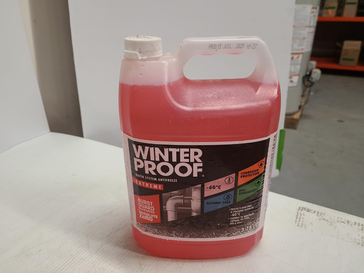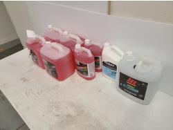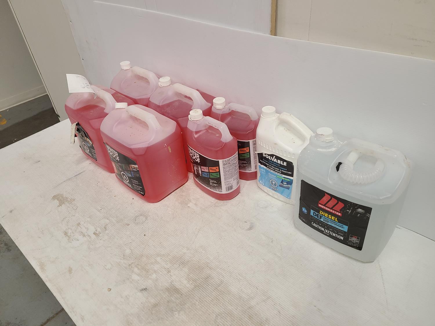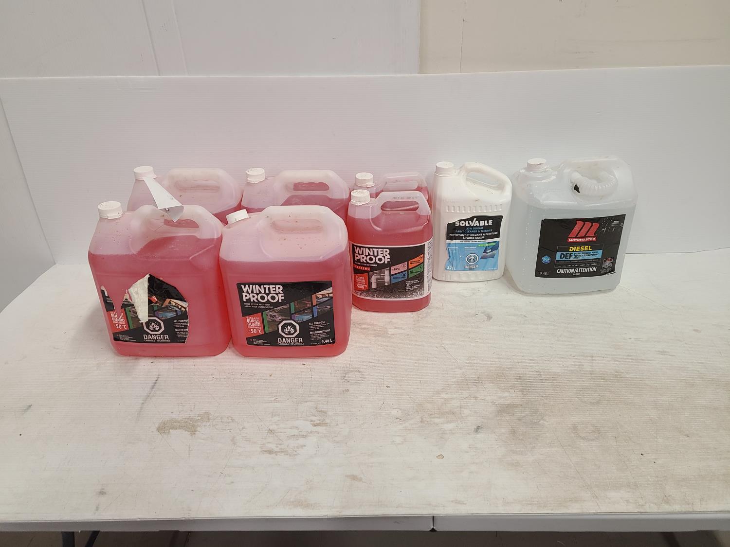 (4) 9.46L jugs of winter proof, (2) 3.78L jugs of winter proof, (1) 9.46L motomaster DEF, (1) 3.78L Solvable paint thinner