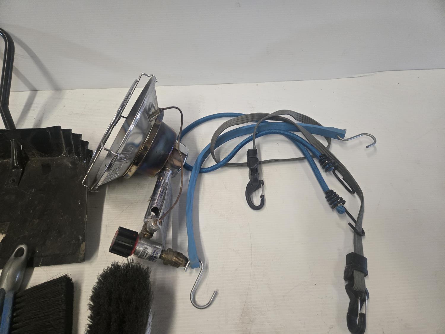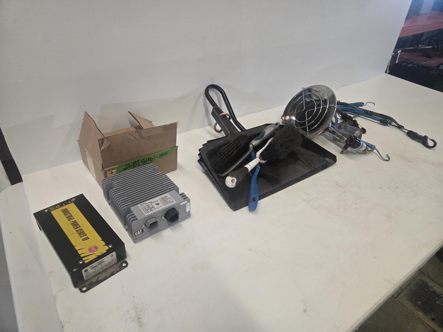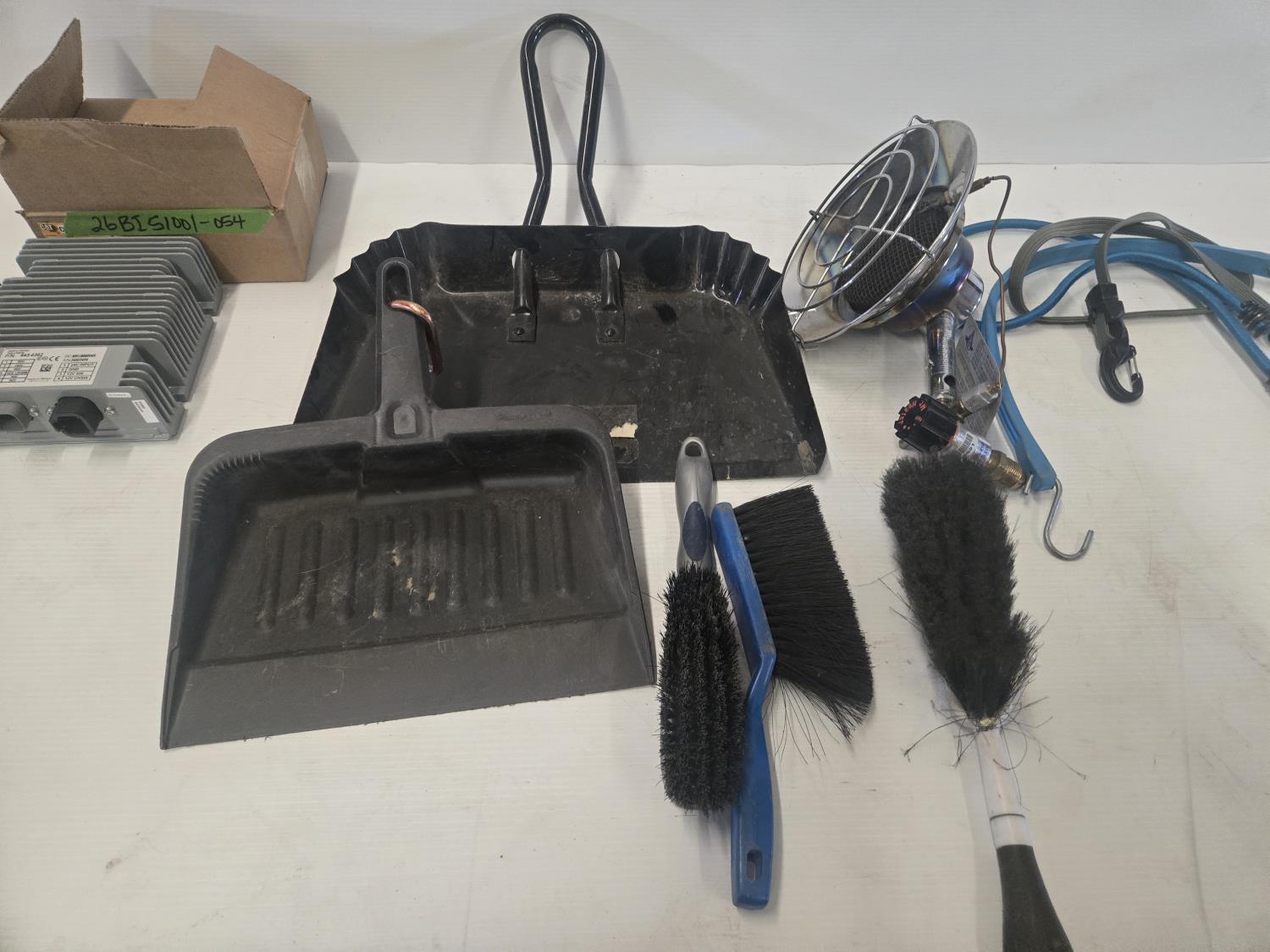 (2) Dust pans, Qty of brushes, Propane heater, (2) includes poly tote, (2) Power convertors, miscellaneous tarp straps