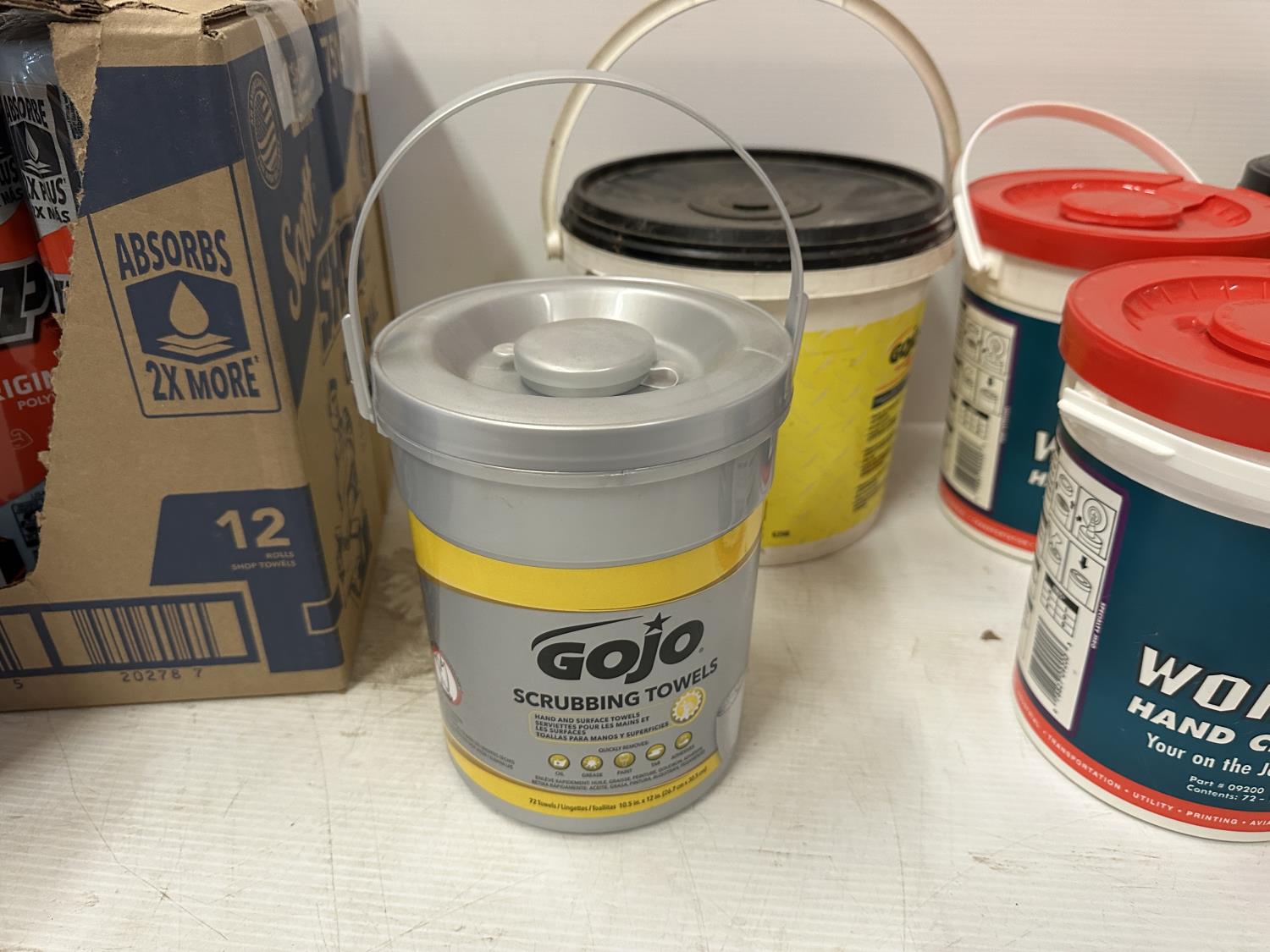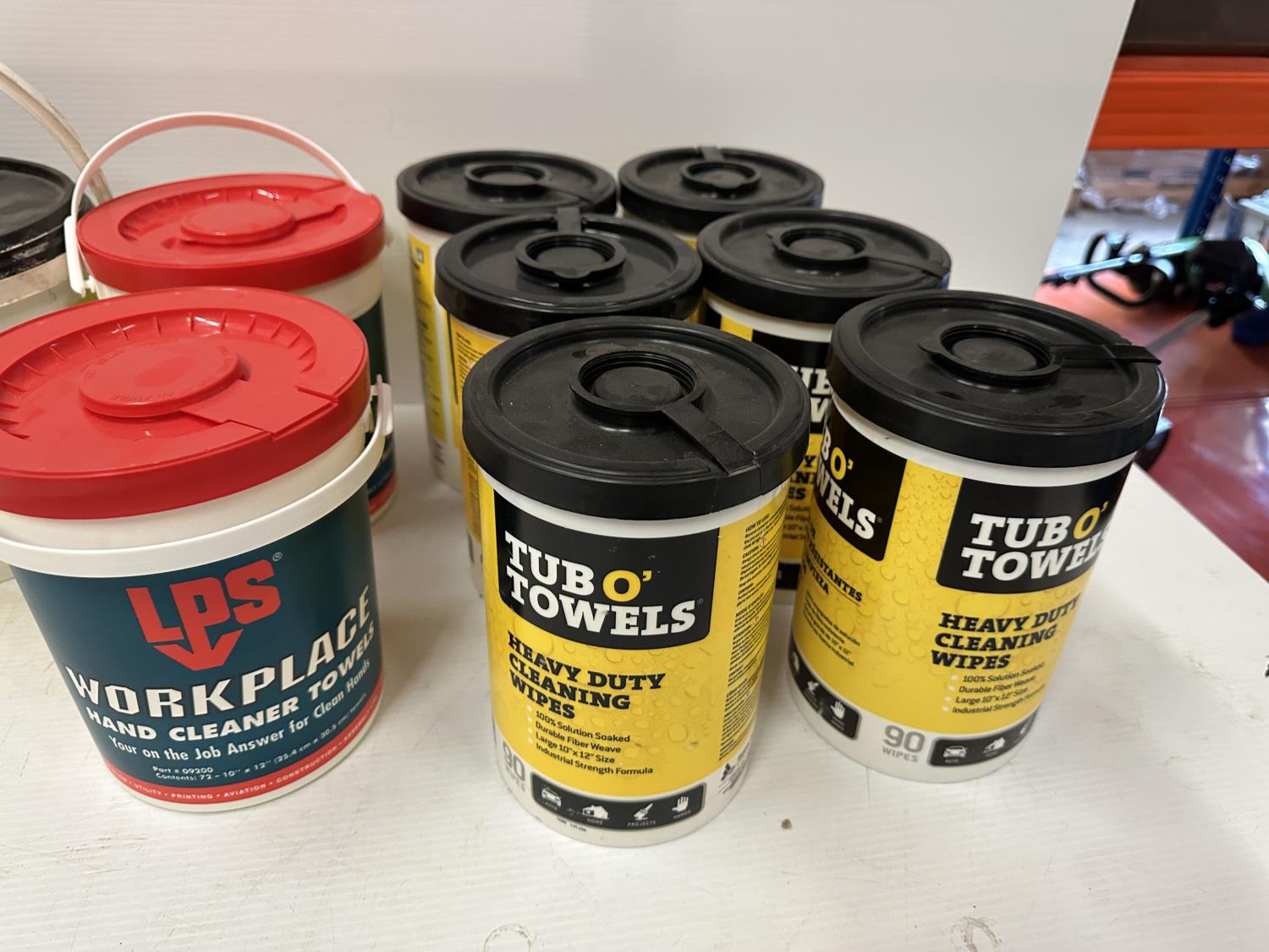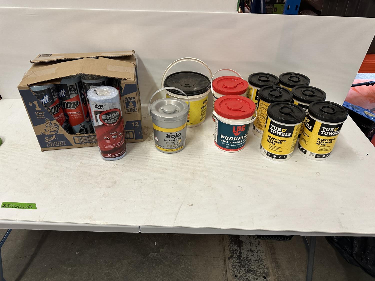 (10) rolls of shop towels, (6) Tub-O' Towels, LPS hand cleaner, Gojo scrubbing wipes,