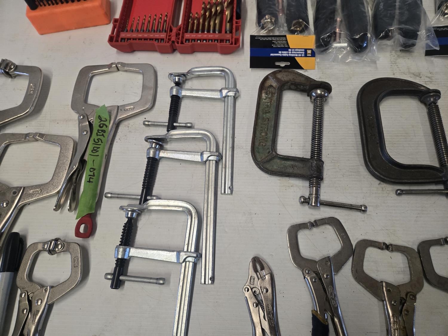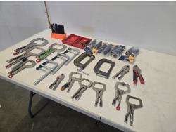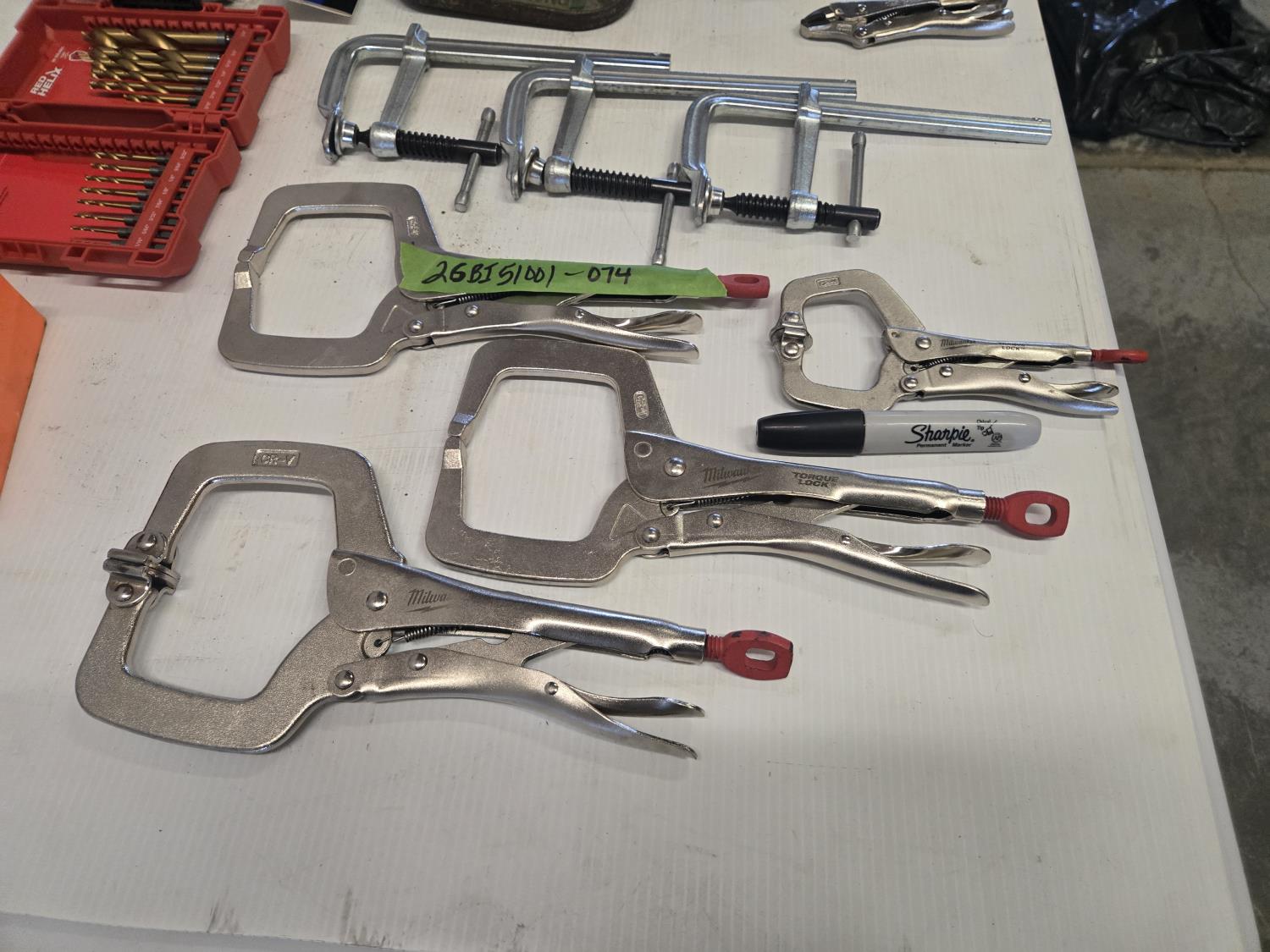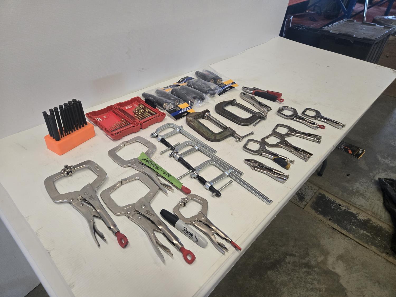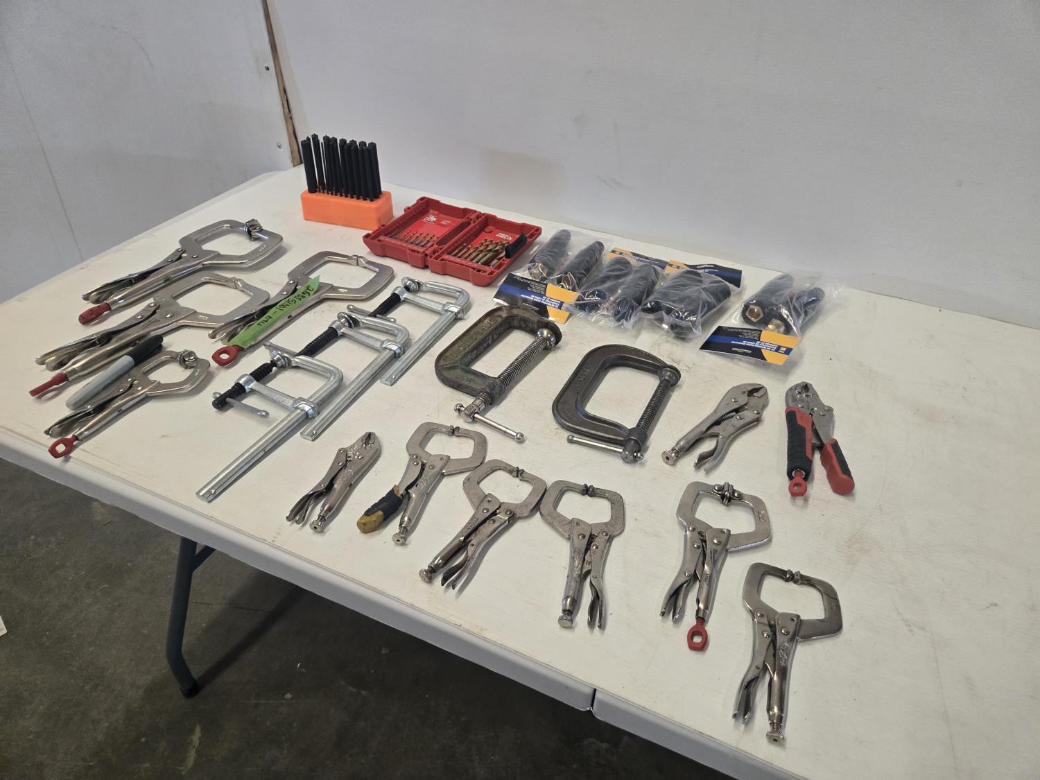(13) various vise grips, (3) Besssey clamps, (2) C clamps, (4) Welding cable connectors, set of transfer punches, Milwaukee drill bit set