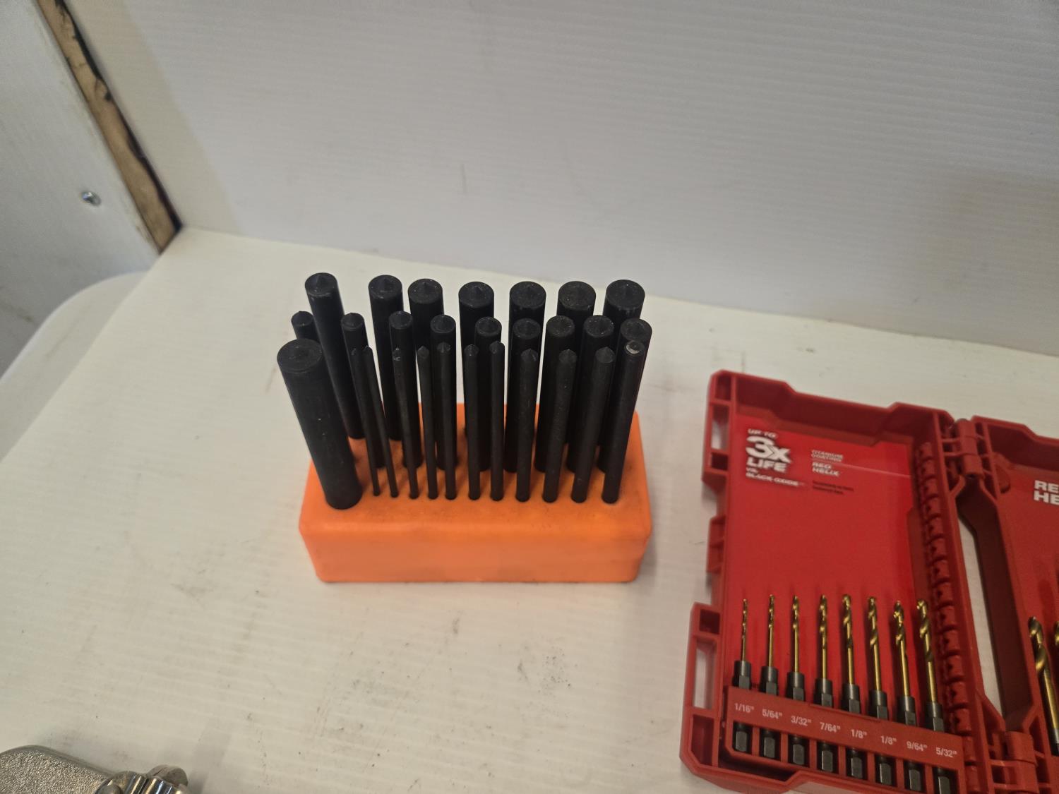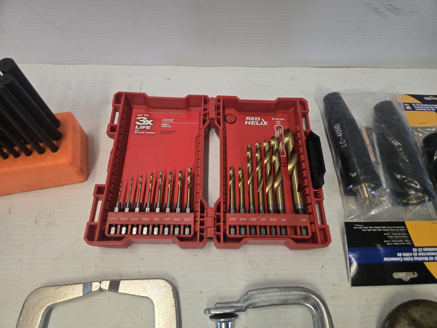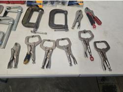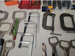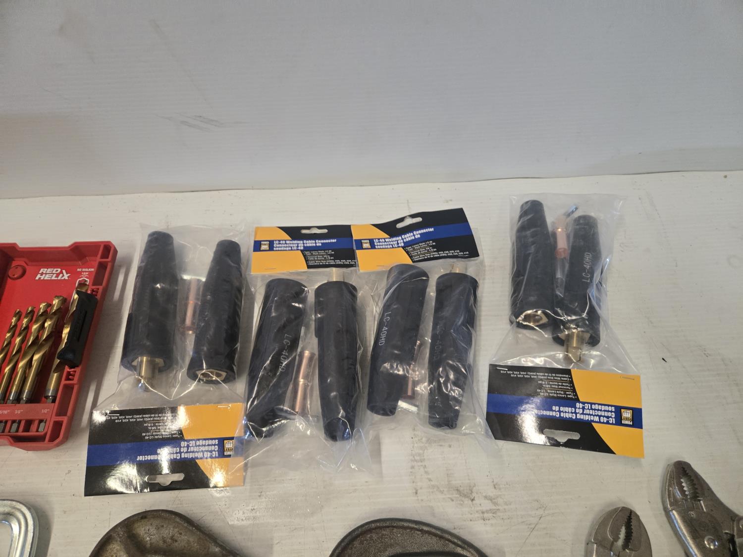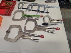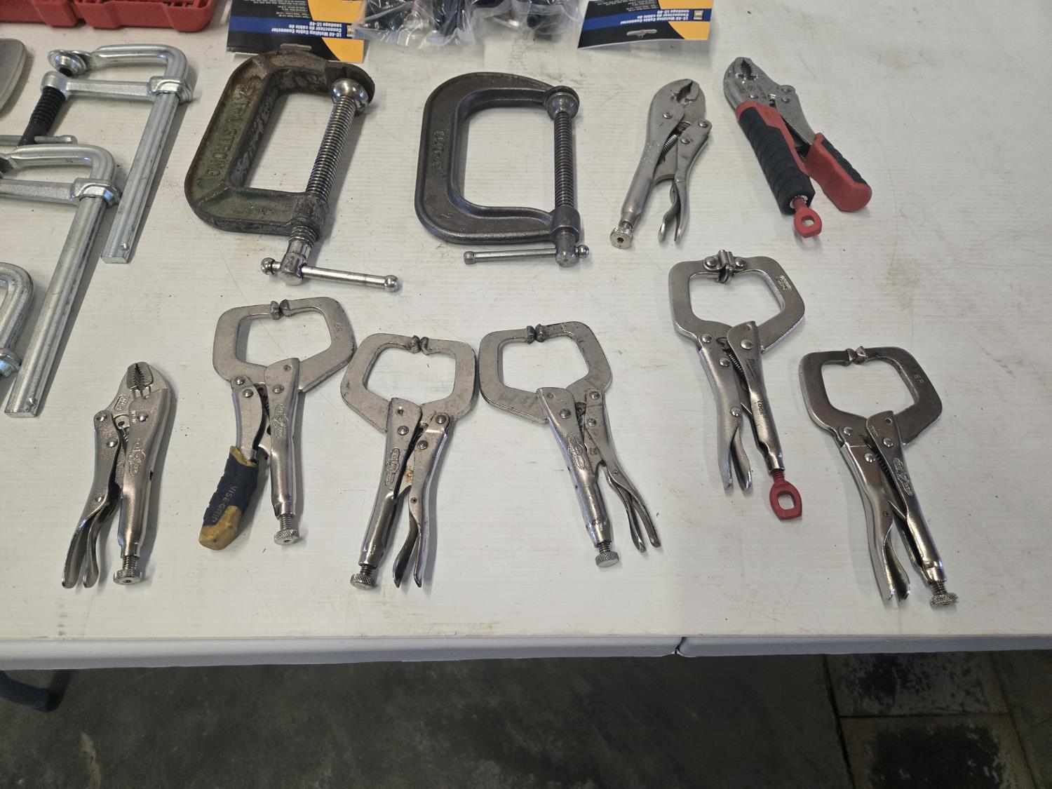 (13) various vise grips, (3) Besssey clamps, (2) C clamps, (4) Welding cable connectors, set of transfer punches, Milwaukee drill bit set