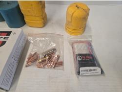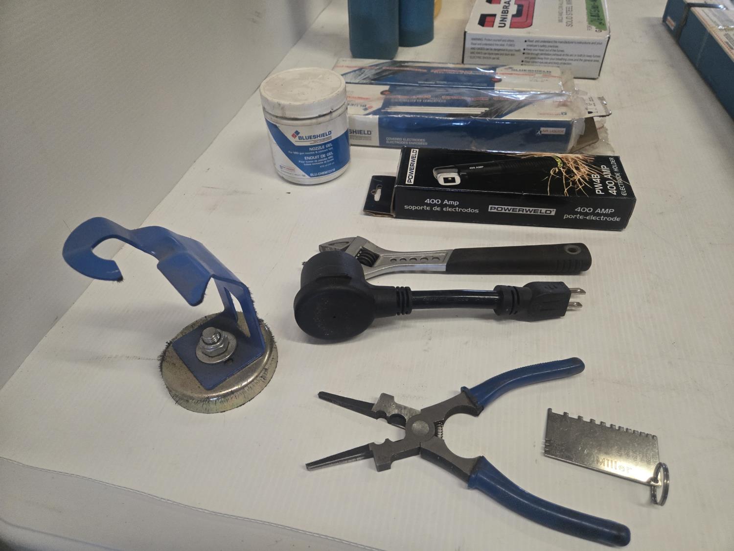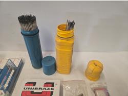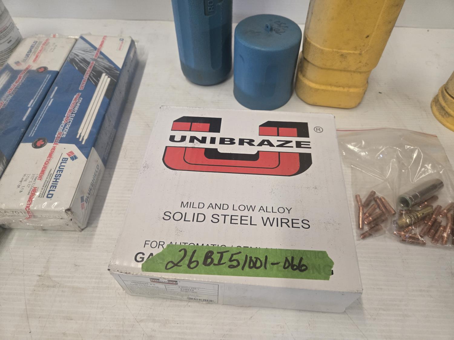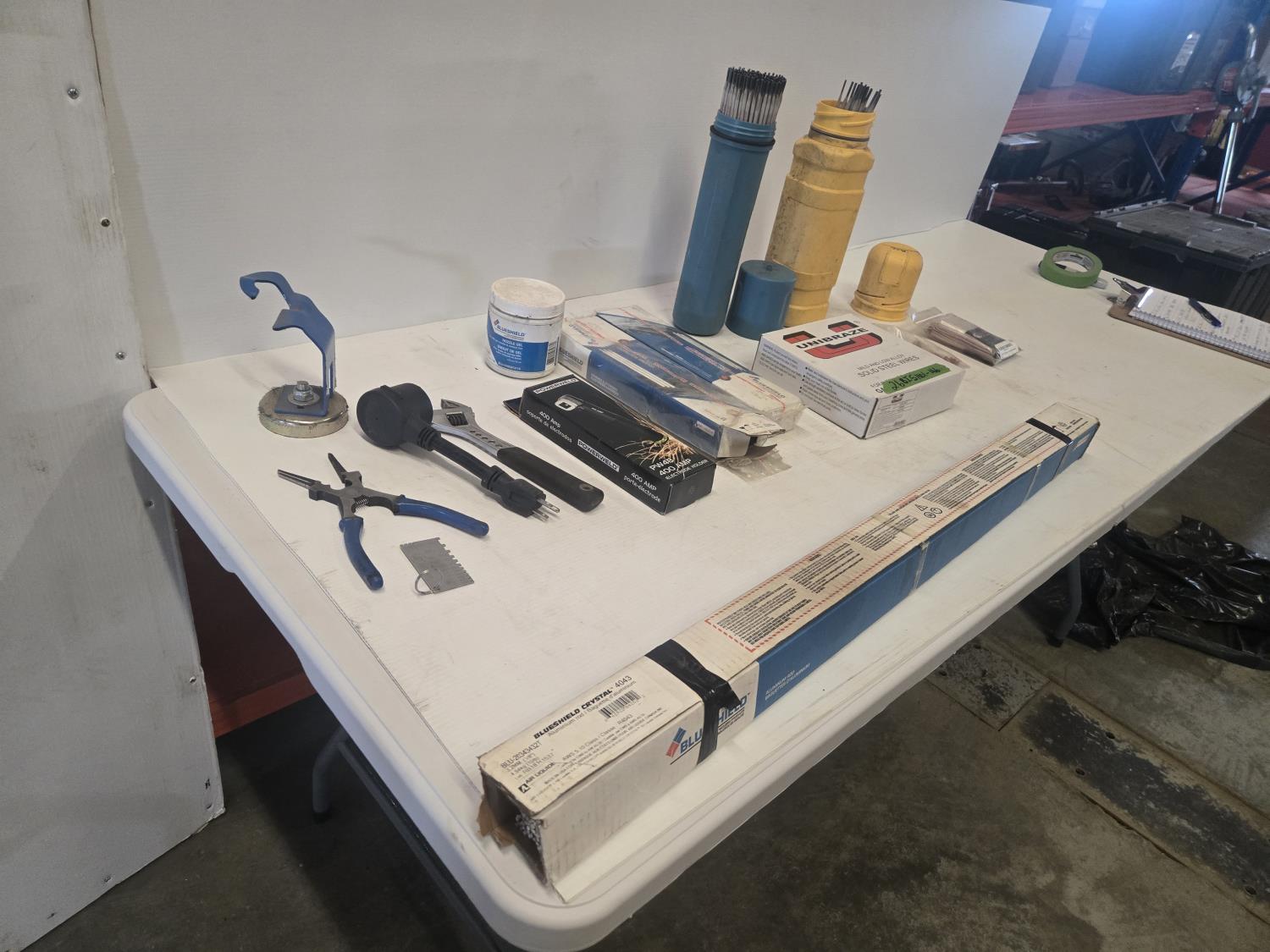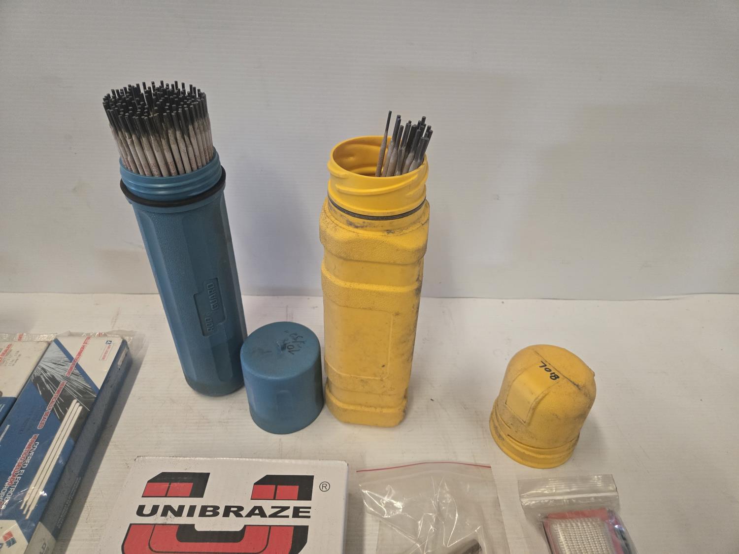 Qty of 1/8 inch aluminum rods, (2) boxes of 7018-3/32 welding rods, (2) rod containers, (1). 035 mig wire, Mig tips, miscellaneous welding tools