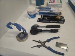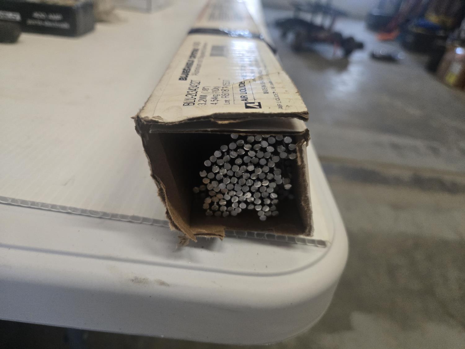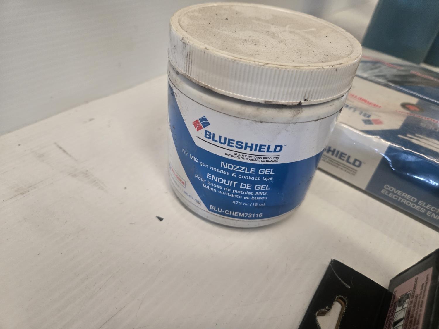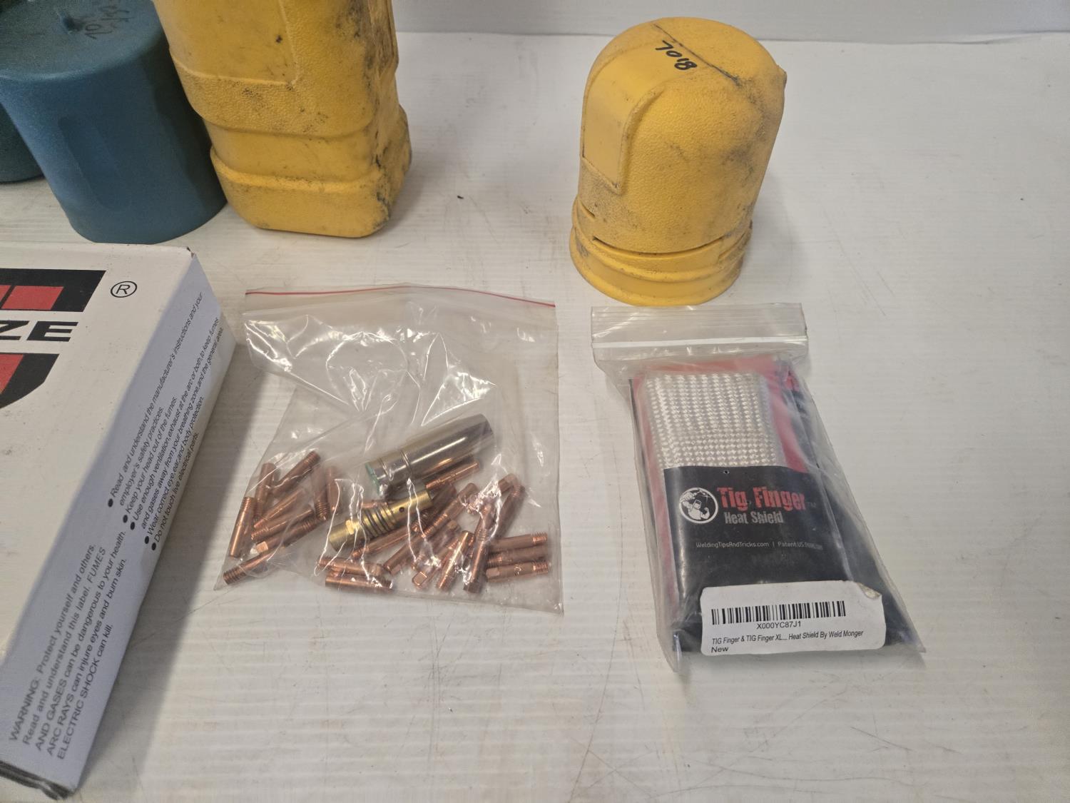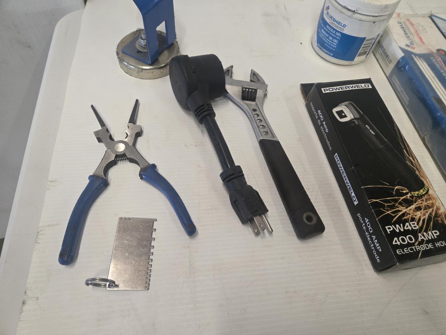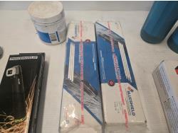 Qty of 1/8 inch aluminum rods, (2) boxes of 7018-3/32 welding rods, (2) rod containers, (1). 035 mig wire, Mig tips, miscellaneous welding tools