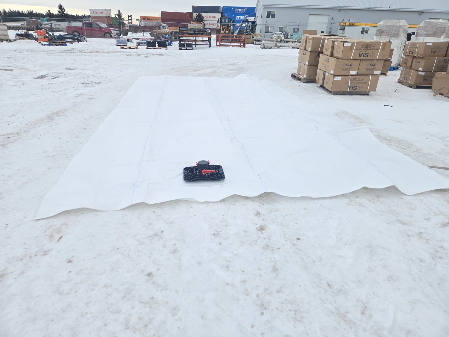 with ball valve with retention plate, bag measures 12 ft wide X 22 ft 8 inch long