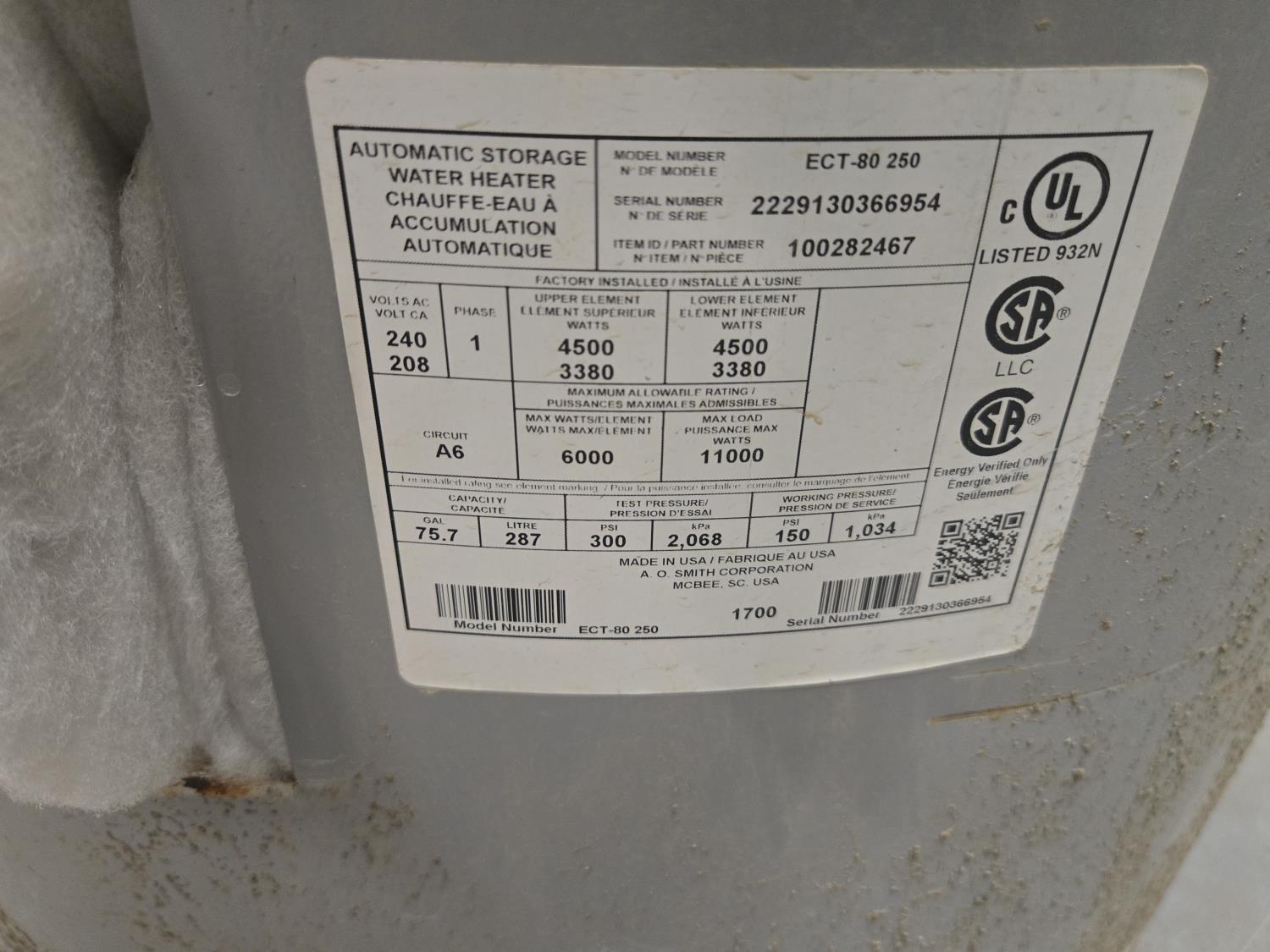 AO Smith ECT-80 250 Electric Water Heater