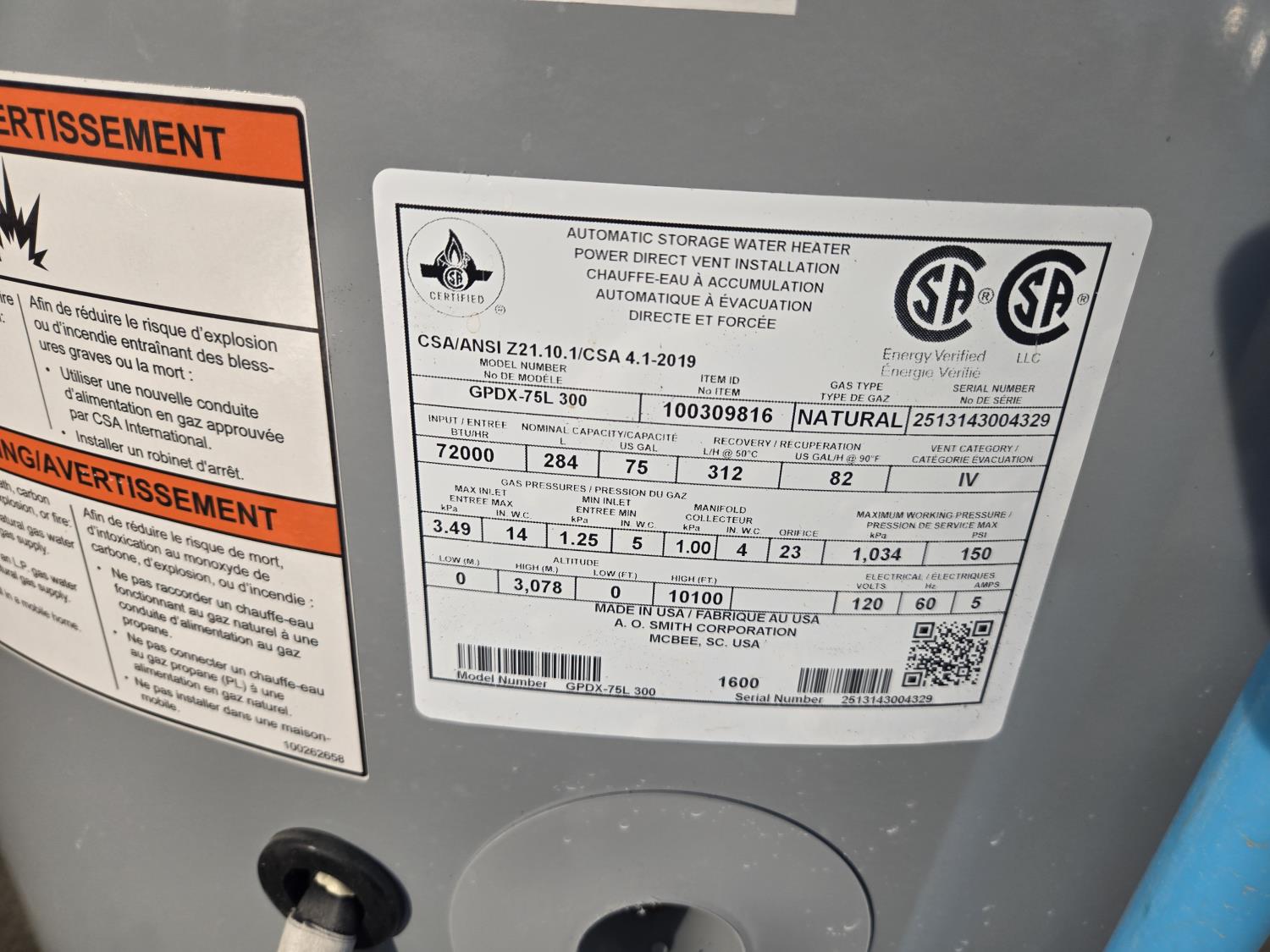 AO Smith GPDX-75L-300 75 US Natural Gas Hot Water Heater (Inoperable)