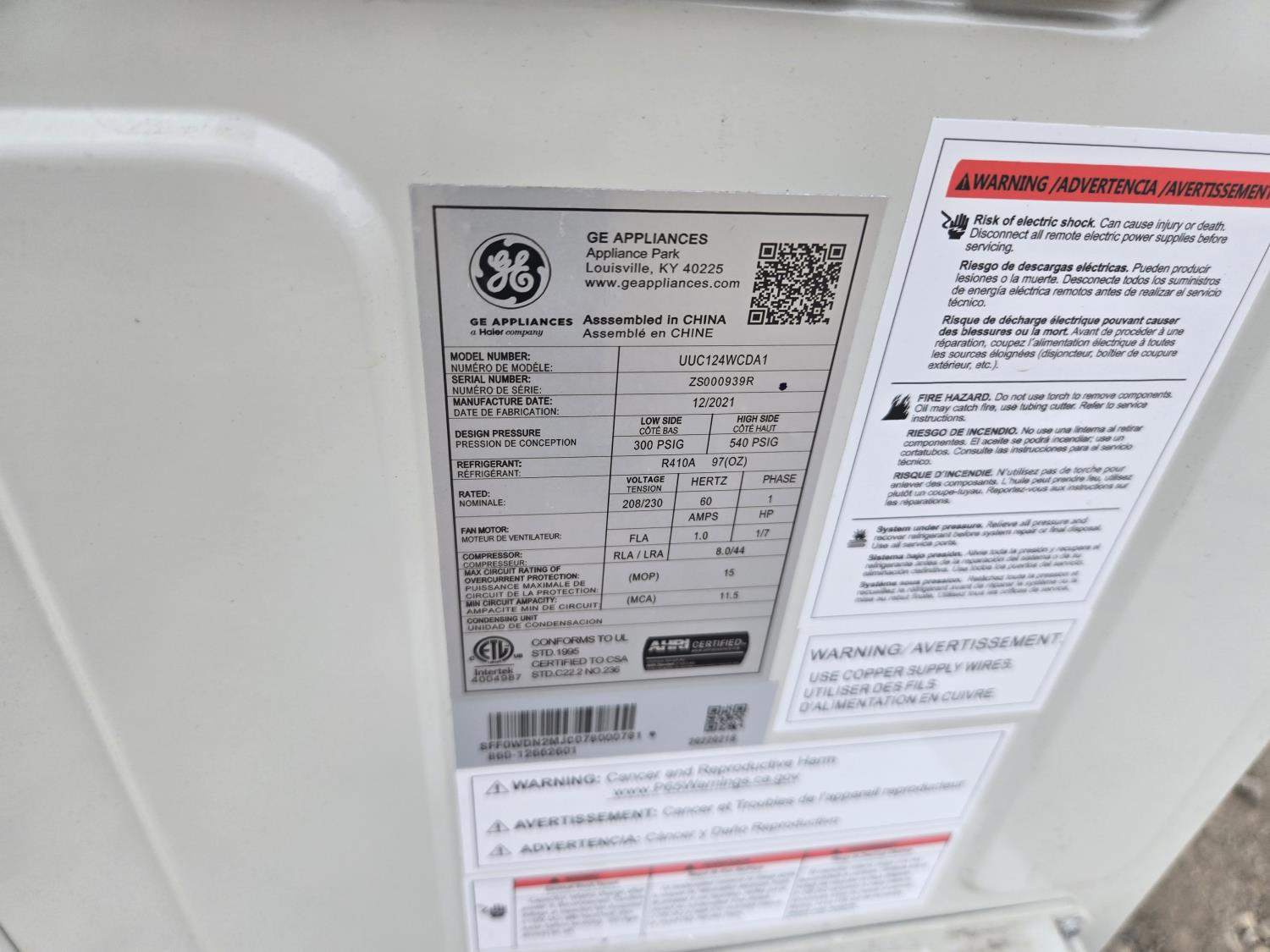General Electric UUC124WCD1 Side Discharge Condensing Unit