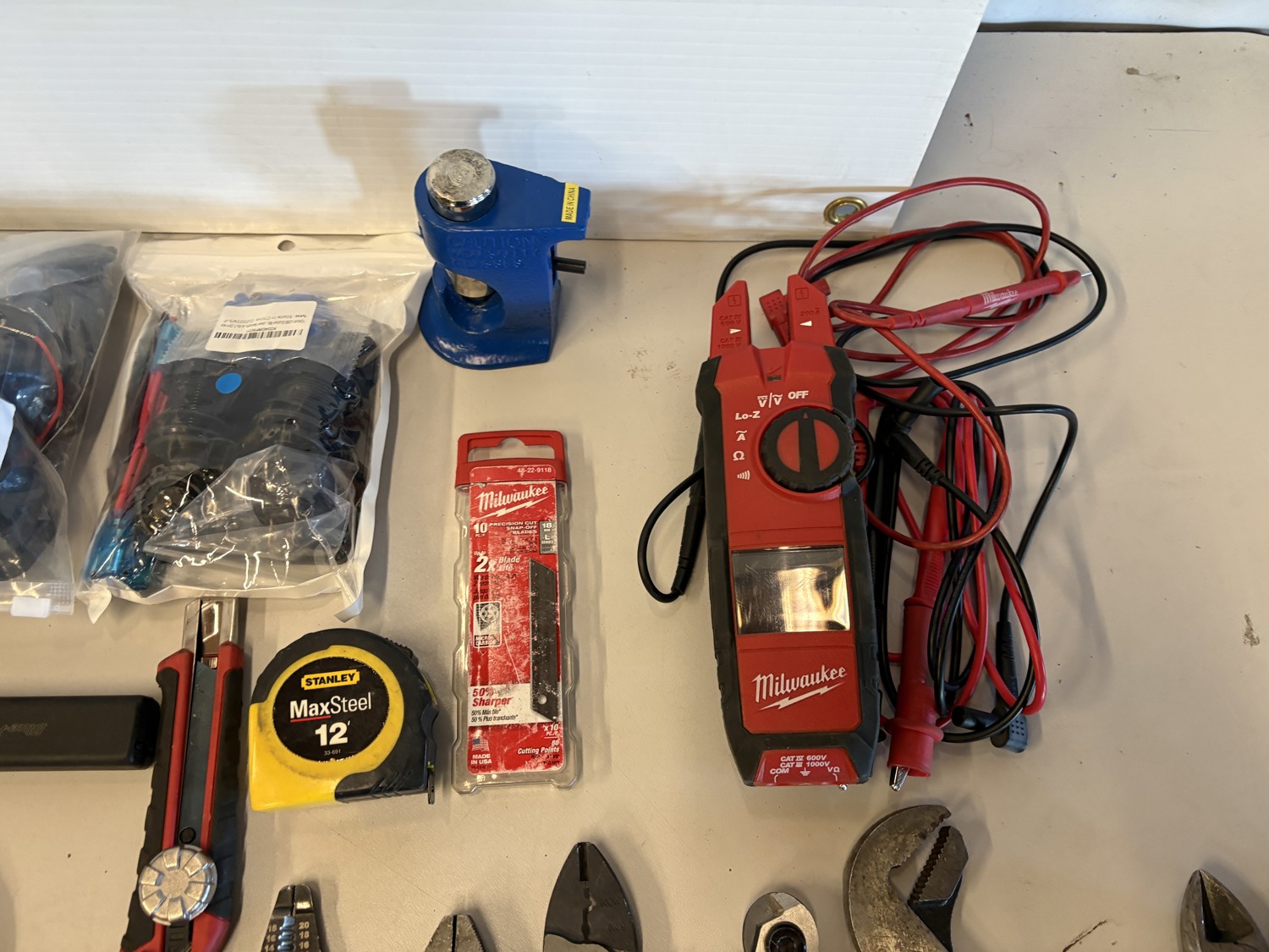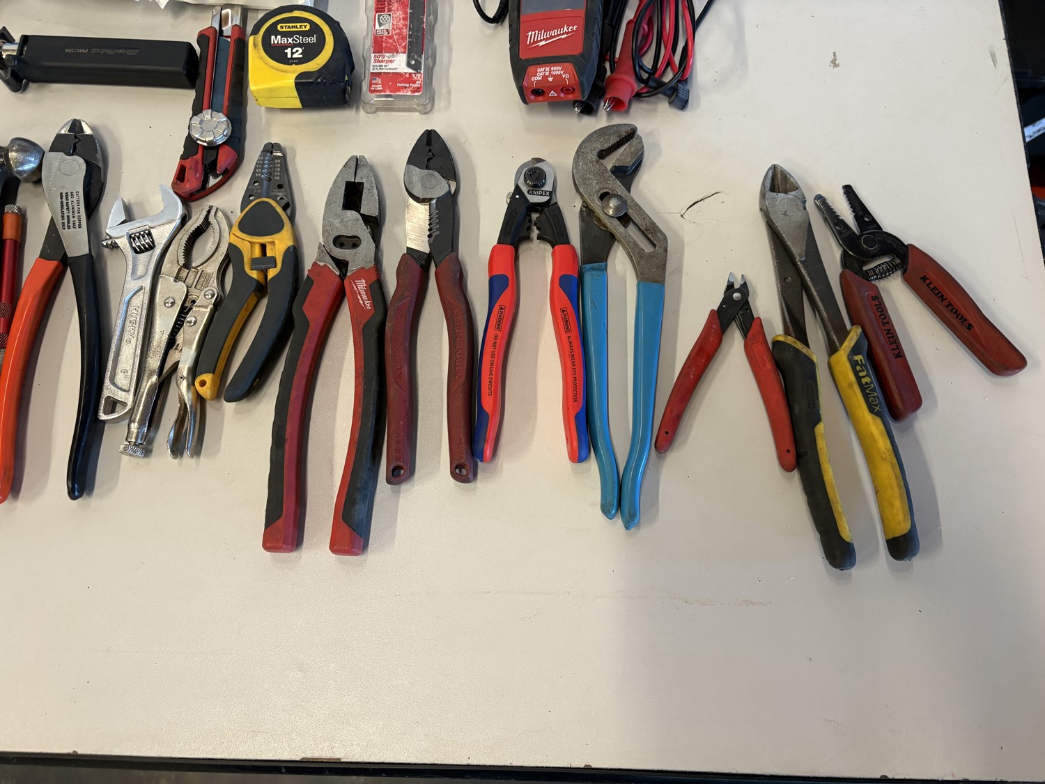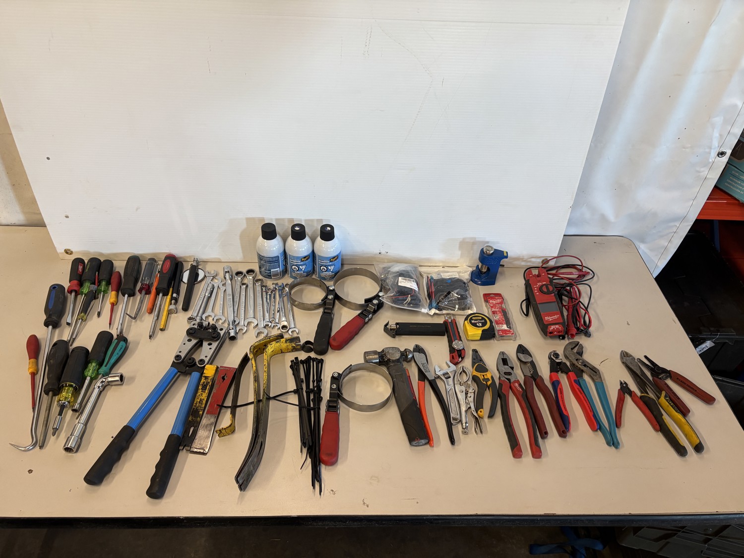 Screwdrivers, plyers, cutters, pry bars, wrenches, oil filter tools, milwaukee volt meter