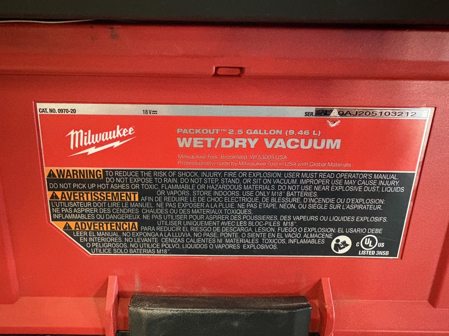 7297 Milwaukee 0970-20 Packout 2.5 Gallon Wet/Dry Vacuum