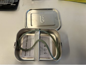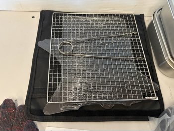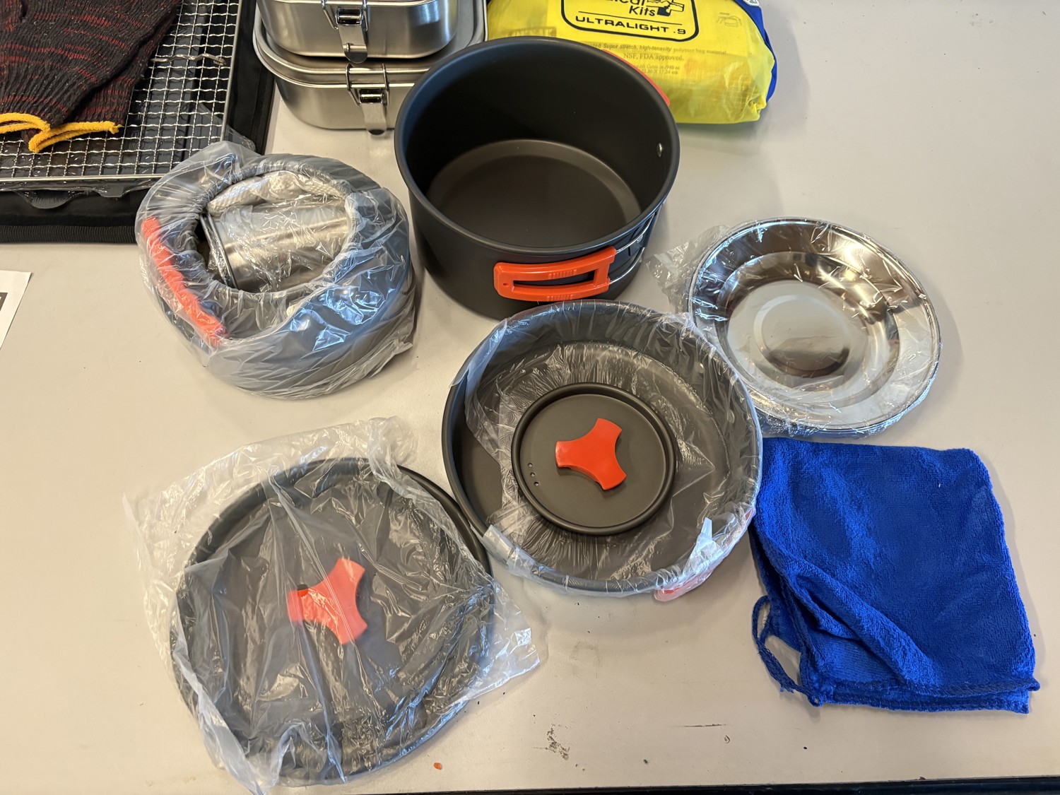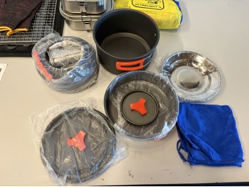 Pots, kettle, metal lunch boxes, first aid kit