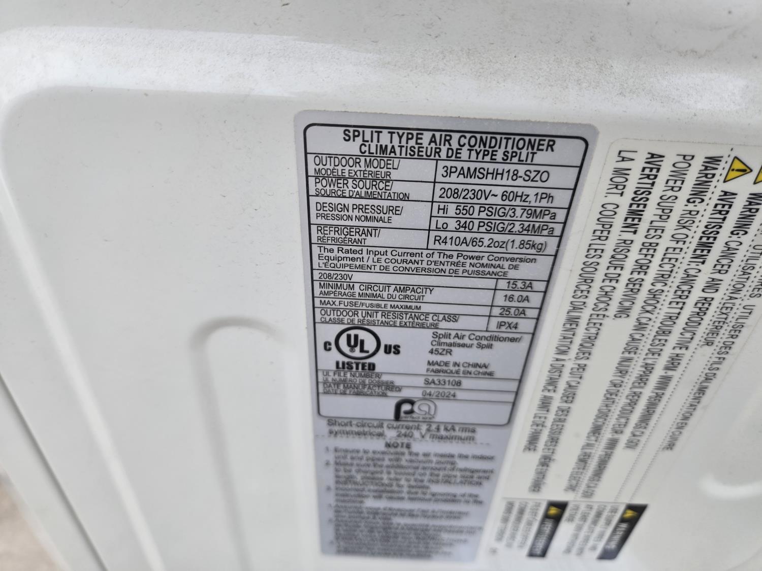 Perfect Aire 3PAMSHH18-SZO Split Type A/C Unit (Unused)