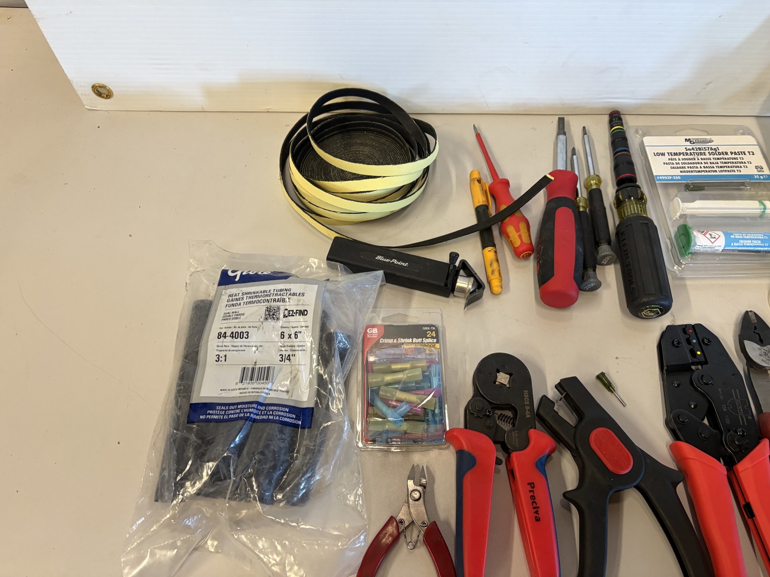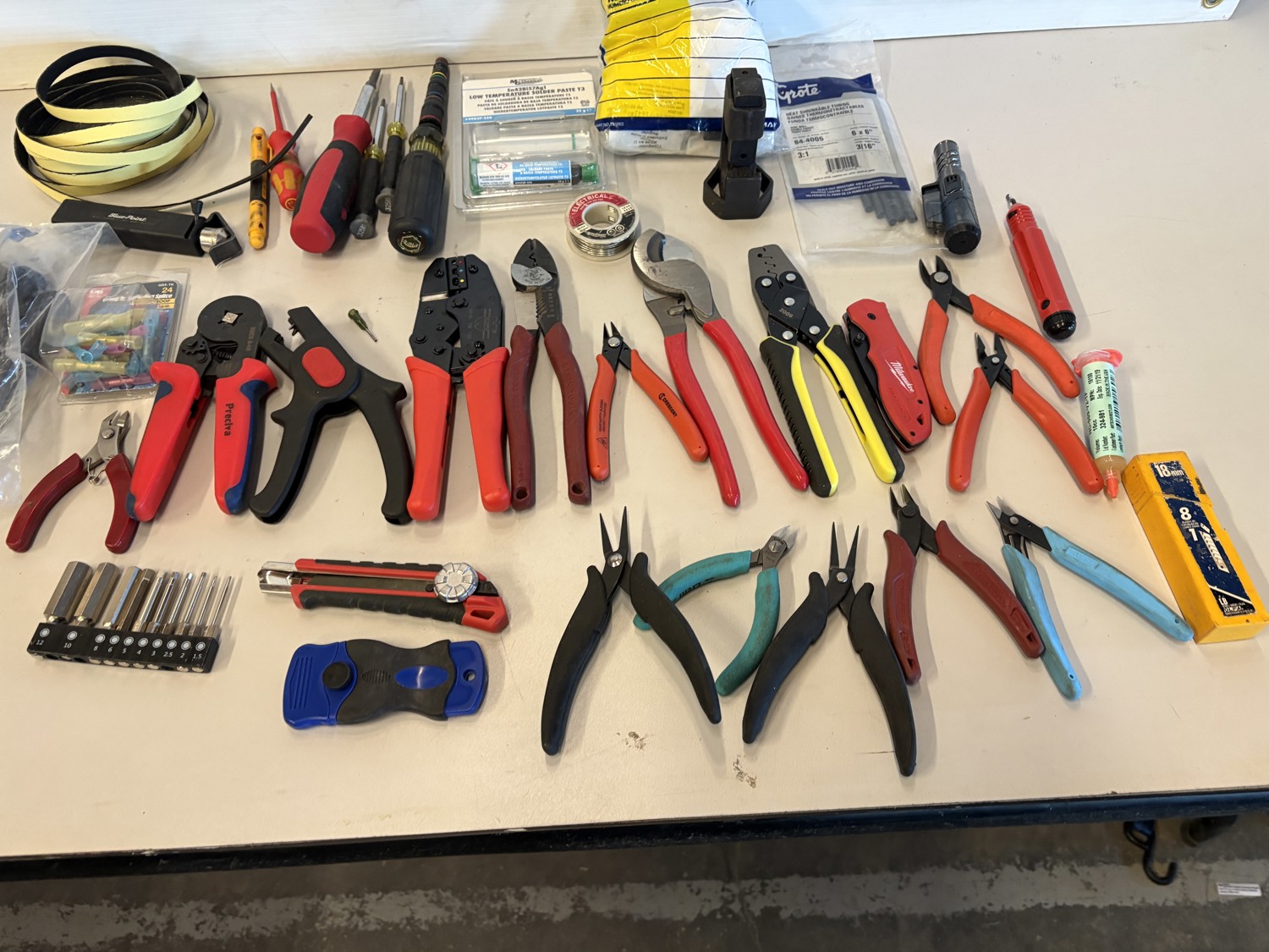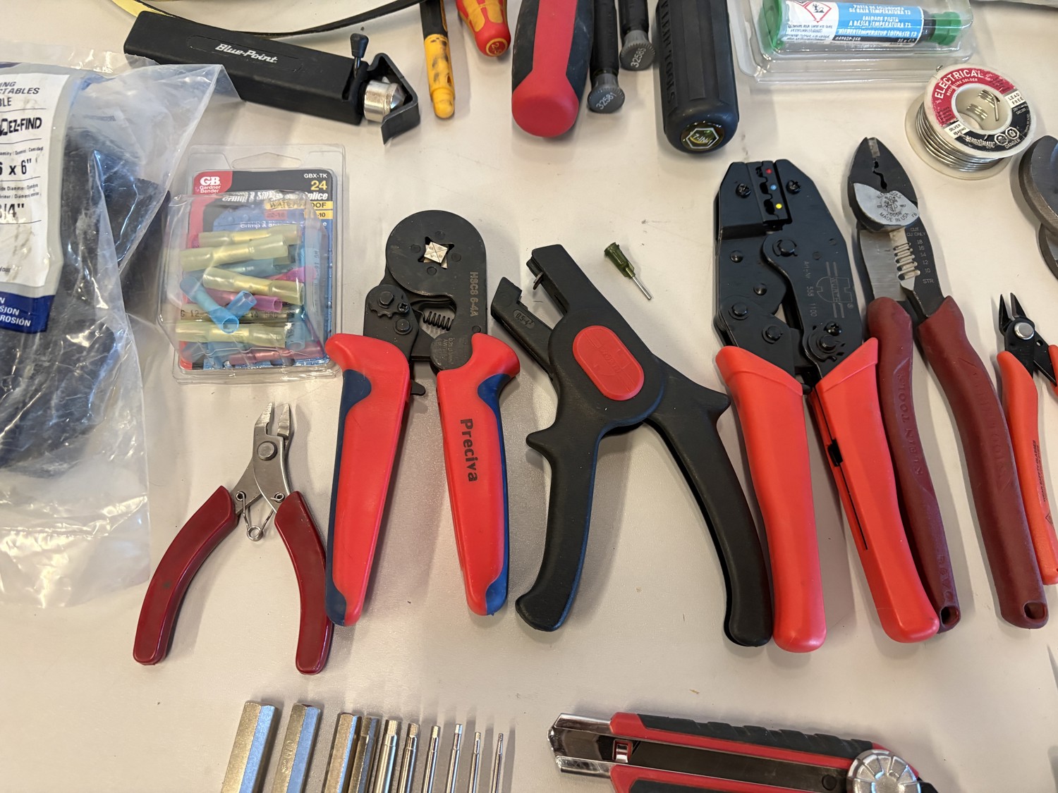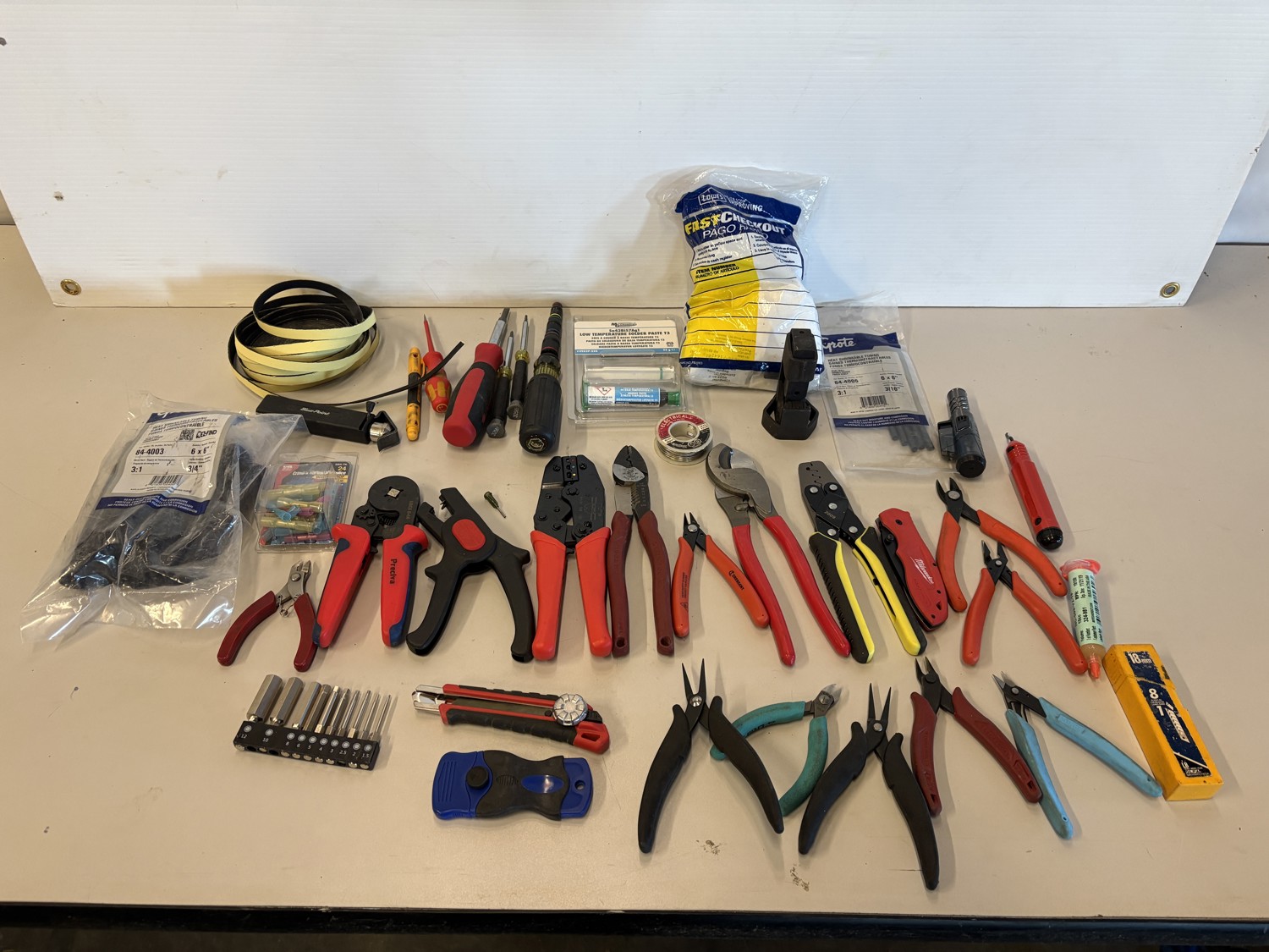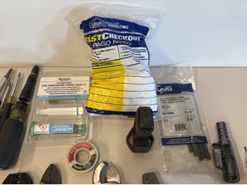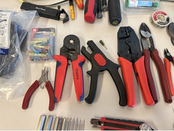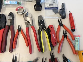 Cutters, crimps, screwdrivers, heat shrink tube, nuts & bolts