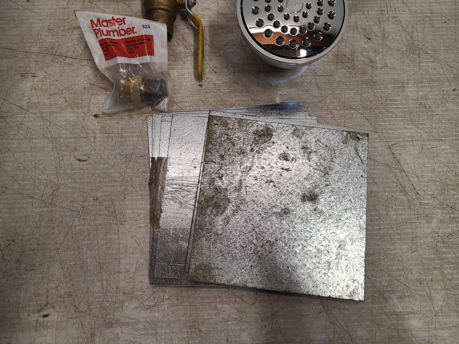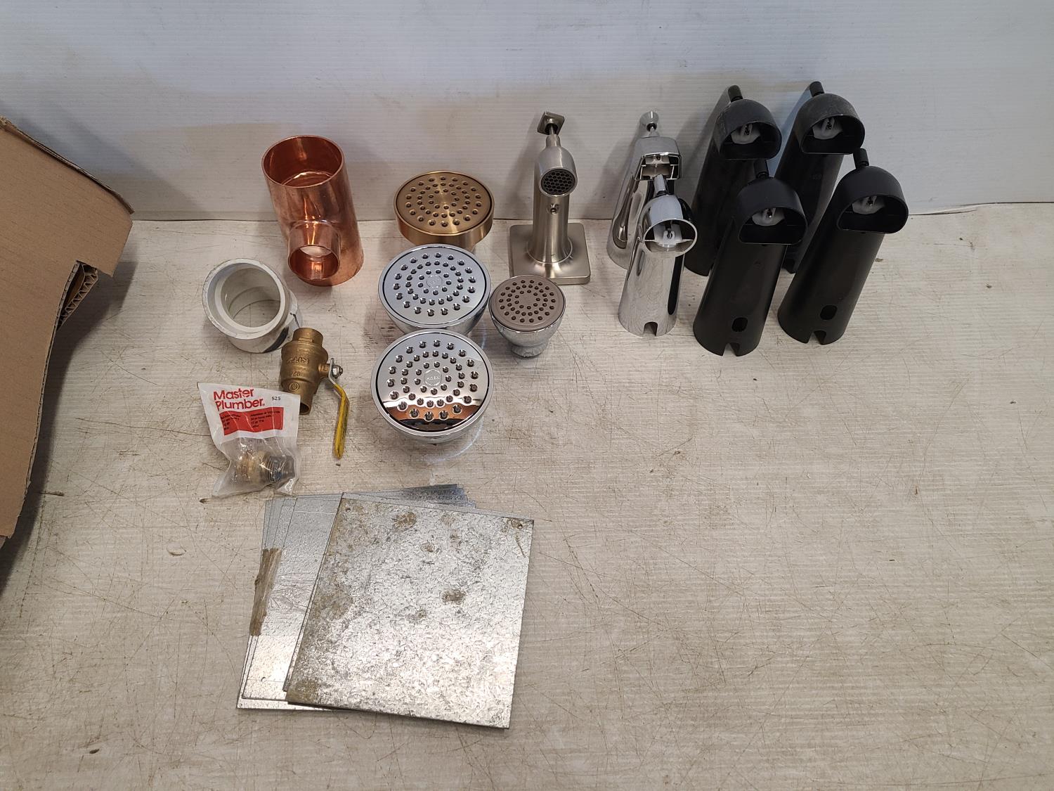 Drains, shower heads, shutoff valve, copper T fitting