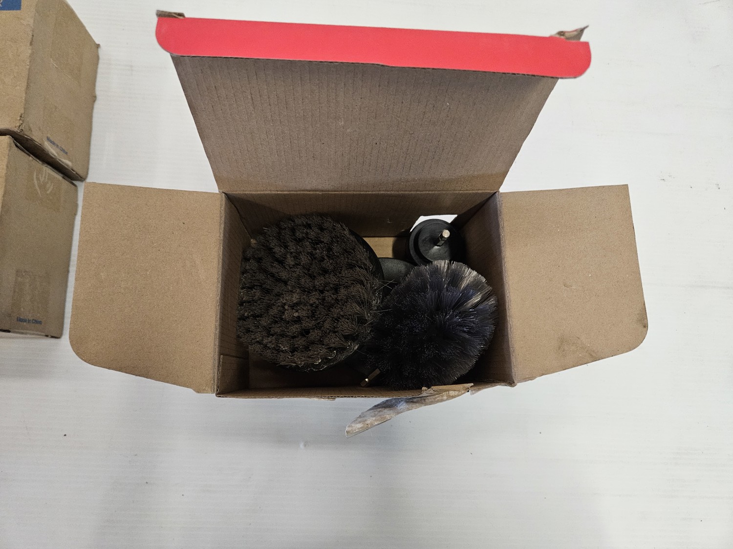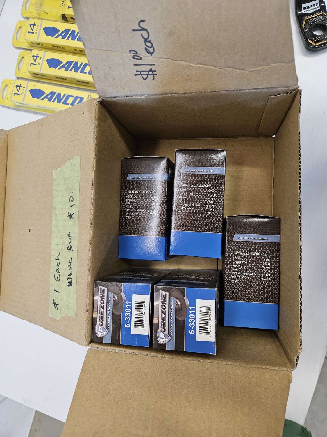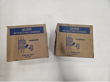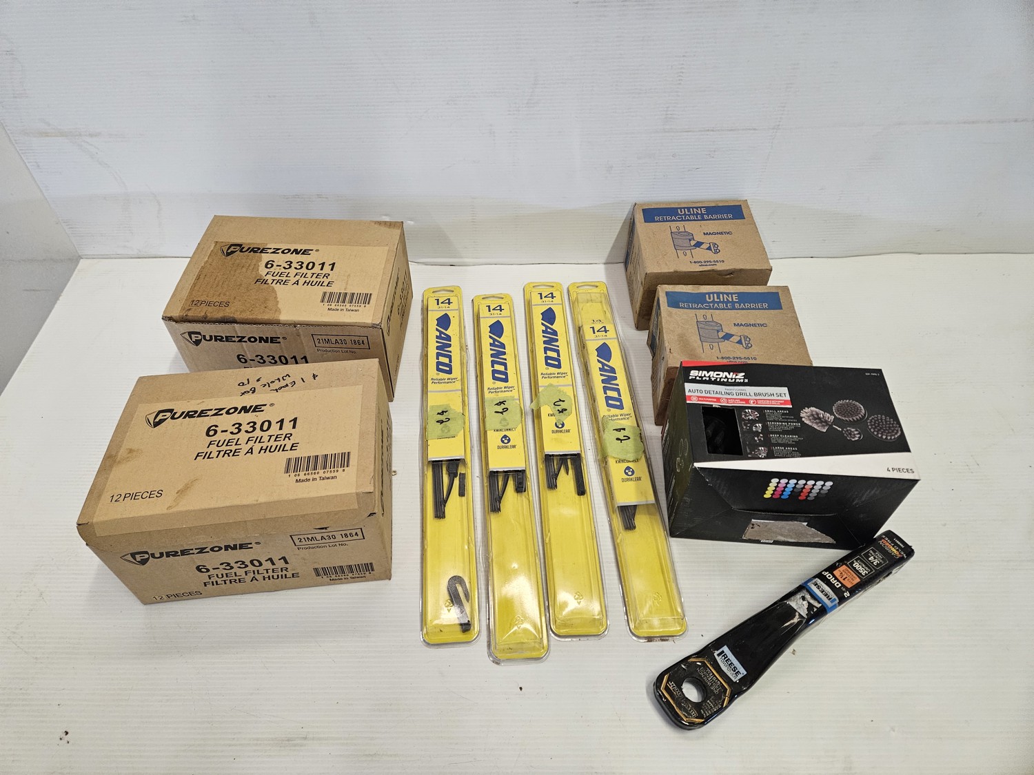 (2) Uline retractable barriers, (1) 2 inch drop trailer hitch, (1) auto detailing drill brush set, (17) pure zone fuel filters, (4) 14 Inch wiper blades