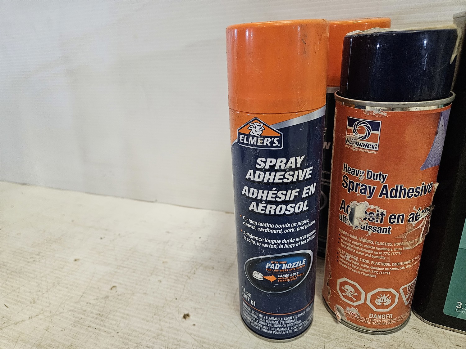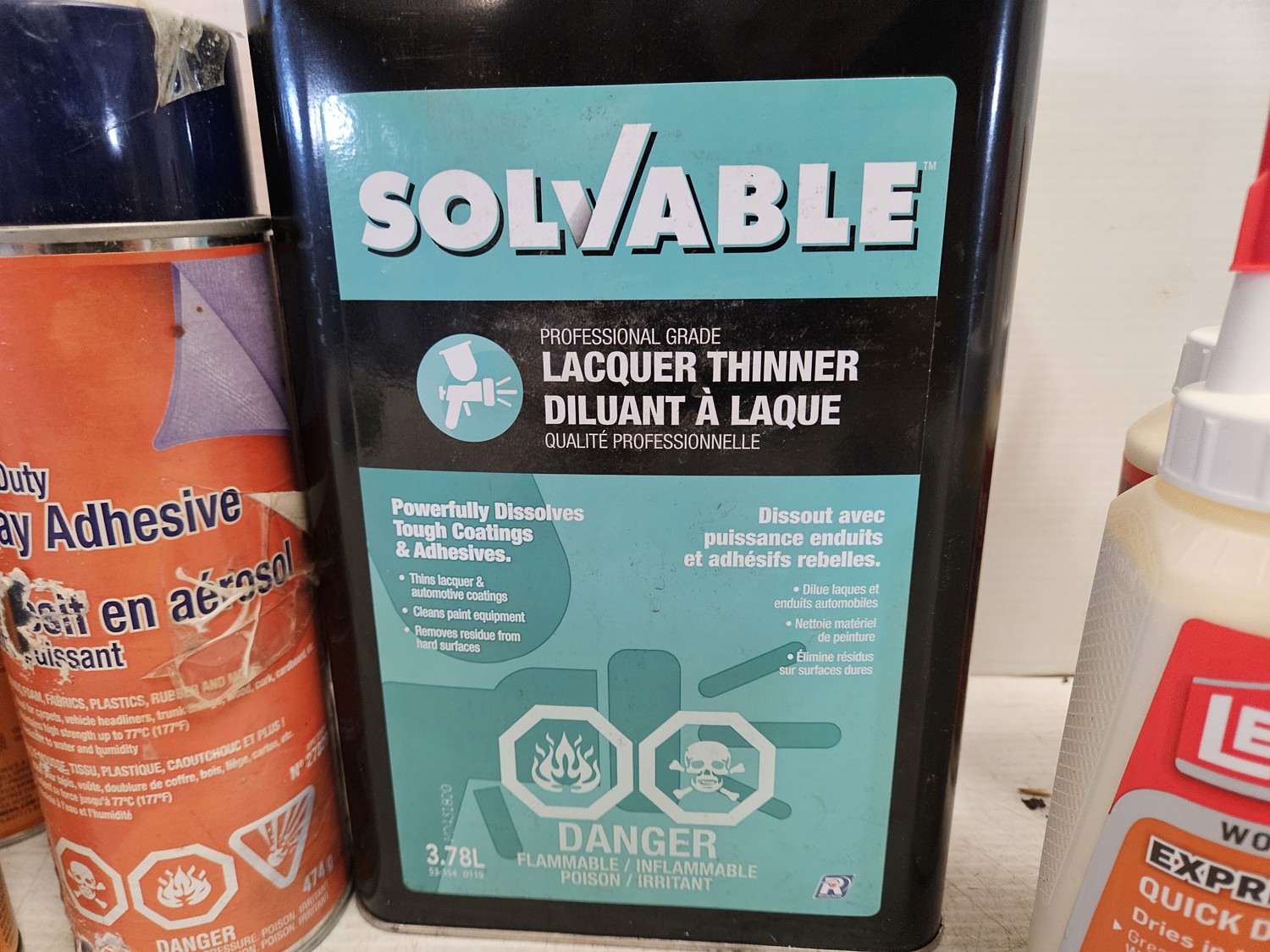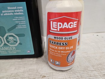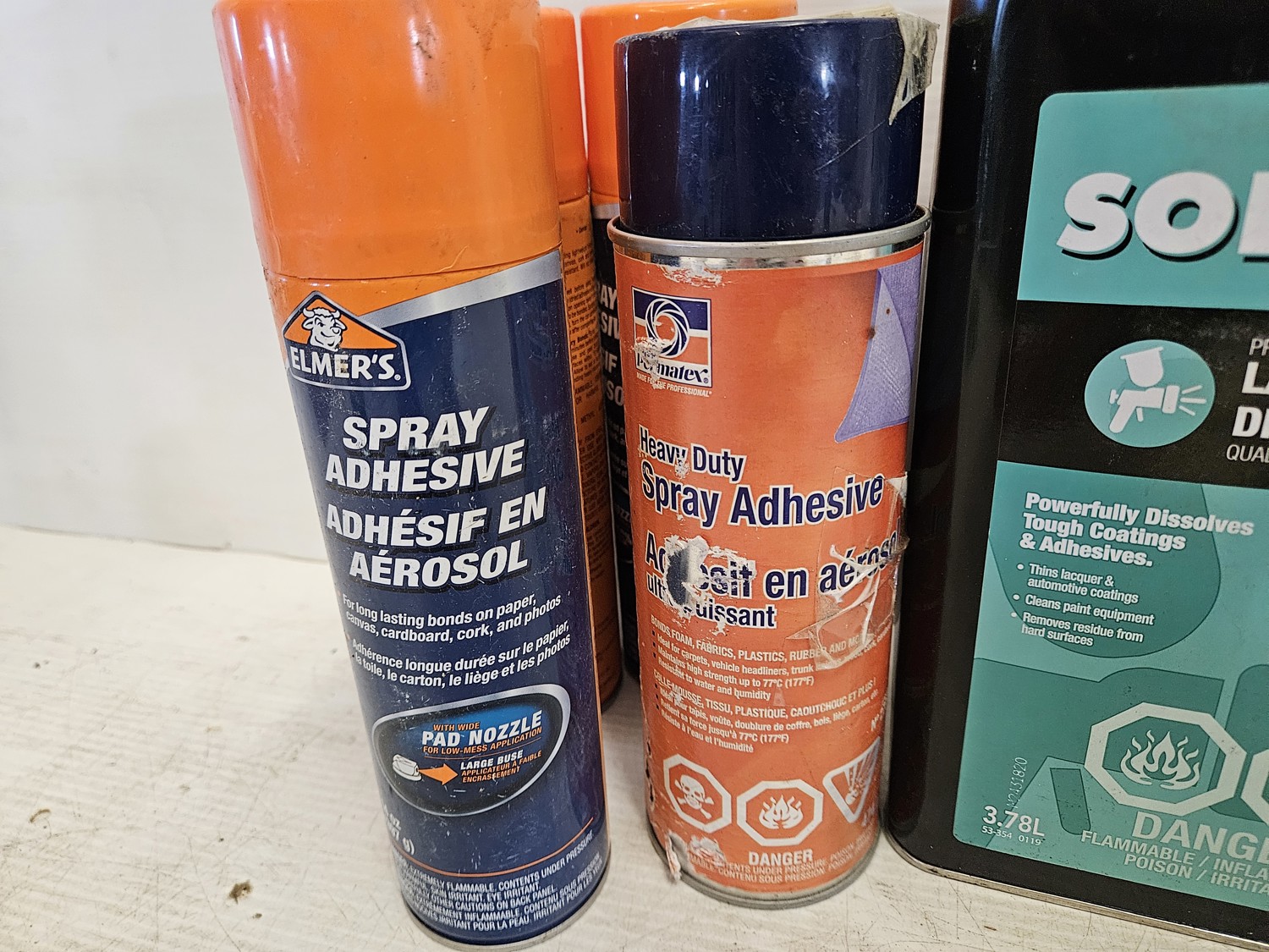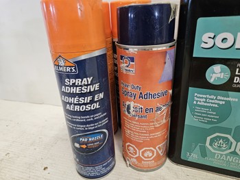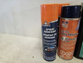 (3) Elmer's spray adhesive, (1) Permatex heavy duty sray adhesive, (2) Lepage liquid glue, (1) Solvable professional grade lacquer thinner
