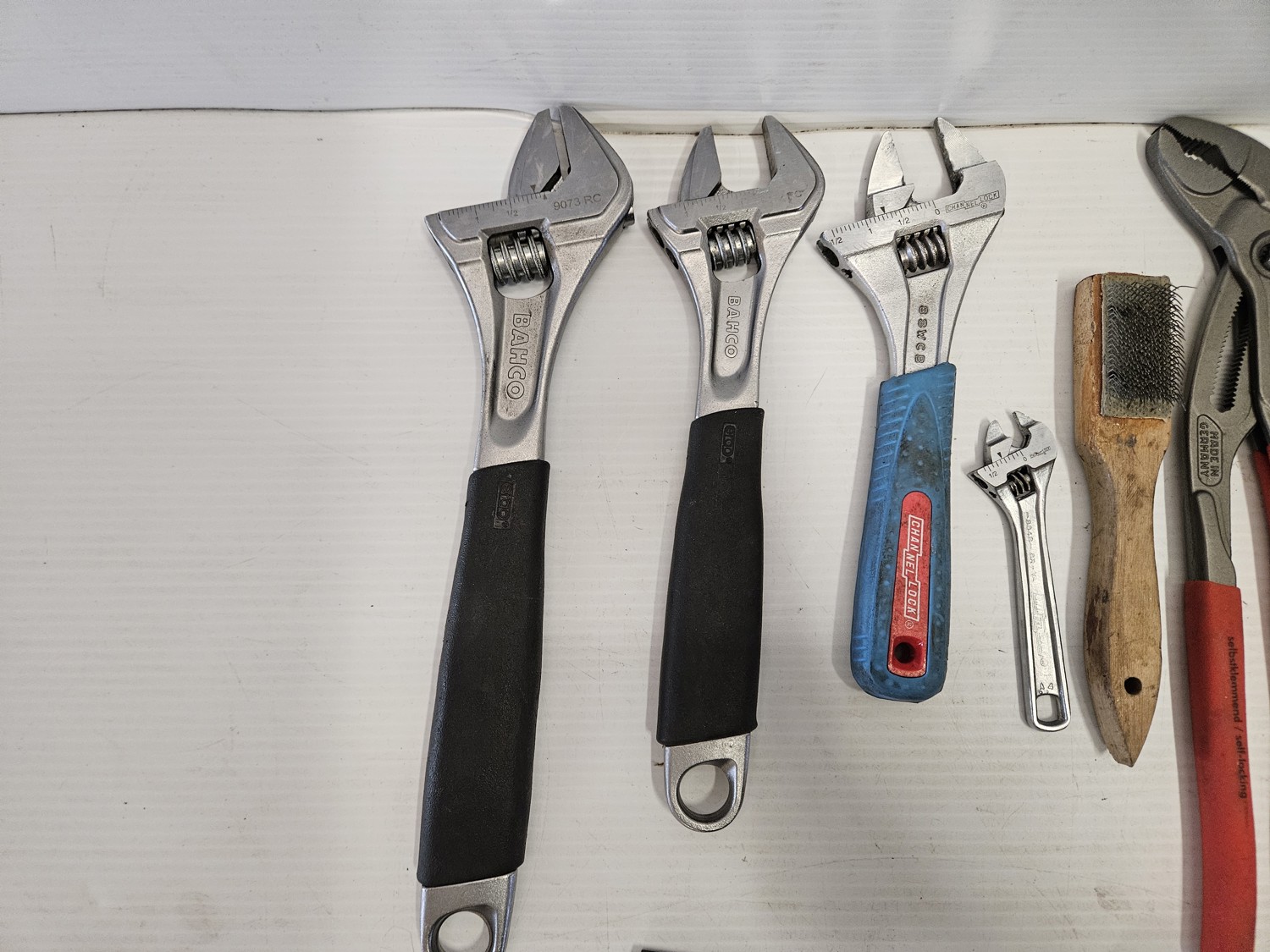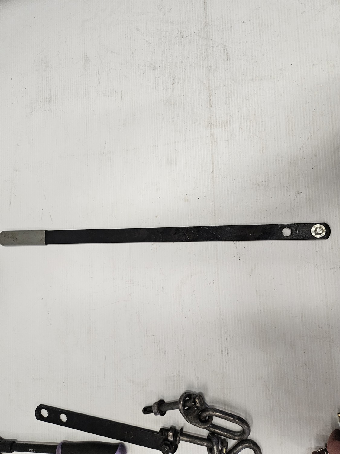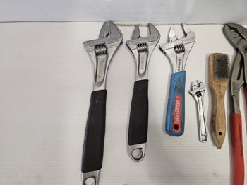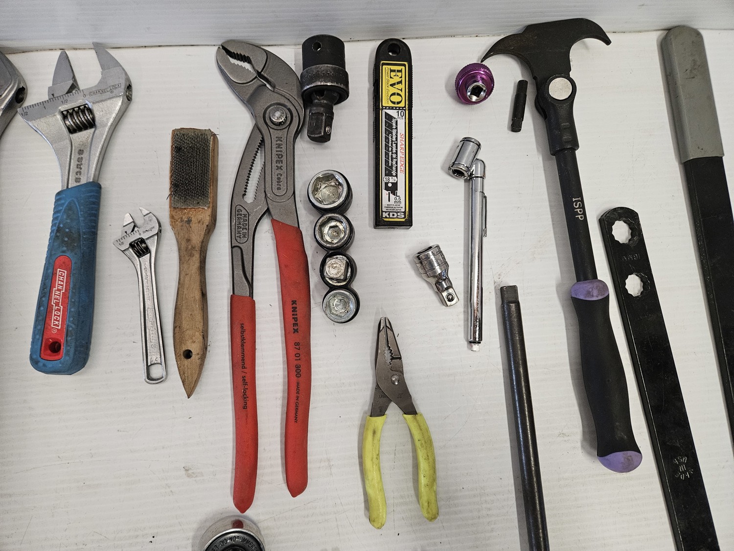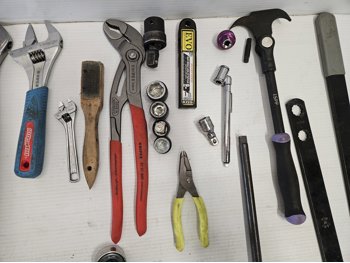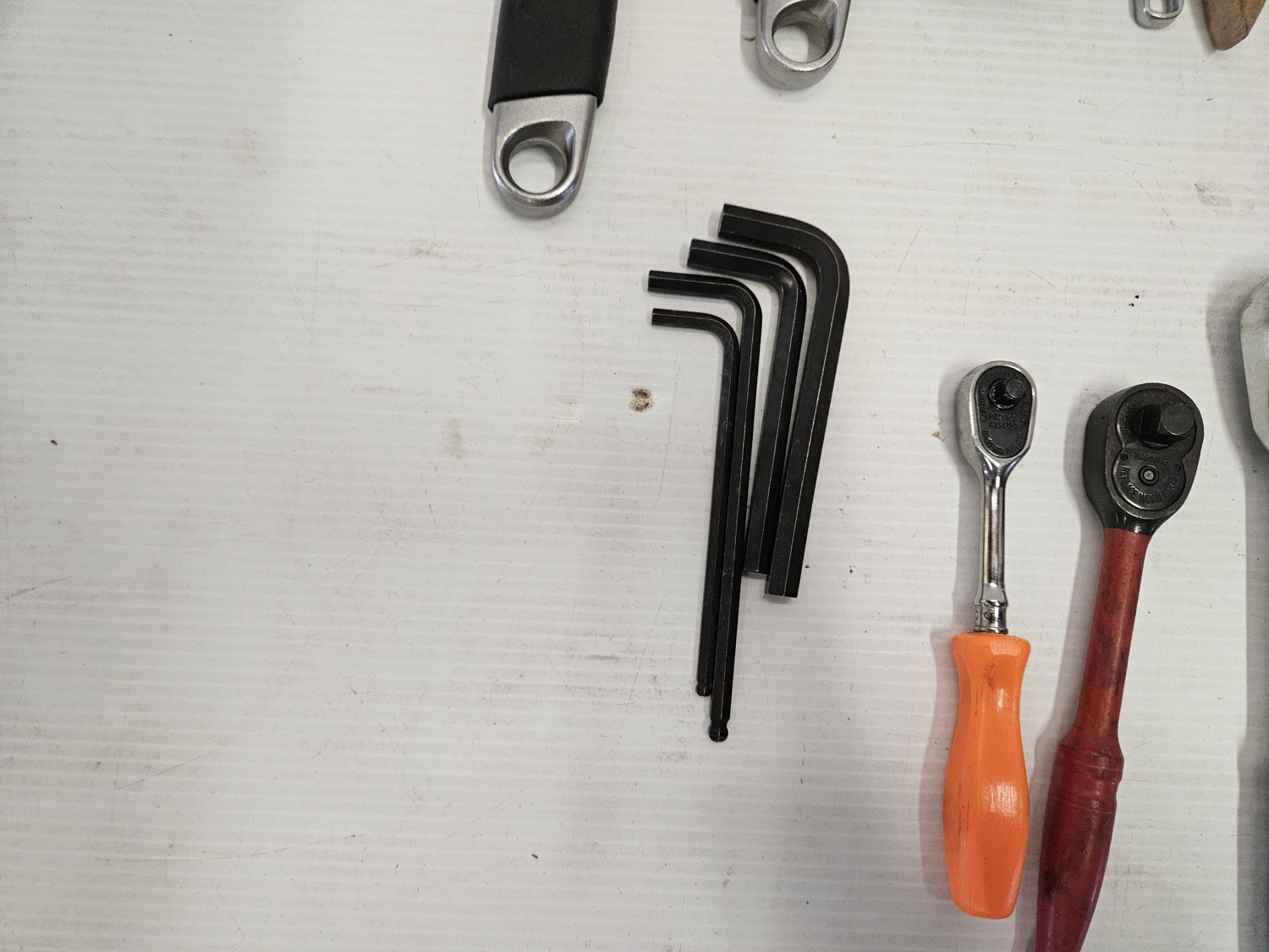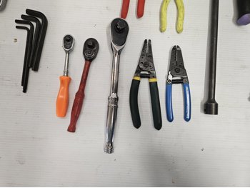 (4) socket wrenches 3/8 inch & 1/2 inch (3) wire strippers/cutters (4) allen keys, (2) socket extensions (1) spinning socket extension (1) wire brush (1) spark plug (1) tire pressure gauge (1) pry bar/claw
