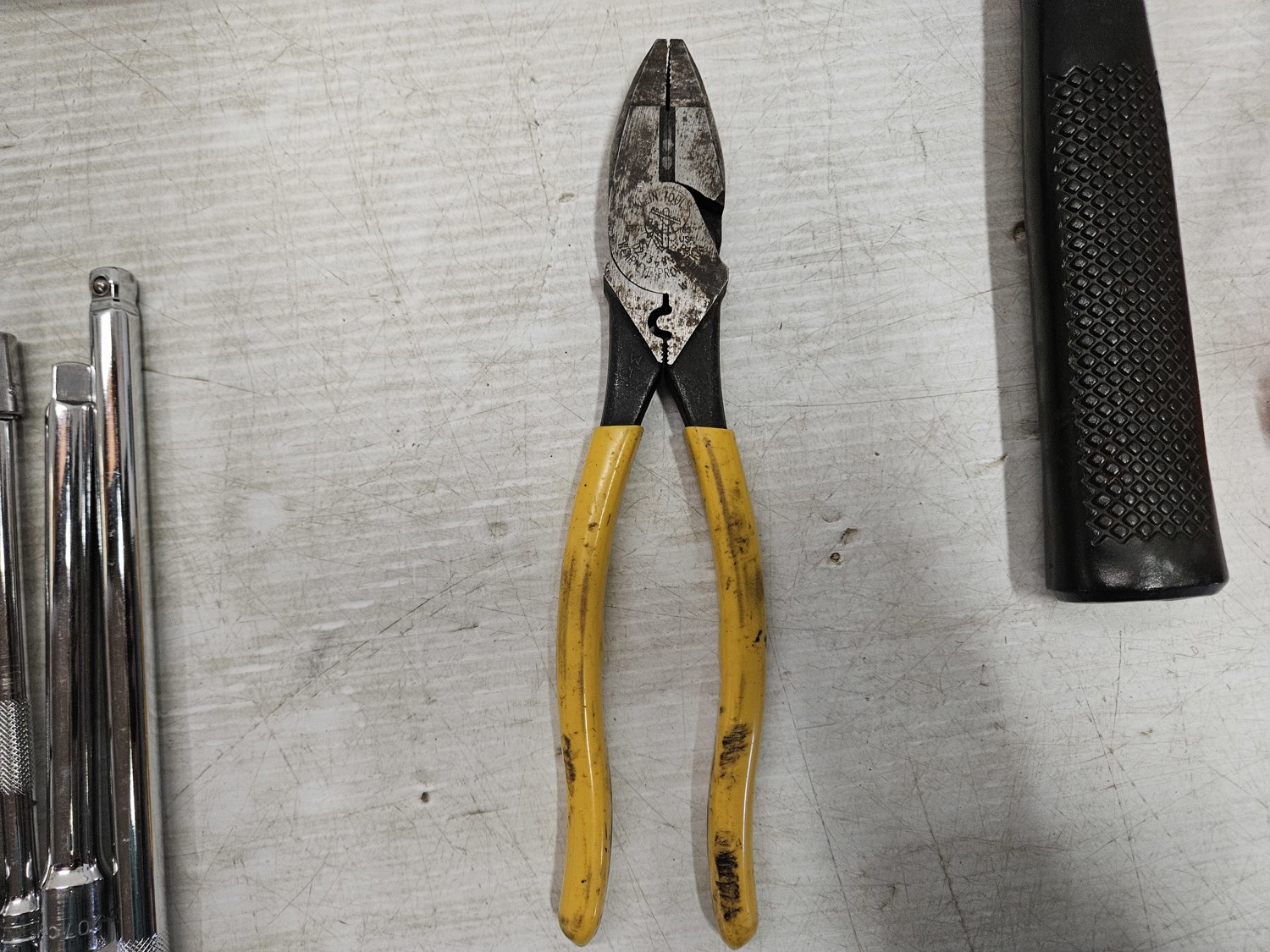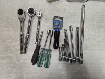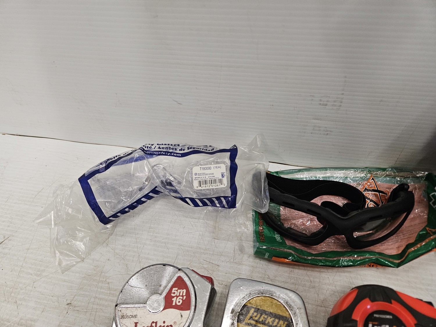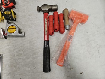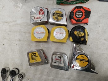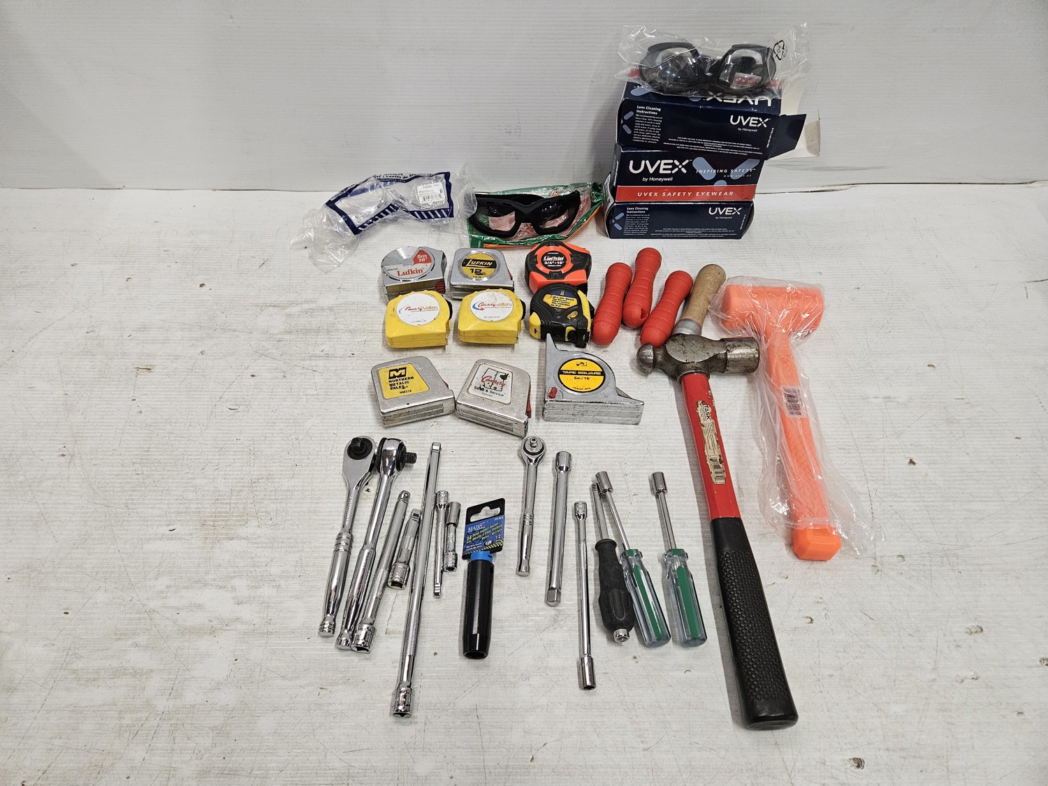 (9) tape measures, (5) unused safety glasses, (3) socket wrenches, (7) socket extensions, (2) mallet/hammer, (4) handles